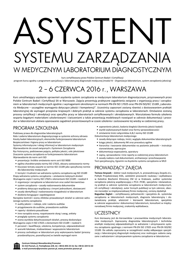 ASYSTENT SYSTEMU ZARZĄDZANIA W MEDYCZNYM LABORATORIUM DIAGNOSTYCZNYM kurs certyfikowany przez Polskie Centrum Badań i Certyfikacji program kursu zgodny z programem specjalizacji z laboratoryjnej diagnostyki medycznej (moduł IV - Organizacja laboratorium, system zarządzania jakością) 2 – 6 CZERWCA 2016 r., WARSZAWA Kurs umożliwiający uzyskanie uprawnień asystenta system zarządzania w medycznym laboratorium diagnostycznym, przyznawanych przez Polskie Centrum Badań i Certyfikacji SA w Warszawie. Zajęcia prezentują praktyczne zagadnienia związane z organizacją pracy i zarządzaniem w laboratoriach medycznych zgodnie z wymaganiami określonymi w normach PN-EN ISO 17025 oraz PN-EN ISO/IEC 15189 „Laboratoria Medyczne – szczególne wymagania dotyczące jakości i kompetencji”. Uczestnicy zapoznani zostaną również z dostosowaniem praktyki laboratoryjnej do wymagań przepisów krajowych i dobrych praktyk w zakresie systemu zarządzania w laboratoriach. Omówione zostaną procesy certyfikacji i akredytacji oraz specyfika pracy w laboratoriach certyfikowanych i akredytowanych. Warsztatowa formuła szkolenia wsparta bogatymi materiałami szkoleniowymi i ćwiczeniami a także prezentacją modelowych rozwiązań w zakresie dokumentacji i procedur w laboratorium ułatwia opanowanie zagadnień prezentowanych w czasie szkolenia i zastosowanie tej wiedzy w codziennej pracy. PROGRAM SZKOLENIA Podstawy prawa dla diagnostów laboratoryjnych Rola i zadania laboratorium diagnostycznego w systemie ochrony zdrowia Koszty badań laboratoryjnych; ekonomika funkcjonowania laboratorium Bezpieczeństwo i higiena pracy w laboratorium Systemy informatyczne i obieg informacji w laboratorium medycznym Wprowadzenie do zasad związanych z Systemem Zarządzania Rys historyczny, podstawowe pojęcia, polityka jakości, cele jakościowe Znaczenie systemu zarządzania w funkcjonowaniu laboratorium Wprowadzenie do norm serii ISO • prezentacja i krótkie omówienie norm serii ISO 9000 • ogólna charakterystyka normy ISO 17025, obszary zastosowania normy • kluczowe tematy zawarte w normie ISO 15189 jako specyficznej normie dla laboratoriów medycznych • korzyści i trudności we wdrażaniu systemu zarządzania wg ISO 15189 Etapy wdrażania systemu zarządzania – omówienie kolejnych działań Wymagania części I normy ISO 17025 z elementami ISO 15189 – rozdział 4 • organizacja i zarządzanie w laboratorium oraz zadań kierownictwa • system zarządzania – zasady nadzorowania dokumentów • problemy dotyczące współpracy z innymi jednostkami, dostawcami • zasady identyfikacji i nadzorowania niezgodności w laboratorium • działania korygujące i zapobiegawcze Narzędzia kontroli i oceny efektów prowadzonych działań w zakresie wdrażanego systemu zarządzania • audity jakości – rodzaje, cele i zadania auditów • przygotowanie do auditów, prowadzenie auditów • raporty i działania poauditowe • inne narzędzia oceny; rozpatrywanie skarg i uwag, ankiety • przeglądy systemu zarządzania • ocena wyników dotychczasowych działań, procesy doskonalące Wymagania części II ISO 17025 z elementami ISO 15189 – rozdział 5 • personel – kwalifikacje, szkolenia, kompetencje, odpowiedzialność • warunki lokalowe, środowiskowe i wyposażenie laboratorium • procesy zachodzące w laboratorium przy wykonywaniu badań (procesy przedanalityczne, poanalityczne) w świetle wymagań norm Centrum Edukacji Menedżerskiej Promotor 61-512 Poznań, ul. Pamiątkowa 2/8, tel. +48 61 855 23 14, fax +48 61 224 51 63 e-mail [email protected], www.promotor.poznan.pl • zapewnienie jakości, badania biegłości (kontrola jakości badań) • wyniki wykonywanych badań oraz formy sprawozdawczości • omówienie treści załączników A,B,C normy ISO 15189 Dokumentacja laboratorium medycznego • zasady dotyczące rodzaju, treści, wyglądu dokumentów laboratoryjnych • księga jakości, dokumenty NK oraz procedury ogólne • hierarchia i tworzenie dokumentów na poziomie jednostki – instrukcje stanowiskowe, operacyjne • dokumentacja wyposażenia, aparatury • zapisy, sprawozdania i inne raporty w codziennej pracy laboratorium • zasady nadzoru nad dokumentami, archiwizacja i przechowywanie Test specjalizacyjny, Egzamin na Asystenta systemu zarządzania w MLD PROWADZĄCY ZAJĘCIA Tomasz Anyszek – doktor nauk medycznych, b. przewodniczący Zespołu d.s. Polityki Projakościowej KIDL, wieloletni pracownik naukowy i wykładowca w Katedrze Biochemii Klinicznej CM UJ w Krakowie, auditor systemów zarządzania jakością współpracujący z PCA i PCBC, specjalista i doświadczony praktyk w zakresie systemów zarządzania w laboratoriach medycznych, ich certyfikacji i akredytacji, autor licznych publikacji w tym zakresie, obecnie menedżer w międzynarodowej firmie medycznej, ceniony dydaktyk Bogusław Żegleń – certyfikowany pełnomocnik i specjalista ds. systemów zarządzania w laboratoriach medycznych, diagnosta laboratoryjny i doświadczony praktyk, właściciel i kierownik laboratorium, specjalista w zakresie wyposażenia i dokumentacji laboratorium, konsultant w międzynarodowej firmie medycznej, znakomity wykładowca. UCZESTNICY Kurs kierowany jest do kierowników i pracowników medycznych laboratoriów medycznych. Zapraszamy diagnostów laboratoryjnych i techników analityki medycznej odpowiedzialnych za wdrażanie i utrzymywanie systemu zarządzania zgodnego z normami PN-EN ISO 17025 oraz PN-EN ISO/IEC 15189. Do udziału zapraszamy w szczególności osoby odbywające specjalizację z laboratoryjnej diagnostyki medycznej oraz realizujące zadania związane z wdrażaniem i utrzymywaniem systemu zarządzania w laboratorium. ASYSTENT SYSTEMU ZARZĄDZANIA W MEDYCZNYM LABORATORIUM DIAGNOSTYCZNYM CZAS I MIEJSCE KURSU Kurs odbędzie się w dniach 2 – 6 czerwca 2016 r. (czwartek – poniedziałek), w sali wykładowej Hotelu Hit, przy ul. Kłopotowskiego 33 w Warszawie. Zaj