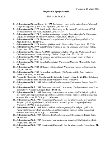 Warszawa, 25 lutego 2010 Wojciech B. Jędryczkowski SPIS PUBLIKACJI 1. Jędryczkowski W. and Fischer Z. 1973. Preliminary report on the metabolism of silver eel (Anguilla anguilla L.). Pol. Arch. Hydrobiol., 20: 507-516. 2. Jędryczkowski W. 1977. Initial results of the study on the North-West-African shelf fish food assimilation. Pol. Arch. Hydrobiol., 24: 285-287. 3. Jędryczkowski W. 1978. Dynamika sezonowego rozwoju fauny skorupiaków (Cladocera, Copepoda) drobnych zbiorników wodnych. Fragm. faun., 23: 305-314. 4. Jędryczkowski W. 1979. Elements of energy balance of eel Anguilla anguilla (L.). Pol. Arch. Hydrobiol., 26: 159-172. 5. Jędryczkowski W. 1979. Krocionogi (Diplopoda) Bieszczadów. Fragm. faun., 25: 77-94. 6. Jędryczkowski W. 1979. Synantropijne równonogi lądowe (Isopoda, Oniscoidea) Polski. Fragm. faun., 25: 95-106. 7. Jędryczkowski W., Staręga W. 1980. Bezkręgowce lądowe (Isopoda, Diplopoda, Aranei, Opiliones) rezerwatu kserotermicznego "Kulin". Fragm. faun., 25: 179-195. 8. Jędryczkowski W. 1980. Równonogi lądowe (Isopoda, Oniscoidea) skarpy wiślanej w Warszawie. Fragm. faun., 25: 317-324. 9. Jędryczkowski W. 1981. Isopods (Isopoda) of Warsaw and Mazovia. Memorabilia Zool., 34: 79-86. 10. Jędryczkowski W. 1982. Millipedes (Diplopoda) of Warsaw and Mazovia. Memorabilia Zol., 36: 253-261. 11. Jędryczkowski W. 1982. New and rare millipedes (Diplopoda, Julida) from Northern Korea. Ann. zool., 36: 375-384. 12. Pisarski B, Chudzicka E, Nowakowski E, Skibińska E, Jędryczkowski W. 1984. Rola fauny na terenach zieleni miast na przykładzie Warszawy. PWN, Warszawa. 13. Jędryczkowski W.B. 1985. Zaleszczotki (Pseudoscorpiones) Mazowsza. Fragm. faun., 29: 77-83. 14. Jędryczkowski W.B. 1985. Równonogi (Isopoda) i krocionogi (Diplopoda) rezerwatu "Las Bielański" w Warszawie. Fragm. faun., 29: 85-91. 15. Jędryczkowski W.B. 1985. Równonogi lądowe (Isopoda terrestria) Gór Świętokrzyskich. In: Fauna Gór Świętokrzyskich jej odrębności, zróŜnicowanie i wartości godne szczególnej ochrony. Warszawa, IZ PAN, p. 22. (Abstract). 16. Jędryczkowski W.B. 1985. Krocionogi (Diplopoda) Gór Świętokrzyskich. In: Fauna Gór Świętokrzyskich jej odrębności, zróŜnicowanie i wartości godne szczególnej ochrony. Warszawa, IZ PAN, p. 22. (Abstract). 17. Jędryczkowski W.B. 1985. Zaleszczotki (Pseudoscorpiones) Gór Świętokrzyskich. In: Fauna Gór Świętokrzyskich jej odrębności, zróŜnicowanie i wartości godne szczególnej ochrony. Warszawa, IZ PAN, p. 22. (Abstract). 18. Jędryczkowski W.B. 1987. Zaleszczotki (Pseudoscorpiones) Bieszczadów. Fragm. faun., 30: 341-349. 19. Jędryczkowski W.B. 1987. Równonogi lądowe (Isopoda terrestria) Gór Świętokrzyskich. Fragm. faun., 31: 79-91. 20. Jędryczkowski W.B. 1987. Krocionogi (Diplopoda) Gór Świętokrzyskich. Fragm. faun., 31: 93-109. 21. Jędryczkowski W.B. 1987. Zaleszczotki (Pseudoscorpiones) Gór Świętokrzyskich. Fragm. faun., 31: 135-157. 22. Jędryczkowski W.B. 1988. The distribution and ecology of Pseudoscorpiones in Poland. XI. Europäisches Arachnologiches Colloquium. TUB-Dokumentation Kongresse und Tagungen, Heft 38. 23. Jędryczkowski W.B. 1990. The Distribution and Ecology of the Millipedes in Poland. 8th Int. Congr. Myriapodology - Abstracts. Ver.Univ.Innsbruck. 177. 24. Jędryczkowski W.B. 1990. Krocionogi (Diplopoda), równonogi (Isopoda), zaleszczotki (Pseudoscorpiones) i kosarze (Opiliones) Roztocza. In: Fauna Roztocza. Instytut Zoologii PAN, Warszawa, s. 25-26. (Abstract). 25. Jędryczkowski W.B. 1992. The Distribution and Ecology of the Millipedes in Poland. Ber. nat.-med. Verein Innsbruck, Suppl. 10: 385-391. 26. Jędryczkowski W.B. 1992. The genus Aperittochelifer Beier, 1955, with description of a new species from South Africa (Arachnida: Pseudoscorpiones). Ann. Naturhist. Mus. Wien, 93, B: 64-67. 27. Jędryczkowski W.B. et all. 1992. List otwarty do Pani Premier Hanny Suchockiej w sprawie ochrony zwierząt dziko Ŝyjących w Polsce. Łowiec Polski, 11: 9. 28. Trojan P., Jędryczkowski W., Iwan D. 1993. Zbiory Instytutu Zoologii PAN - zasoby i program ich opracowania. Annals of the Upper Silesian Museum. Natural History., 13: 107111. 29. Jędryczkowski W.B. 1993. Synantropisation of diplopodan fauna in Poland. Abstr. 9th Congr. int. Myriap., Paris:26-31.7.93: 38, 1993. 30. Jędryczkowski W.B. 1994. Krocionogi (Diplopoda) wybranych Środowisk Roztocza. Fragm. faun., 37: 109-114. 31. Jędryczkowski W.B. 1994. Stonogi (Isopoda, Oniscoidea) Roztocza. Fragm. faun., 37: 115119. 32. Jędryczkowski W.B. 1995. Bezkręgowce lądowe (Isopoda, Diplopoda, Pseudoscorpiones, Opiliones) Pojezierza Mazurskiego. Fragm. faun., 37: 505-520. 33. Jędryczkowski W.B. 1995. Zieleń miejska jako środowisko Ŝycia. W: Miasto a środowisko przyrodnicze. Włocławek., 69-75. 34. Jędryczkowski W.B. 1996. Kosarze (Opiliones) Roztocza. Fragm. faun., 39: 15-20. 35. Jędryczkowski W.B. 1996. Zaleszczotki (Pseudoscorpiones) Roztocza. Fragm. faun., 39: 21-27. 36. Jędryczkowski W.B. 1996. Synanthropisation of the Diplopoda fauna in Poland. Mém. Mus. natn. Hist. nat., Paris, 169: 209-212. 37. Jędryczkowski W.B. 1996. Ecological factor in the distribution of Carpathian elements in Poland. 16th European Colloguium of Arachnology. Abstracts. Siedlce. p. 17. 38. Jędryczkowski W.B. 1997. Ecological factors in the distribution of Carpathian elements in Poland. Proc. 16th Europ.Coll.Arachnol. Siedlce, 127 - 131. [PDF] 39. Jędryczkowski W.B. 1998. Dzikie kaczki. Łowiec Polski, 8: 12 - 13. 40. Jędryczkowski W.B. 1998. Pseudoscorpions (Pseudoscorpionida) of Vietnam. Fragm. faun., 41: 183 - 192. 41. Jędryczkowski W.B. 1999. Zwierzęta łowne w Warszawie. Łowiec Polski, 3: 13. 42. Jędryczkowski W.B. 1999. UŜytki ekologiczne. 47-51., W: Zwierzyna drobna jako elementy bioróŜnorodności środowiska przyrodniczego. WTN, Włocławek. 2 43. Jędryczkowski W.B. 1999. Znaczenie zbiorników śródpolnych dla populacji ptak
