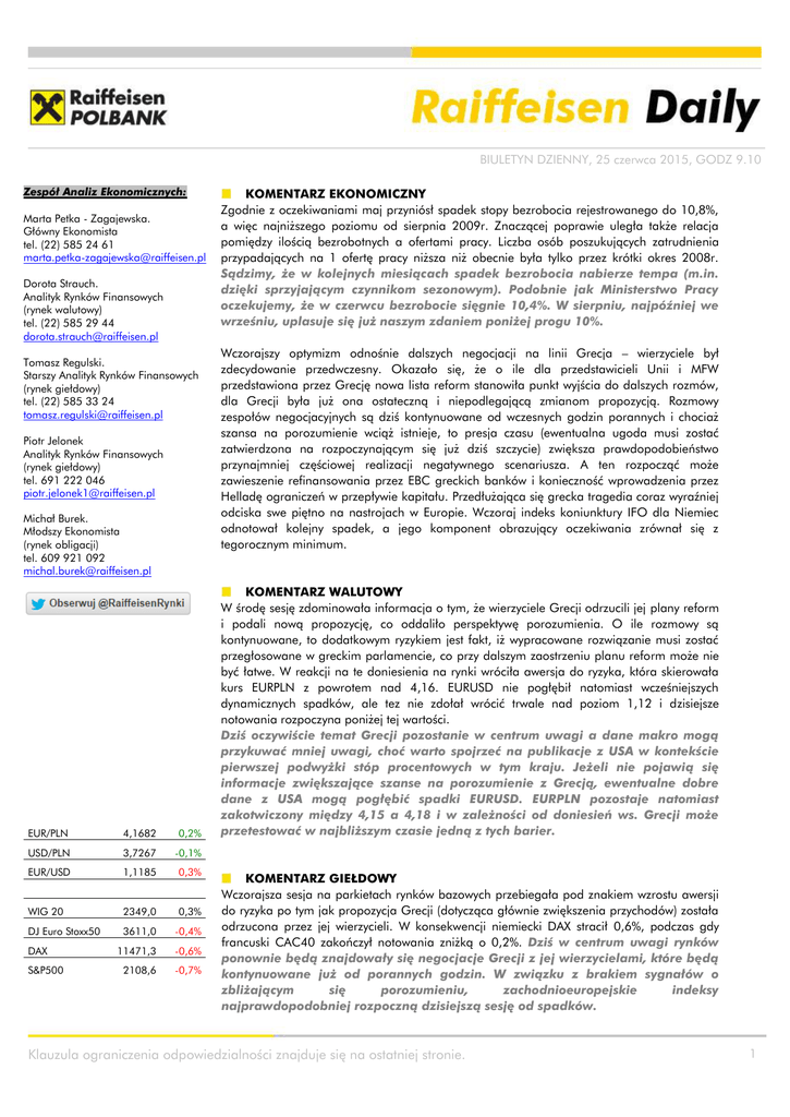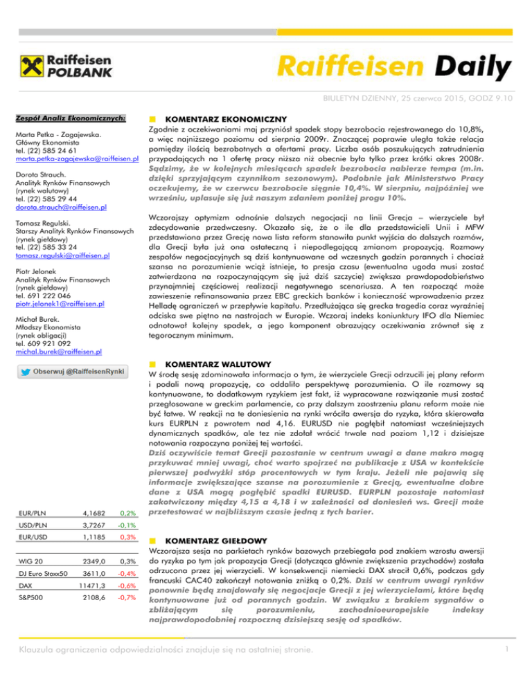 BIULETYN DZIENNY, 25 czerwca 2015, GODZ 9.10 Zespół Analiz Ekonomicznych: Marta Petka - Zagajewska. Główny Ekonomista tel. (22) 585 24 61 [email protected] Dorota Strauch. Analityk Rynków Finansowych (rynek walutowy) tel. (22) 585 29 44 [email protected] Tomasz Regulski. Starszy Analityk Rynków Finansowych (rynek giełdowy) tel. (22) 585 33 24 [email protected] Piotr Jelonek Analityk Rynków Finansowych (rynek giełdowy) tel. 691 222 046 [email protected] Michał Burek. Młodszy Ekonomista (rynek obligacji) tel. 609 921 092 [email protected] EUR/PLN 4,1682 0,2% USD/PLN 3,7267 -0,1% EUR/USD 1,1185 0,3% WIG 20 2349,0 0,3% DJ Euro Stoxx50 DAX S&P500 3611,0 -0,4% 11471,3 -0,6% 2108,6 -0,7% KOMENTARZ EKONOMICZNY Zgodnie z oczekiwaniami maj przyniósł spadek stopy bezrobocia rejestrowanego do 10,8%, a więc najniższego poziomu od sierpnia 2009r. Znaczącej poprawie uległa także relacja pomiędzy ilością bezrobotnych a ofertami pracy. Liczba osób poszukujących zatrudnienia przypadających na 1 ofertę pracy niższa niż obecnie była tylko przez krótki okres 2008r. Sądzimy, że w kolejnych miesiącach spadek bezrobocia nabierze tempa (m.in. dzięki sprzyjającym czynnikom sezonowym). Podobnie jak Ministerstwo Pracy oczekujemy, że w czerwcu bezrobocie sięgnie 10,4%. W sierpniu, najpóźniej we wrześniu, uplasuje się już naszym zdaniem poniżej progu 10%. Wczorajszy optymizm odnośnie dalszych negocjacji na linii Grecja – wierzyciele był zdecydowanie przedwczesny. Okazało się, że o ile dla przedstawicieli Unii i MFW przedstawiona przez Grecję nowa lista reform stanowiła punkt wyjścia do dalszych rozmów, dla Grecji była już ona ostateczną i niepodlegającą zmianom propozycją. Rozmowy zespołów negocjacyjnych są dziś kontynuowane od wczesnych godzin porannych i chociaż szansa na porozumienie wciąż istnieje, to presja czasu (ewentualna ugoda musi zostać zatwierdzona na rozpoczynającym się już dziś szczycie) zwiększa prawdopodobieństwo przynajmniej częściowej realizacji negatywnego scenariusza. A ten rozpocząć może zawieszenie refinansowania przez EBC greckich banków i konieczność wprowadzenia przez Helladę ograniczeń w przepływie kapitału. Przedłużająca się grecka tragedia coraz wyraźniej odciska swe piętno na nastrojach w Europie. Wczoraj indeks koniunktury IFO dla Niemiec odnotował kolejny spadek, a jego komponent obrazujący oczekiwania zrównał się z tegorocznym minimum. KOMENTARZ WALUTOWY W środę sesję zdominowała informacja o tym, że wierzyciele Grecji odrzucili jej plany reform i podali nową propozycję, co oddaliło perspektywę porozumienia. O ile rozmowy są kontynuowane, to dodatkowym ryzykiem jest fakt, iż wypracowane rozwiązanie musi zostać przegłosowane w greckim parlamencie, co przy dalszym zaostrzeniu planu reform może nie być łatwe. W reakcji na te doniesienia na rynki wróciła awersja do ryzyka, która skierowała kurs EURPLN z powrotem nad 4,16. EURUSD nie pogłębił natomiast wcześniejszych dynamicznych spadków, ale tez nie zdołał wrócić trwale nad poziom 1,12 i dzisiejsze notowania rozpoczyna poniżej tej wartości. Dziś oczywiście temat Grecji pozostanie w centrum uwagi a dane makro mogą przykuwać mniej uwagi, choć warto spojrzeć na publikacje z USA w kontekście pierwszej podwyżki stóp procentowych w tym kraju. Jeżeli nie pojawią się informacje zwiększające szanse na porozumienie z Grecją, ewentualne dobre dane z USA mogą pogłębić spadki EURUSD. EURPLN pozostaje natomiast zakotwiczony między 4,15 a 4,18 i w zależności od doniesień ws. Grecji może przetestować w najbliższym czasie jedną z tych barier. KOMENTARZ GIEŁDOWY Wczorajsza sesja na parkietach rynków bazowych przebiegała pod znakiem wzrostu awersji do ryzyka po tym jak propozycja Grecji (dotycząca głównie zwiększenia przychodów) została odrzucona przez jej wierzycieli. W konsekwencji niemiecki DAX stracił 0,6%, podczas gdy francuski CAC40 zakończył notowania zniżką o 0,2%. Dziś w centrum uwagi rynków ponownie będą znajdowały się negocjacje Grecji z jej wierzycielami, które będą kontynuowane już od porannych godzin. W związku z brakiem sygnałów o zbliżającym się porozumieniu, zachodnioeuropejskie indeksy najprawdopodobniej rozpoczną dzisiejszą sesję od spadków. Klauzula ograniczenia odpowiedzialności znajduje się na ostatniej stronie. 1 BIULETYN DZIENNY, 25 czerwca 2015, GODZ 9.10 W trakcie wczorajszej sesji skala spadków obserwowana w notowaniach warszawskich indeksów była wyraźnie mniejsza od tej obserwowanej na zachodzie Europy – sWIG80 oraz mWIG40 straciły odpowiednio 0,4% oraz 0,5%, podczas gdy indeks polskich blue chipów w ostatniej godzinie odrobił wcześniejszą zniżkę i w konsekwencji zakończył dzień zwyżką o 0,3%. W najbliższym czasie w oczekiwaniu na doniesienia ws. Grecji indeks WIG20 powinien stabilizować się ponad poziomem 2300pkt., jednak jeżeli w najbliższym czasie pojawią się pozytywne sygnały w tej sprawie powinien on powrócić do dynamicznych wzrostów. 2 Klauzula ograniczenia odpowiedzialności znajduje się na ostatniej stronie. BIULETYN DZIENNY, 25 czerwca 2015, GODZ 9.10 Stan na początek dnia Waluty Zamkn. Zmiana % Zmiana % 5 sesji Wyniki sesji: Polska Zamkn. Zmiana % Zmiana % 5 sesji obroty (w tys PLN) EUR/PLN 4,1682 4,1709 0,21% 0,42% WIG 54114,4 0,18% 1,71% 597 807,50 USD/PLN 3,7267 3,7224 -0,11% 1,60% WIG 20 2349,0 0,33% 1,19% 494 392,31 CHF/PLN 3,9833 3,9855 -0,12% 0,30% WIG 30 2574,3 0,22% 1,32% 516 568,19 EUR/USD 1,1185 1,1205 0,34% -1,16% mWIG40 3756,3 -0,53% 1,57% 72 350,68 GBP/PLN 5,8475 5,8457 -0,27% 0,77% sWIG80 13143,6 -0,41% -0,27% 43 134,68 WIG Banki 7444,8 0,31% 2,32% 173 588,59 *Zamkniecie z poprzedniego dnia z godziny 22:00 FIXINGI Wartość Zmiana (pb) 1M Wibor fixing 1,66 - 3M Wibor fixing 1,72 - 1,79 - 6M Wibor fixing *Fixing z dnia poprzedniego FIXING NBP Wartość WIG Telkom 996,3 0,60% 0,85% 10 842,4