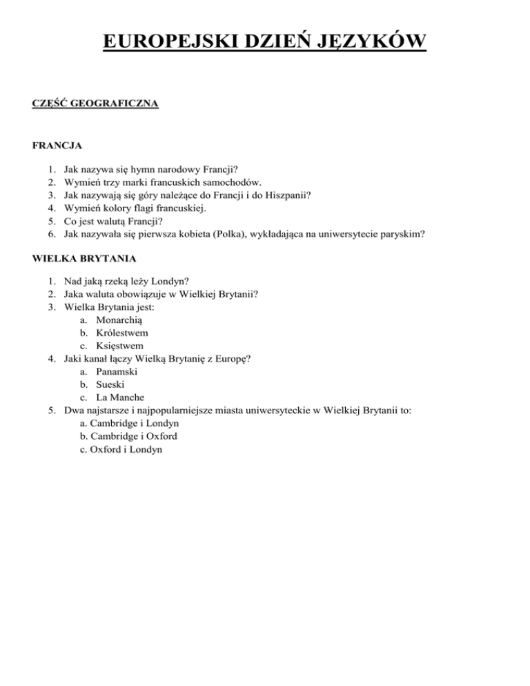 EUROPEJSKI DZIEŃ JĘZYKÓW CZĘŚĆ GEOGRAFICZNA FRANCJA 1. 2. 3. 4. 5. 6. Jak nazywa się hymn narodowy Francji? Wymień trzy marki francuskich samochodów. Jak nazywają się góry należące do Francji i do Hiszpanii? Wymień kolory flagi francuskiej. Co jest walutą Francji? Jak nazywała się pierwsza kobieta (Polka), wykładająca na uniwersytecie paryskim? WIELKA BRYTANIA 1. Nad jaką rzeką leży Londyn? 2. Jaka waluta obowiązuje w Wielkiej Brytanii? 3. Wielka Brytania jest: a. Monarchią b. Królestwem c. Księstwem 4. Jaki kanał łączy Wielką Brytanię z Europę? a. Panamski b. Sueski c. La Manche 5. Dwa najstarsze i najpopularniejsze miasta uniwersyteckie w Wielkiej Brytanii to: a. Cambridge i Londyn b. Cambridge i Oxford c. Oxford i Londyn 1. Przyporządkuj opisy rysunkom: 1. 2. 3. A. - jest to nazwa ważącego 14 ton dzwonu umieszczonego na szczycie 106 metrowej wieży. Uważany jest on za symbol Wielkiej Brytanii. Dzwon ten zawisa na jednej z dwóch wież londyńskiego parlamentu. Zegar ten jest największym zegarem w Wielkiej Brytanii. Wyposażony jest on w cztery tarcze o średnicy 7,5 m każda oraz we wskazówki o długości 4,25 m. B.- powstała w latach 1887-9, ma wysokość 300 m, koszt jej budowy to 1,5 miliona dolarów. Budowla składa się z ponad 18000 elementów połączonych ze sobą ponad 2,5 milionami nitów i waży około 10500 ton. Wieża jest odmalowywana co 7 lat, zużywa się na to 50 ton ciemno-brązowej farby. Od czasu otwarcia budowli do dziś wieżę odwiedziło ponad 167 milionów ludzi. Corocznie budowla przyciąga 3 miliony ludzi. C. zabytkowa budowla jest jednym z charakterystycznych punktów miasta jako symbol Pokoju i Wolności od 3 października 1990 NIEMCY 2. O jakim mieście mowa? Miasto leżące nad Menem. Tu urodził się wielki niemiecki poeta Johann Wolfgang Goethe. Na obrzeżu miasta znajduje się jeden z największych portów lotniczych w Europie. a) Frankfurt b) Kolonia c) Düsseldorf 3. Z ilu landów (krajów związkowych) składają się Niemcy? a) 13 b) 16 c) 9 CZĘŚĆ JĘZYKOWA 1. Ile języków urzędowych obowiązuje w Unii Eropejskiej? a) 23 b) 27 c) 15 2. Jakie są języki robocze (proceduralne) stosowane w Unii Europejskiej? a) Angielski, francuski i niemiecki b) Angielski i francuski c) Angielski, niemiecki, francuski i hiszpański 3. Ile języków urzędowych jest w Hiszpanii? a) 1 b) 2 c) 4 4. Który kraj Unii Europejskiej jest krajem najbardziej wielojęzycznym? a) Luksemburg b) Słowacja c) Łotwa 5. Które z krajów członkowskich Unii Europejskiej konstytucyjnie uznały migowe odpowiedniki języków krajowych? a) Francja, Finlandia i Hiszpania b) Finlandia, Hiszpania, Portugalia i Austria c) Portugalia, Finlandia i Austria 6. W którym europejskim kraju nie istnieje obowiązek szkolny nauki języka obcego? a) we Francji b) w Hiszpanii c) w Irlandii 7. W ilu krajach europejskich język włoski jest językiem urzędowym? a) 2 b) 4 c) 5 8. Które z wymienionych języków zostały uznane za języki urzędowe Unii Europejskiej najpóźniej? a) irlandzki b) rumuński i bułgarski c) wszystkie trzy 9. Ile jest języków na świecie? a) ok. 200 b) ok. 500 c) ok. 6000 d) ok. 2000 10. Językiem którego z tych krajów mówi na co dzień więcej ludzi poza jego granicami niż w nim samym? a) niemieckim b) portugalskim c) polskim d) rosyjskim 11. Kto był twórcą języka esperanto? a) Ferdinand de Saussure b) Ludwik Zamenhof c) J. R. R. Tolkien d) Noam Chomsky 12. Który z poniższych języków nie jest językiem słowiańskim? a) białoruski b) słoweński c) łotewski d) serbski 13. Jakim językiem mówi jako ojczystym najwięcej ludzi na świecie? a) angielskim b) chińskim c) hiszpańskim d) rosyjskim