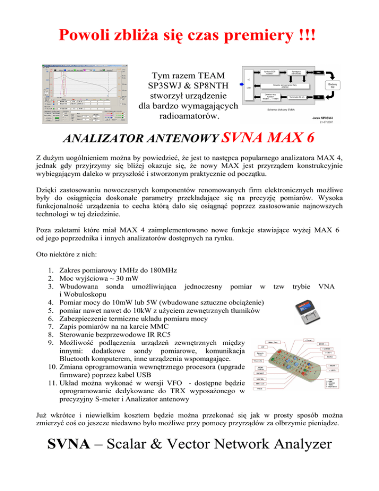 Powoli zbliża się czas premiery !!! Tym razem TEAM SP3SWJ & SP8NTH stworzył urządzenie dla bardzo wymagających radioamatorów. ANALIZATOR ANTENOWY SVNA MAX 6 Z dużym uogólnieniem można by powiedzieć, że jest to następca popularnego analizatora MAX 4, jednak gdy przyjrzymy się bliżej okazuje się, że nowy MAX jest przyrządem konstrukcyjnie wybiegającym daleko w przyszłość i stworzonym praktycznie od początku. Dzięki zastosowaniu nowoczesnych komponentów renomowanych firm elektronicznych możliwe były do osiągnięcia doskonałe parametry przekładające się na precyzję pomiarów. Wysoka funkcjonalność urządzenia to cecha którą dało się osiągnąć poprzez zastosowanie najnowszych technologi w tej dziedzinie. Poza zaletami które miał MAX 4 zaimplementowano nowe funkcje stawiające wyżej MAX 6 od jego poprzednika i innych analizatorów dostępnych na rynku. Oto niektóre z nich: 1. Zakres pomiarowy 1MHz do 180MHz 2. Moc wyjściowa ~ 30 mW 3. Wbudowana sonda umożliwiająca jednoczesny pomiar w i Wobuloskopu 4. Pomiar mocy do 10mW lub 5W (wbudowane sztuczne obciążenie) 5. pomiar nawet nawet do 10kW z użyciem zewnętrznych tłumików 6. Zabezpieczenie termiczne układu pomiaru mocy 7. Zapis pomiarów na na karcie MMC 8. Sterowanie bezprzewodowe IR RC5 9. Możliwość podłączenia urządzeń zewnętrznych między innymi: dodatkowe sondy pomiarowe, komunikacja Bluetooth komputerem, inne urządzenia wspomagające. 10. Zmiana oprogramowania wewnętrznego procesora (upgrade firmware) poprzez kabel USB 11. Układ można wykonać w wersji VFO - dostępne będzie oprogramowanie dedykowane do TRX wyposażonego w precyzyjny S-meter i Analizator antenowy tzw trybie VNA Już wkrótce i niewielkim kosztem będzie można przekonać się jak w prosty sposób można zmierzyć coś co jeszcze niedawno było możliwe przy pomocy przyrządów za olbrzymie pieniądze. SVNA – Scalar & Vector Network Analyzer