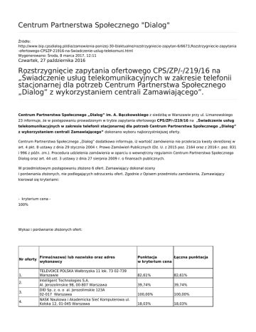 Centrum Partnerstwa Społecznego "Dialog" Źródło: http://www.bip.cpsdialog.pl/dia/zamowienia-ponizej-30-0/aktualne/rozstrzygniecie-zapytan-6/6673,Rozstrzygniecie-zapytania -ofertowego-CPSZP-21916-na-Swiadczenie-uslug-telekomuni.html Wygenerowano: Środa, 8 marca 2017, 12:11 Czwartek, 27 października 2016 Rozstrzygnięcie zapytania ofertowego CPS/ZP/-/219/16 na „Świadczenie usług telekomunikacyjnych w zakresie telefonii stacjonarnej dla potrzeb Centrum Partnerstwa Społecznego „Dialog” z wykorzystaniem centrali Zamawiającego”. Centrum Partnerstwa Społecznego „Dialog” im. A. Bączkowskiego z siedzibą w Warszawie przy ul. Limanowskiego 23 informuje, że w postępowaniu prowadzonym w trybie zapytania ofertowego CPS/ZP/-/219/16 na „Świadczenie usług telekomunikacyjnych w zakresie telefonii stacjonarnej dla potrzeb Centrum Partnerstwa Społecznego „Dialog” z wykorzystaniem centrali Zamawiającego” dokonano wyboru najkorzystniejszej oferty. Centrum Partnerstwa Społecznego „Dialog” dodatkowo informuje, iż wartość zamówienia nie przekracza kwoty określonej w art. 4 pkt. 8 ustawy z dnia 29 stycznia 2004 r. Prawo Zamówień Publicznych (Dz. U. z 2015 poz. 2164 oraz z 2016 r. poz. 831 i 996 z późn. zm.). Procedura udzielenia zamówienia w oparciu o wewnętrzny regulamin Centrum Partnerstwa Społecznego Dialog oraz art. 44 ust. 3 ustawy z dnia 27 sierpnia 2009 r. o finansach publicznych. W przedmiotowym postępowaniu złożono 6 ofert. Zamawiający dokonał oceny i porównania złożonych, nie podlegających odrzuceniu ofert. Zgodnie z Opisem przedmiotu zamówienia, Zamawiający kierował się kryteriami: - kryterium cena 100% Wykaz i porównanie złożonych ofert: Nr oferty 1. 2. 3. 4. Firma(nazwa) lub nazwisko oraz adres wykonawcy TELEVOICE POLSKA Wałbrzyska 11 lok. 73 02-739 Warszawie Intelligent Technologies S.A. Al. Jerozolimskie 98, 00-807 Warszawa DID Sp. z. o. o al. Jerozolimskie 123A 02-017 Warszawa NASK Naukowa i Akademicka Sieć Komputerowa ul. Kolska 12, 01-045 Warszawa Punktacja Łączna punktacja w kryterium cena 82,61% 82,61% 39,74% 39,74% 100,00% 100,00% 18,03% 18,03% Na podstawie oceny spełnienia warunków udziału w postępowaniu oraz kryteriów oceny ofert ustalono, iż oferta firmy DID Sp. z. o. o z siedzibą przy al. Jerozolimskie 123A 02-017 Warszawa odpowiada wszystkim wymaganiom określonym przez Zamawiającego i została oceniona jako najkorzystniejsza. Przedmiotowe zamówienie zostanie udzielone firmie DID Sp. z. o. o z siedzibą przy al. Jerozolimskie 123A 02-017 Warszawa. Z wybranym Wykonawcą zostanie podpisana umowa. Metadane Data publikacji 27.10.2016 Rejestr zmian Podmiot udostępniający informację: Centrum Partnerstwa Społecznego "Dialog" Osoba wytwarzająca/odpowiadająca za informację: Osoba udostępniająca informację: Dorota Boratyńska Osoba modyfikująca informację: