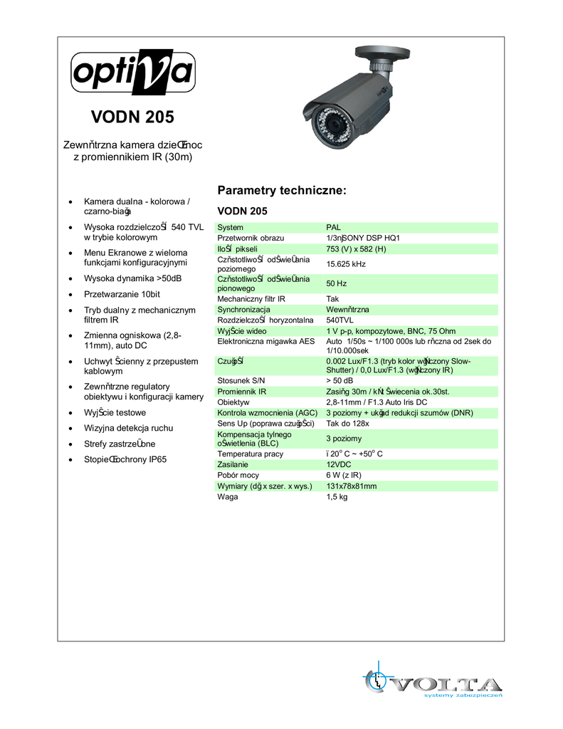 VODN 205 Zewnętrzna kamera dzień/noc z promiennikiem IR (30m) · Parametry techniczne: Kamera dualna - kolorowa / czarno-biała · Wysoka rozdzielczość 540 TVL w trybie kolorowym · Menu Ekranowe z wieloma funkcjami konfiguracyjnymi · Wysoka dynamika >50dB · Przetwarzanie 10bit · Tryb dualny z mechanicznym filtrem IR · Zmienna ogniskowa (2,811mm), auto DC · Uchwyt ścienny z przepustem kablowym · Zewnętrzne regulatory obiektywu i konfiguracji kamery · Wyjście testowe · Wizyjna detekcja ruchu · Strefy zastrzeżone · Stopień ochrony IP65 VODN 205 System Przetwornik obrazu Ilość pikseli Częstotliwość odświeżania poziomego Częstotliwość odświeżania pionowego Mechaniczny filtr IR Synchronizacja Rozdzielczość horyzontalna Wyjście wideo Elektroniczna migawka AES Czułość Stosunek S/N Promiennik IR Obiektyw Kontrola wzmocnienia (AGC) Sens Up (poprawa czułości) Kompensacja tylnego oświetlenia (BLC) Temperatura pracy Zasilanie Pobór mocy Wymiary (dł. x szer. x wys.) Waga PAL 1/3″ SONY DSP HQ1 753 (V) x 582 (H) 15.625 kHz 50 Hz Tak Wewnętrzna 540TVL 1 V p-p, kompozytowe, BNC, 75 Ohm Auto 1/50s ~ 1/100 000s lub ręczna od 2sek do 1/10.000sek 0.002 Lux/F1.3 (tryb kolor włączony SlowShutter) / 0,0 Lux/F1.3 (włączony IR) > 50 dB Zasięg 30m / kąt świecenia ok.30st. 2,8-11mm / F1.3 Auto Iris DC 3 poziomy + układ redukcji szumów (DNR) Tak do 128x 3 poziomy o o –20 C ~ +50 C 12VDC 6 W (z IR) 131x78x81mm 1,5 kg