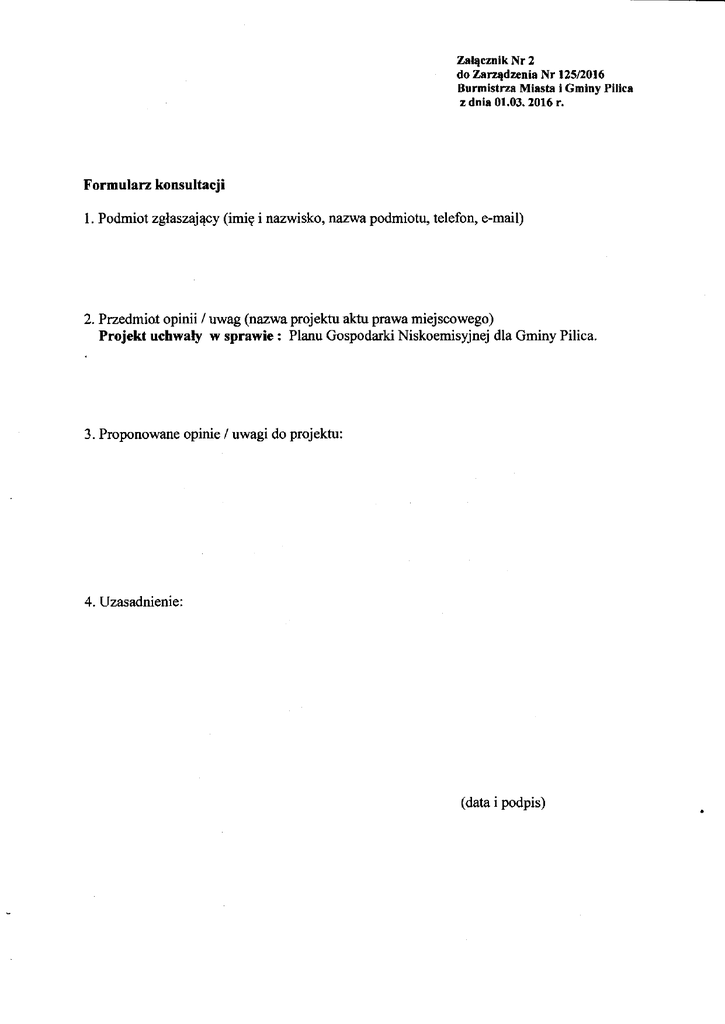 Załącznik Nr 2 do Zarządzenia Nr 125/2016 Burmistrza Miasta i Gminy Pilica z dnia 01.03. 2016 r. Formularz konsultacji 1. Podmiot zgłaszający (imię i nazwisko, nazwa podmiotu, telefon, e-mail) 2. Przedmiot opinii / uwag (nazwa projektu aktu prawa miejscowego) Projekt uchwały w sprawie : Planu Gospodarki Niskoemisyjnej dla Gminy Pilica. 3. Proponowane opinie / uwagi do projektu: 4. Uzasadnienie: (data i podpis)