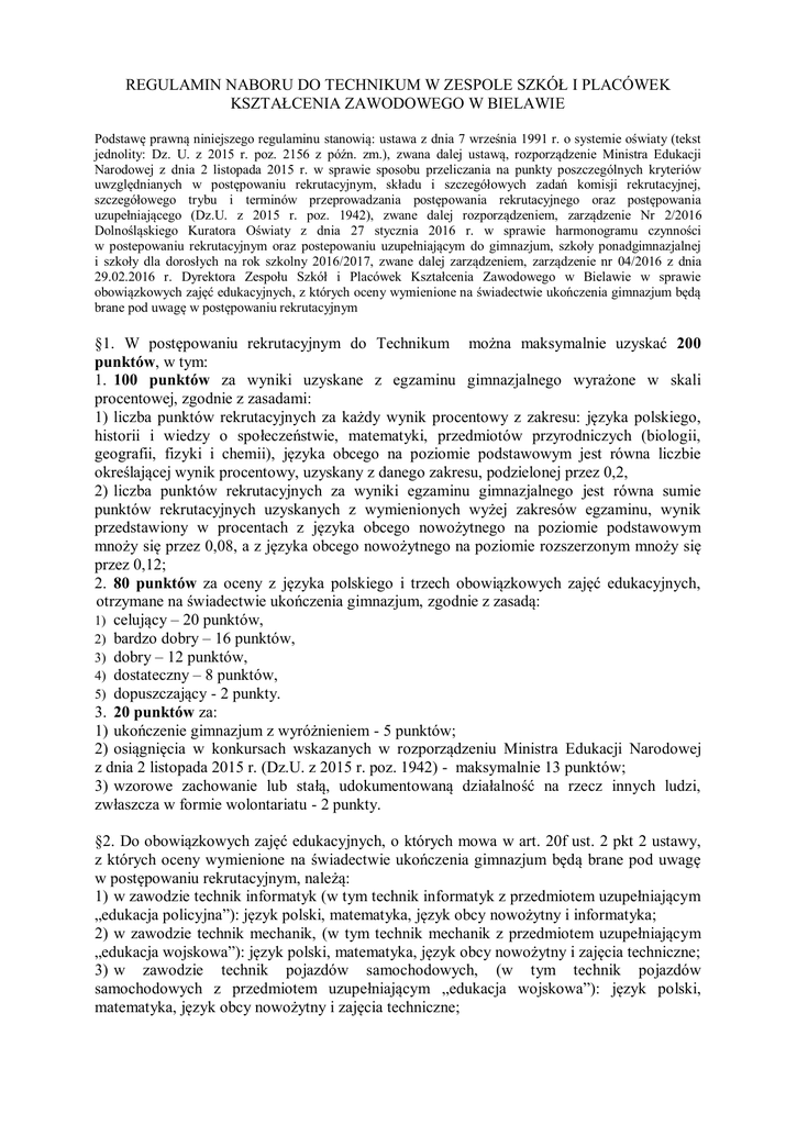 REGULAMIN NABORU DO TECHNIKUM W ZESPOLE SZKÓŁ I PLACÓWEK KSZTAŁCENIA ZAWODOWEGO W BIELAWIE Podstawę prawną niniejszego regulaminu stanowią: ustawa z dnia 7 września 1991 r. o systemie oświaty (tekst jednolity: Dz. U. z 2015 r. poz. 2156 z późn. zm.), zwana dalej ustawą, rozporządzenie Ministra Edukacji Narodowej z dnia 2 listopada 2015 r. w sprawie sposobu przeliczania na punkty poszczególnych kryteriów uwzględnianych w postępowaniu rekrutacyjnym, składu i szczegółowych zadań komisji rekrutacyjnej, szczegółowego trybu i terminów przeprowadzania postępowania rekrutacyjnego oraz postępowania uzupełniającego (Dz.U. z 2015 r. poz. 1942), zwane dalej rozporządzeniem, zarządzenie Nr 2/2016 Dolnośląskiego Kuratora Oświaty z dnia 27 stycznia 2016 r. w sprawie harmonogramu czynności w postepowaniu rekrutacyjnym oraz postepowaniu uzupełniającym do gimnazjum, szkoły ponadgimnazjalnej i szkoły dla dorosłych na rok szkolny 2016/2017, zwane dalej zarządzeniem, zarządzenie nr 04/2016 z dnia 29.02.2016 r. Dyrektora Zespołu Szkół i Placówek Kształcenia Zawodowego w Bielawie w sprawie obowiązkowych zajęć edukacyjnych, z których oceny wymienione na świadectwie ukończenia gimnazjum będą brane pod uwagę w postępowaniu rekrutacyjnym §1. W postępowaniu rekrutacyjnym do Technikum można maksymalnie uzyskać 200 punktów, w tym: 1. 100 punktów za wyniki uzyskane z egzaminu gimnazjalnego wyrażone w skali procentowej, zgodnie z zasadami: 1) liczba punktów rekrutacyjnych za każdy wynik procentowy z zakresu: języka polskiego, historii i wiedzy o społeczeństwie, matematyki, przedmiotów przyrodniczych (biologii, geografii, fizyki i chemii), języka obcego na poziomie podstawowym jest równa liczbie określającej wynik procentowy, uzyskany z danego zakresu, podzielonej przez 0,2, 2) liczba punktów rekrutacyjnych za wyniki egzaminu gimnazjalnego jest równa sumie punktów rekrutacyjnych uzyskanych z wymienionych wyżej zakresów egzaminu, wynik przedstawiony w procentach z języka obcego nowożytnego na poziomie podstawowym mnoży się przez 0,08, a z języka obcego nowożytnego na poziomie rozszerzonym mnoży się przez 0,12; 2. 80 punktów za oceny z języka polskiego i trzech obowiązkowych zajęć edukacyjnych, otrzymane na świadectwie ukończenia gimnazjum, zgodnie z zasadą: 1) celujący – 20 punktów, 2) bardzo dobry – 16 punktów, 3) dobry – 12 punktów, 4) dostateczny – 8 punktów, 5) dopuszczający - 2 punkty. 3. 20 punktów za: 1) ukończenie gimnazjum z wyróżnieniem - 5 punktów; 2) osiągnięcia w konkursach wskazanych w rozporządzeniu Ministra Edukacji Narodowej z dnia 2 listopada 2015 r. (Dz.U. z 2015 r. poz. 1942) - maksymalnie 13 punktów; 3) wzorowe zachowanie lub stałą, udokumentowaną działalność na rzecz innych ludzi, zwłaszcza w formie wolontariatu - 2 punkty. §2. Do obowiązkowych zajęć edukacyjnych, o których mowa w art. 20f ust. 2 pkt 2 ustawy, z których oceny wymienione na świadectwie ukończenia gimnazjum będą brane pod uwagę w postępowaniu rekrutacyjnym, należą: 1) w zawodzie technik informatyk (w tym technik informatyk z przedmiotem uzupełniającym „edukacja policyjna”): język polski, matematyka, język obcy nowożytny i informatyka; 2) w zawodzie technik mechanik, (w tym technik mechanik z przedmiotem uzupełniającym „edukacja wojskowa”): język polski, matematyka, język obcy nowożytny i zajęcia techniczne; 3) w zawodzie technik pojazdów samochodowych, (w tym technik pojazdów samochodowych z przedmiotem uzupełniającym „edukacja wojskowa”): język polski, matematyka, język obcy nowożytny i zajęcia techniczne; 4) w zawodzie technik budownictwa: język polski, matematyka, język obcy nowożytny i zajęcia techniczne; 5) w zawodzie technik urządzeń i systemów energetyki odnawialnej: język polski, matematyka, język obcy nowożytny i zajęcia techniczne; 6) w zawodzie fototechnik: języka polski, matematyka, informatyka i plastyka. §3. Terminy związane z rekrutacją: 1. Od 1 czerwca 2016 r. do 23 czerwca 2016 r. składanie przez kandydatów dokumentów do poszczególnych klas. 2. Od 24 czerwca 2016 r. do 28 czerwca 2016 r. złożenie kopii świadectwa, kopii zaświadczenia o wyniku egzaminu gimnazjalnego oraz innych wymaganych dokumentów. 3. 15 lipca 2016 r. ogłoszenie list kandydatów zakwalifikowanych do szkoły. 4. Od 15 lipca 2016 r. do 26 lipca 2016 r. potwierdzenie woli podjęcia nauki w szkole, poprzez złożenie w niej oryginałów dokumentów. 5. 27 lipca 2016 r. ogłoszenie list uczniów przyjętych do poszczególnych szkół oraz list wolnych miejsc. 6. Od 27 lipca 2016 r. do 31 sierpnia 2016 r. trwa ewentualna rekrutacja uzupełniająca. § 4. Dokumenty rekrutacyjne: 1. Kandydat ubiegający się o przyjęcie do szkoły składa wniosek, który jest wydrukiem z aplikacji rekrutacji elektronicznej obowiązującej w powiecie dzierżoniowskim. 2. Szkoła nanosi pieczęć wpływu na pierwszej stronie wniosku. 3. Kandydaci ubiegający się o przyjęcie do Technikum powinni dostarczyć do szkoły zaświadczenie lekarskie o braku przeciwwskazań zdrowotnych do kształcenia w określonym zawodzie. 4. Pozostałe dokumenty: 1) świadectwo ukończenia szkoły; 2) zaświadczenie o wyniku egzaminu gimnazjalnego; 3) dokumenty świadczące o szczególnej sytuacji ucznia, która daje mu pierwszeństwo w przyjęciu do szkoły w przypadku równorzędnych wyników. Dotyczy: sierot, osób przebywających w placówkach opiekuńczo – wychowawczych oraz osób umieszczonych w rodzinach zastępczych, kandydatów o ukierunkowanych i udokumentowanych zdolnościach, którym ustalono indywidualny program lub tok nauki, kandydatów z problemami zdrowotnymi, ograniczającymi możliwości wyboru kierunku kształcenia ze względu na stan zdrowia, potwierdzonymi opinią publicznej poradni psychologiczno – pedagogicznej, w tym publicznej poradni specjalistycznej; 4) dyplomy lub zaświadc