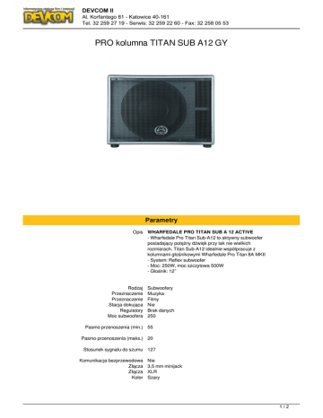 DEVCOM II Al. Korfantego 81 - Katowice 40-161 Tel. 32 259 27 19 - Serwis: 32 259 22 60 - Fax: 32 258 05 53 PRO kolumna TITAN SUB A12 GY Parametry Opis WHARFEDALE PRO TITAN SUB A 12 ACTIVE - Wharfedale Pro Titan Sub-A12 to aktywny subwoofer posiadający potężny dźwięk przy tak nie wielkich rozmiarach. Titan Sub-A12 idealnie współpracuje z kolumnami głośnikowymi Wharfedale Pro Titan 8A MKII - System: Reflex subwoofer - Moc: 250W, moc szczytowa 500W - Głośnik: 12” Rodzaj Przeznaczenie Przeznaczenie Stacja dokująca Regulatory Moc subwoofera Subwoofery Muzyka Filmy Nie Brak danych 250 Pasmo przenoszenia (min.) 55 Pasmo przenoszenia (maks.) 20 Stosunek sygnału do szumu 127 Komunikacja bezprzewodowa Złącza Złącza Kolor Nie 3,5 mm minijack XLR Szary 1/2 DEVCOM II Al. Korfantego 81 - Katowice 40-161 Tel. 32 259 27 19 - Serwis: 32 259 22 60 - Fax: 32 258 05 53 Wymiary 360 x 493 x 431 mm. Waga 22 Pozostałe parametry - Wbudowane uchwyty + otwór na górze - Materiał: 15mm MDF 2/2 Powered by TCPDF (www.tcpdf.org)