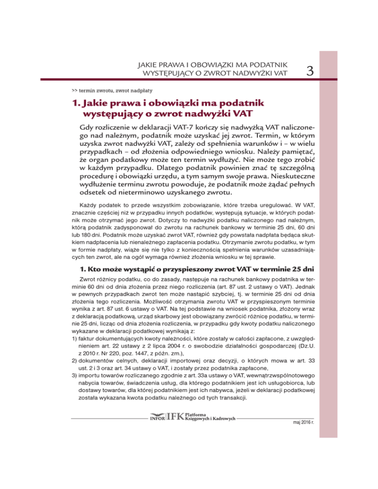 JAKIE PRAWA I OBOWIĄZKI MA PODATNIK WYSTĘPUJĄCY O ZWROT NADWYŻKI VAT 3 >> termin zwrotu, zwrot nadpłaty 1. Jakie prawa i obowiązki ma podatnik występujący o zwrot nadwyżki VAT Gdy rozliczenie w deklaracji VAT-7 kończy się nadwyżką VAT naliczonego nad należnym, podatnik może uzyskać jej zwrot. Termin, w którym uzyska zwrot nadwyżki VAT, zależy od spełnienia warunków i – w wielu przypadkach – od złożenia odpowiedniego wniosku. Należy pamiętać, że organ podatkowy może ten termin wydłużyć. Nie może tego zrobić w każdym przypadku. Dlatego podatnik powinien znać tę szczególną procedurę i obowiązki urzędu, a tym samym swoje prawa. Nieskuteczne wydłużenie terminu zwrotu powoduje, że podatnik może żądać pełnych odsetek od nieterminowo uzyskanego zwrotu. Każdy podatek to przede wszystkim zobowiązanie, które trzeba uregulować. W VAT, znacznie częściej niż w przypadku innych podatków, występują sytuacje, w których podatnik może otrzymać jego zwrot. Dotyczy to nadwyżki podatku naliczonego nad należnym, którą podatnik zadysponował do zwrotu na rachunek bankowy w terminie 25 dni, 60 dni lub 180 dni. Podatnik może uzyskać zwrot VAT, również gdy powstała nadpłata będąca skutkiem nadpłacenia lub nienależnego zapłacenia podatku. Otrzymanie zwrotu podatku, w tym w formie nadpłaty, wiąże się nie tylko z koniecznością spełnienia warunków uzasadniających ten zwrot, ale na ogół wymaga również złożenia wniosku w tej sprawie. 1. Kto może wystąpić o przyspieszony zwrot VAT w terminie 25 dni Zwrot różnicy podatku, co do zasady, następuje na rachunek bankowy podatnika w terminie 60 dni od dnia złożenia przez niego rozliczenia (art. 87 ust. 2 ustawy o VAT). Jednak w pewnych przypadkach zwrot ten może nastąpić szybciej, tj. w terminie 25 dni od dnia złożenia tego rozliczenia. Możliwość otrzymania zwrotu VAT w przyspieszonym terminie wynika z art. 87 ust. 6 ustawy o VAT. Na tej podstawie na wniosek podatnika, złożony wraz z deklaracją podatkową, urząd skarbowy jest obowiązany zwrócić różnicę podatku, w terminie 25 dni, licząc od dnia złożenia rozliczenia, w przypadku gdy kwoty podatku naliczonego wykazane w deklaracji podatkowej wynikają z: 1) faktur dokumentujących kwoty należności, które zostały w całości zapłacone, z uwzględnieniem art. 22 ustawy z 2 lipca 2004 r. o swobodzie działalności gospodarczej (Dz.U. z 2010 r. Nr 220, poz. 1447, z późn. zm.), 2) dokumentów celnych, deklaracji importowej oraz decyzji, o których mowa w art. 33 ust. 2 i 3 oraz art. 34 ustawy o VAT, i zostały przez podatnika zapłacone, 3) importu towarów rozliczanego zgodnie z art. 33a ustawy o VAT, wewnątrzwspólnotowego nabycia towarów, świadczenia usług, dla którego podatnikiem jest ich usługobiorca, lub dostawy towarów, dla której podatnikiem jest ich nabywca, jeżeli w deklaracji podatkowej została wykazana kwota podatku należnego od tych transakcji. IFK maj 2016 r.