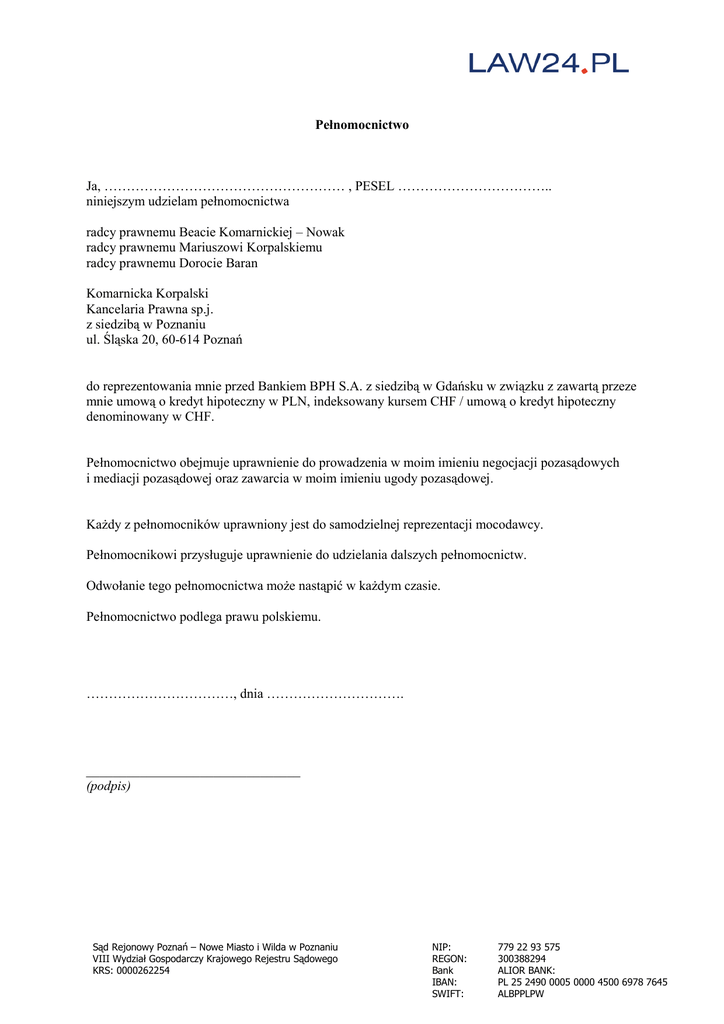 Pełnomocnictwo Ja, ……………………………………………… , PESEL …………………………….. niniejszym udzielam pełnomocnictwa radcy prawnemu Beacie Komarnickiej – Nowak radcy prawnemu Mariuszowi Korpalskiemu radcy prawnemu Dorocie Baran Komarnicka Korpalski Kancelaria Prawna sp.j. z siedzibą w Poznaniu ul. Śląska 20, 60-614 Poznań do reprezentowania mnie przed Bankiem BPH S.A. z siedzibą w Gdańsku w związku z zawartą przeze mnie umową o kredyt hipoteczny w PLN, indeksowany kursem CHF / umową o kredyt hipoteczny denominowany w CHF. Pełnomocnictwo obejmuje uprawnienie do prowadzenia w moim imieniu negocjacji pozasądowych i mediacji pozasądowej oraz zawarcia w moim imieniu ugody pozasądowej. Każdy z pełnomocników uprawniony jest do samodzielnej reprezentacji mocodawcy. Pełnomocnikowi przysługuje uprawnienie do udzielania dalszych pełnomocnictw. Odwołanie tego pełnomocnictwa może nastąpić w każdym czasie. Pełnomocnictwo podlega prawu polskiemu. ……………………………, dnia …………………………. ________________________________ (podpis) Sąd Rejonowy Poznań – Nowe Miasto i Wilda w Poznaniu VIII Wydział Gospodarczy Krajowego Rejestru Sądowego KRS: 0000262254 NIP: REGON: Bank IBAN: SWIFT: 779 22 93 575 300388294 ALIOR BANK: PL 25 2490 0005 0000 4500 6978 7645 ALBPPLPW