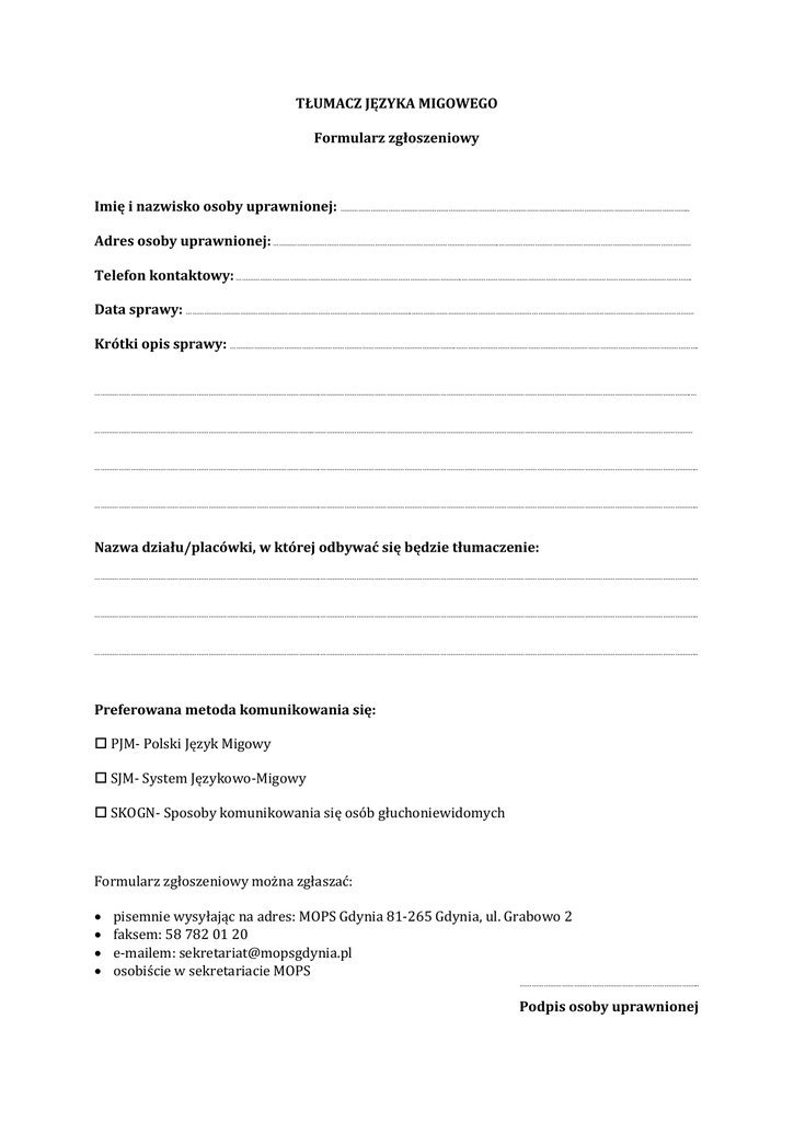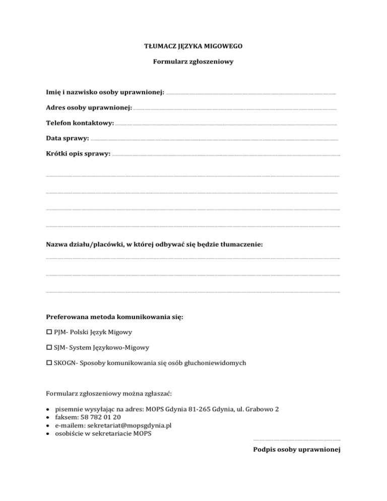 TŁUMACZ JĘZYKA MIGOWEGO Formularz zgłoszeniowy Imię i nazwisko osoby uprawnionej: …………………………………………………………………………………………………..…………………………………………………….. Adres osoby uprawnionej: …………………………………………………………………………………………………..…………………………………………………………………………………… Telefon kontaktowy: …………………………………………………………………………………………………..……………………………………………………………………………………………………. Data sprawy: …………………………………………………………………………………………………..…………………………………………………………………………………………………………………………… Krótki opis sprawy: …………………………………………………………………………………………………..…………………………………………………………………………………………………………. …………………………………………………………………………………………………..…………………………………………………………………………………………………………………………………………………………………..… ………………………………………………………………………………………………..……………………………………………………………………………………………………………………………………………………………………… …………………………………………………………………………………………………..……………………………………………………………………………………………………………………………………………………………………... …………………………………………………………………………………………………..……………………………………………………………………………………………………………………………………………………………………... Nazwa działu/placówki, w której odbywać się będzie tłumaczenie: …………………………………………………………………………………………………..……………………………………………………………………………………………………………………………………………………………………... …………………………………………………………………………………………………..……………………………………………………………………………………………………………………………………………………………………... …………………………………………………………………………………………………..……………………………………………………………………………………………………………………………………………………………………... Preferowana metoda komunikowania się: PJM- Polski Język Migowy SJM- System Językowo-Migowy SKOGN- Sposoby komunikowania się osób głuchoniewidomych Formularz zgłoszeniowy można zgłaszać: pisemnie wysyłając na adres: MOPS Gdynia 81-265 Gdynia, ul. Grabowo 2 faksem: 58 782 01 20 e-mailem: [email protected] osobiście w sekretariacie MOPS ……………………………………………………………………………... Podpis osoby uprawnionej