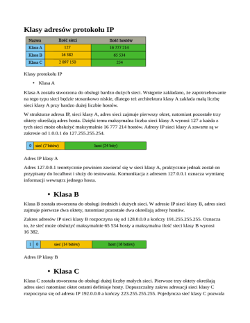 Klasy adresów protokołu IP Klasy protokołu IP • Klasa A Klasa A została stworzona do obsługi bardzo dużych sieci. Wstępnie zakładano, że zapotrzebowanie na tego typu sieci będzie stosunkowo niskie, dlatego też architektura klasy A zakłada małą liczbę sieci klasy A przy bardzo dużej liczbie hostów. W strukturze adresu IP, sieci klasy A, adres sieci zajmuje pierwszy oktet, natomiast pozostałe trzy oktety określają adres hosta. Dzięki temu maksymalna liczba sieci klasy A wynosi 127 a każda z tych sieci może obsłużyć maksymalnie 16 777 214 hostów. Adresy IP sieci klasy A zawarte są w zakresie od 1.0.0.1 do 127.255.255.254. Adres IP klasy A Adres 127.0.0.1 teoretycznie powinien zawierać się w sieci klasy A, praktycznie jednak został on przypisany do localhost i służy do testowania. Komunikacja z adresem 127.0.0.1 oznacza wymianę informacji wewnątrz jednego hosta. • Klasa B Klasa B została stworzona do obsługi średnich i dużych sieci. W adresie IP sieci klasy B, adres sieci zajmuje pierwsze dwa oktety, natomiast pozostałe dwa określają adresy hostów. Zakres adresów IP sieci klasy B rozpoczyna się od 128.0.0.0 a kończy 191.255.255.255. Oznacza to, że sieć może obsłużyć maksymalnie 65 534 hosty a maksymalna ilość sieci klasy B wynosi 16 382. Adres IP klasy B • Klasa C Klasa C została stworzona do obsługi dużej liczby małych sieci. Pierwsze trzy oktety określają adres sieci natomiast oktet ostatni definiuje hosty. Dopuszczalny zakres adresacji sieci klasy C rozpoczyna się od adresu IP 192.0.0.0 a kończy 223.255.255.255. Pojedyncza sieć klasy C pozwala obsłużyć 254 hosty, natomiast maksymalna ilość sieci klasy C wynosi 2 097 150. Adres IP klasy C • Klasa D Klasa D została stworzona do multiemisji (multicast). Adres multicast jest unikalnym adresem sieci, który kieruje pakiety do grup adresów IP. Takie rozwiązanie jest dużo wydajniejsze od tworzenie oddzielnego strumienia do poszczególnych odbiorców. Dopuszczalny zakres adresów IP hostów sięga od 224.0.0.0 do 239.255.255.254 Adres IP klasy D • Klasa E Zdefiniowano klasę E, lecz jej adresy zostały zarezerwowane przez Internet Engineering Task Force (IETF) na potrzeby badawcze i klasa ta nie może być używana w Internecie. Adresy IP sieci klasy E zawarte są w zakresie od 240.0.0.0 do 255.255.255.255 Adres IP klasy E • Adresy prywatne • Adresy prywatne sieci klasy A to zakres adresów IP: 10.0.0.0 - 10.255.255.255, • Adresy prywatne sieci klasy B to zakres adresów IP: 172.16.0.0 - 172.31.0.0, • Adresy prywatne sieci klasy C to zakres adresów IP: 192.168.0.0 - 192.168.255.0.
