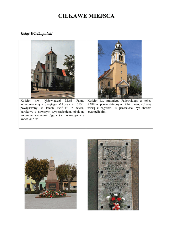 CIEKAWE MIEJSCA Książ Wielkopolski Kościół p.w. Najświętszej Marii Panny Wniebowziętej i Świętego Mikołaja z 1755r., powiększony w latach 1948-49, z wieżą, barokowy z nowszym wyposażeniem, obok na kolumnie kamienna figura św. Wawrzyńca z końca XIX w. Kościół św. Antoniego Padewskiego z końca XVIII w. przekształcony w 1914 r., neobarokową wieżą z zegarem. W przeszłości był zborem ewangelickim. Rynek (Pl. Kosynierów) z zabudową z przełomu XIX i XX w., w centralnej części pomnik (1948r.) pomordowanych w 1939 r., na jednym z budynków tablica pamiątkowa poświecona mjr. Florianowi Dąbrowskiemu (1935r.), dowódcy obozu powstańczego w Książu w 1848r. Mogiły powstańców poległych w bitwie o Książ w 1848r. w formie 2 kopców z krzyżami, porośnięte sosnami, między nimi pomnik kosynierów (z 1948r.) wg. projektu K. Bieńkowskiego oraz tablica upamiętniająca 150 rocznicę bitwy. Cmentarz z pomnikami nagrobnymi: poległych w 1848 r., powstańców wielkopolskich (z 1929 r.) oraz ofiar egzekucji na rynku w Książu w 1939 r.(z 1988r.). Chwałkowo Kościelne Kościół p.w. św. Michała Archanioła z 1819r. na miejscu wcześniejszego, drewnianego z neogotyckim prezbiterium (1891 r.) i wieżą (1904 r.). w wyposażeniu m.in.: fragmenty późnogotyckiej płaskorzeźby z Pokłonem Trzech Króli oraz predella za sceną Złożenia do Grobu z ok.1500r. Dwór z 1 poł. XIX w. z piętrową przybudówką z pocz. XX w. Pomnik powstańców wielkopolskich z figurą Serca Jezusowego na cmentarzu. Spichlerz murowany z I poł. XIX w. Zabytkowe rozplanowanie wsi nowożytnej z XIX w. Chrząstowo Dwór z ok. 1850r. przebudowany (1954r.) na szkołę, wokół częściowo zachowany park krajobrazowy ze starym drzewostanem. W pobliżu zabudowań folwarcznych 3 okazałe dęby szypułkowe o obwodzie 450-610 cm. Gogolewo Kościół p.w. Podwyższenia Krzyża Świętego z 1779r. drewniany, z jednolitym barokowym wyposażeniem, obok drewniana dzwonnica kryta gontem z końca XVIII w. Dwór z końca XVIII w. z dachem naczółkowym i nowszym gankiem. Kapliczka z barokową drewnianą figurą św. Jana Nepomucena z XVIII w. Jarosławki Zespół dworski z 4 ćw. XIX w., przebudowany na początku XX w., wokół niewielki park krajobrazowy. Kołacin Dwór z 1912r., później przebudowany na dom mieszkalny Mchy Kościół św. Marcina z lat 1575-1616, późnorenesansowy z wysoką barokową wieżą z zegarem. Wewnątrz późnorenesansowy nagrobek przyścienny, piętrowy, Stanisława i Katarzyny Sapińskich (po 1588r.) oraz tablica poświęcona abp. Antoniemu Baraniakowi (1977r.). Pałac z końca XVIII w. klasyczny z kolumnowym portykiem od frontu oraz bogatą dekoracją stiukową wnętrz. Wokół park krajobrazowy z pocz. XIX w. Z pomnikowym drzewostanem m.in. buk czerwony o obwodzie 310 cm, platan klon. - 320 cm i jesion wys. - 307 cm. Kapliczka z barokową figurą św. Wawrzyńca i płaskorzeźbą św. Jana Nepomucena. Włościejewki Kościół p.w. Niepokalanego Poczęcia Najświętszej Panny Marii z pocz. XVI w., późnogotycki ze szczytem schodowym od frontu. W neogotyckim ołtarzu głównym obraz Matki Boskiej z Dzieciątkiem z 1 poł. XVIII w., uchodzący za cudowny. W kaplicy eklektycznej tablica (z 1883r.) 200-lecia bitwy pod Wiedniem. Na zewnątrz wmurowany głaz ze śladami stóp, związany z licznymi legendami. Dwór Niegolewskich z 1 ćw. XIX w., rozbudowany o piętrowe skrzydło w końcu XIX w. Wokół park krajobrazowy z końca XVI - XVII w. z pomnikowymi drzewami m.in.: 2 platany o obwodzie 490 i 320 cm, 8 dębów szyp. O obwodzie 320 - 590 cm, 4 lipy drobno o obwodzie 340 - 480 cm i wiele innych. Grodzisko stożkowe, późnośredniowieczne ze śladami murów po dworze Pasikoniów Włościejewskich, na nim brzoza biała o obwodzie 480 cm i wierzba o obwodzie 440 cm. Zaborowo Dwór z końca XIX w. wokół park krajobrazowy.
