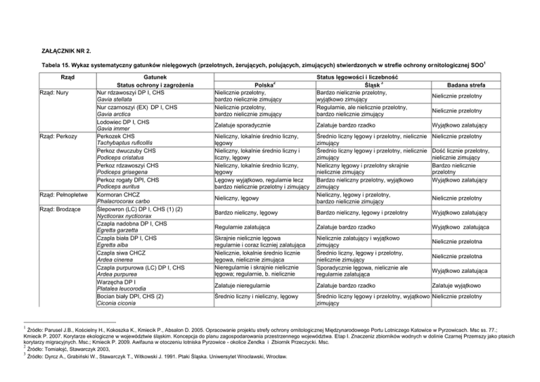 ZAŁĄCZNIK NR 2. Tabela 15. Wykaz systematyczny gatunków nielęgowych (przelotnych, żerujących, polujących, zimujących) stwierdzonych w strefie ochrony ornitologicznej SOO Rząd Rząd: Nury Rząd: Perkozy Rząd: Pełnopłetwe Rząd: Brodzące 1 Gatunek Status ochrony i zagrożenia Nur rdzawoszyi DP I, CHS Gavia stellata Nur czarnoszyi (EX) DP I, CHS Gavia arctica Lodowiec DP I, CHS Gavia immer Perkozek CHS Tachybaptus ruficollis Perkoz dwuczuby CHS Podiceps cristatus Perkoz rdzawoszyi CHS Podiceps grisegena Perkoz rogaty DPI, CHS Podiceps auritus Kormoran CHCZ Phalacrocorax carbo Ślepowron (LC) DP I, CHS (1) (2) Nycticorax nycticorax Czapla nadobna DP I, CHS Egretta garzetta Czapla biała DP I, CHS Egretta alba Czapla siwa CHCZ Ardea cinerea Czapla purpurowa (LC) DP I, CHS Ardea purpurea Warzęcha DP I Platalea leucorodia Bocian biały DPI, CHS (2) Ciconia ciconia 1 Polska Nielicznie przelotny, bardzo nielicznie zimujący Nielicznie przelotny, bardzo nielicznie zimujący Status lęgowości i liczebność 3 Śląsk Bardzo nielicznie przelotny, wyjątkowo zimujący Regularnie, ale nielicznie przelotny, bardzo nielicznie zimujący Nielicznie przelotny Zalatuje sporadycznie Zalatuje bardzo rzadko Wyjątkowo zalatujący Nieliczny, lokalnie średnio liczny, lęgowy Nieliczny, lokalnie średnio liczny i liczny, lęgowy Nieliczny, lokalnie średnio liczny, lęgowy Lęgowy wyjątkowo, regularnie lecz bardzo nielicznie przelotny i zimujący Średnio liczny lęgowy i przelotny, nielicznie zimujący Średnio liczny lęgowy i przelotny, nielicznie zimujący Nieliczny lęgowy i przelotny skrajnie nielicznie zimujący Bardzo nieliczny przelotny, wyjątkowo zimujący Nieliczny, lęgowy i przelotny, bardzo nielicznie zimujący Nielicznie przelotny Bardzo nieliczny, lęgowy Bardzo nieliczny, lęgowy i przelotny Wyjątkowo zalatujący Regularnie zalatująca Zalatuje bardzo rzadko Wyjątkowo zalatująca Skrajnie nielicznie lęgowa regularnie i coraz liczniej zalatująca Nielicznie, lokalnie średnio licznie lęgowa, nielicznie zimująca Nieregularnie i skrajnie nielicznie lęgowa; regularnie, b. nielicznie zalatująca Zalatuje nieregularnie Nielicznie zalatujący i wyjątkowo zimujący Średnio liczny, lęgowy i przelotny, nielicznie zimujący Sporadycznie lęgowa, nielicznie ale regularnie zalatująca Średnio liczny i nieliczny, lęgowy Średnio liczny lęgowy i przelotny, wyjątkowo Nielicznie przelotny zimujący 2 Nieliczny, lęgowy Zalatuje bardzo rzadko Badana strefa Nielicznie przelotny Dość licznie przelotny, nielicznie zimujący Bardzo nielicznie przelotny Wyjątkowo zalatujący Nielicznie przelotny Nielicznie przelotna Nielicznie przelotna Wyjątkowo zalatująca Zalatuje wyjątkowo Źródło: Parusel J.B., Kościelny H., Kokoszka K., Kmiecik P., Absalon D. 2005. Opracowanie projektu strefy ochrony ornitologicznej Międzynarodowego Portu Lotniczego Katowice w Pyrzowicach. Msc ss. 77.; Kmiecik P. 2007. Korytarze ekologiczne w województwie śląskim. Koncepcja do planu zagospodarowania przestrzennego województwa. Etap I. Znaczeniz zbiorników wodnych w dolinie Czarnej Przemszy jako ptasich korytarzy migracyjnych. Msc.; Kmiecik P. 2009. Awifauna w otoczeniu lotniska Pyrzowice - okolice Zendka i Zbiornik Przeczycki. Msc. 2 Źródło: Tomiałojć, Stawarczyk 2003, 3 Żródło: Dyrcz A., Grabiński W., Stawarczyk T., Witkowski J. 1991. Ptaki Śląska. Uniwersytet Wrocławski, Wrocław. Rząd Gatunek Status ochrony i zagrożenia Bocian czarny DPI, CHS (1) (2), OS Ciconia nigra Rząd: Blaszkodziobe Łabędź niemy DPII/2, CHS Cygnus olor Łabędź krzykliwy DP I, CHS Cygnus cygnus Gęś zbożowa DP II/1 Anser fabalis Gęś białoczelna DP II/2 Anser albifrons Gęgawa DP II/1 Anser anser Ohar (LC) CHS (2) Tadorna tadorna Świstun (CR) DP II/1, CHS Anas penelope Krakwa DPII/1, CHS Anas strepera Cyraneczka DPII/1 Anas crecca Krzyżówka DPII/1 Anas platyrhynchos Rożeniec (EN), DPII/1, CHS (2) Anas acuta Głowienka DPII/1 Anas ferina Czerniczka CHS Aythya collaris Cyranka DPII/1, CHS (2) Anas querquedula Płaskonos DPII/1, CHS (2) Anas clypeata Hełmiatka (LC) DP II/2, CHS Netta rufina Czernica DPII/1 Aythya fuligula Podgorzałka (EN) DP I, CHS Aythya nyroca Ogorzałka DP II/2, CHS Aythya marila 2 Polska Bardzo nielicznie lęgowy Status lęgowości i liczebność 3 Śląsk Nieliczny lęgowy i przelotny Badana strefa Bardzo nielicznie przelotny Dość licznie przelotny, zimujący Nielicznie, lokalnie średnio licznie Nieliczny lęgowy, średnio licznie zimujący lęgowy Skrajnie nielicznie lęgowy, dość licznie Skrajnie nielicznie lęgowy, bardzo nieliczny Bardzo nieliczny przelotny przelatujący i nielicznie zimujący w okresie przelotów i w zimie Średnio liczny, lęgowy i przelotny, Licznie przelotna i zimująca Nielicznie przelotna nieregularnie i nielicznie zimujący Bardzo nielicznie przelotna Nieliczny, przelotny, niekiedy zimujący Sporadycznie zalatująca Nielicznie lęgowa Nieliczny, lęgowy i przelotny nieregularnie i bardzo nielicznie zimujący Nielicznie przelotna Skrajnie nielicznie lęgowy Zalatuje regularnie ale bardzo nielicznie Wyjątkowo zalatujący Nielicznie przelotny, bardzo nielicznie Zimujący Nielicznie lęgowa Nieliczny lęgowy i przelotny, bardzo rzadko zimujący Bardzo nielicznie lęgowa Bardzo nielicznie lęgowa, dość licznie przelotna i zimująca Średnio licznie, lokalnie licznie lęgowa Bardzo licznie lęgowy, przelotny i zimujący Skrajnie nielicznie lęgowy Nieliczny przelotny Nielicznie przelotna Dość licznie przelotna Licznie przelotna Skrajnie nielicznie lęgowy Skrajnie nielicznie lęgowy, nielicznie Sporadycznie przelotny przelotny i regularnie choć bardzo nielicznie zimujący Średnio licznie, lokalnie nielicznie lęgowa Zalatuje wyjątkowo Licznie lęgowa i przelotna, regularnie i nielicznie zimująca Bd Dość licznie przelotna Nielicznie, lokalnie licznie lęgowa Nielicznie lęgowa i przelotna, wyjątkowo zimująca Nielicznie lęgowy i przelotny, sk