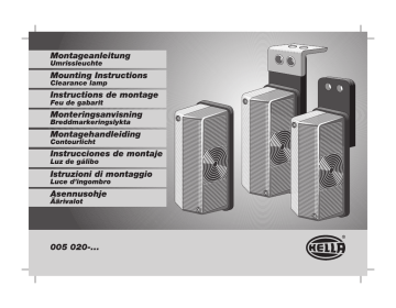 Montageanleitung Umrissleuchte Mounting Instructions Clearance lamp Instructions de montage Feu de gabarit Monteringsanvisning Breddmarkeringslykta Montagehandleiding Contourlicht Instrucciones de montaje Luz de gálibo Istruzioni di montaggio Luce d’ingombro Asennusohje Äärivalot 005 020-... Lieferumfang Kit includes Fourniture Leveransomfattning Inhoud set Volumen del suministro Dotazione die fornitura Osaluettelo 005 020-00 005 020-03 005 020-04 005 020-07 005 020-08 005 020-01 005 020-06 005 020-09 005 020-14 005 020-02 005 020-11 005 020-12 2 005 020-05 005 020-13 Der Anbau muss nach ECE R48 erfolgen. Le montage est à réaliser selon ECE R48. Il montaggio deve avvenire secondo la direttiva ECE R48. El montaje debe efectuarse conforme a la norma ECE R48. Schutzklasse IP 54 K Classe de protection IP 54 K Classe di protezione IP 54 K Protección IP 54 K Installation must take place in accordance with ECE R48. Inbouw dient plaats te vinden in overeenstemming met ECE R48. Monteringen ska utföras i enlighet med ECE-R48. Valo on asennettava ECE R48:n mukaan. Protection IP 54 K Beschermklasse IP 54 K Skyddsklasser IP 54 K Kotelointiluokka IP 54 K 3 Benötigtes Werkzeug Tools required Outillage nécessaire Nödvändiga verktyg Noodzakelijk gereegschap Herramientas necesarias Ø 3 / 5 / 6,5 mm Utensili necessari Tarvittavat työkalut SW 8 005 020-00, 005 020-03, 005 020-04, 005 020-07, 005 020-08 Ø3 mm 4 Ø5 mm 6.3 mm Ø3 mm 1.5 005 020-01 005 020-02 005 020-06 005 020-11 005 020-09 005 020-12 M6 3,5 Nm 005 020-14 Ø 6,5 mm M6 1,0 Nm 5 Ø 6,5 mm 005 020-05 005 020-13 Ø3 mm Ø5 mm 6 Ø3 mm Zubehör Accessories Accessoires Tillbehör Toebehoren Accesorios Lichtgehäuse Boddy/Lens Boîtier lumineux Lyktglas Lamphuis Plástico-carcasa Plastica Lasi rot/weiß red/white rouge/blanc röd/vit rood/Wit rojo/blanco rosso/bianco punainen/valkoinen Accessori Lisätarvikkeet rood/zwart rojo/negro rosso/nero punainen/musta rot/schwarz red/black rouge/noir röd/svart 7 9 9EL 132 215-001 9EL 132 215-011 12 V 24 V 8GP 002 067-121 8GP 002 067-241 © Hella KGaA Hueck & Co., D-59552 Lippstadt 460 903-40 10.07