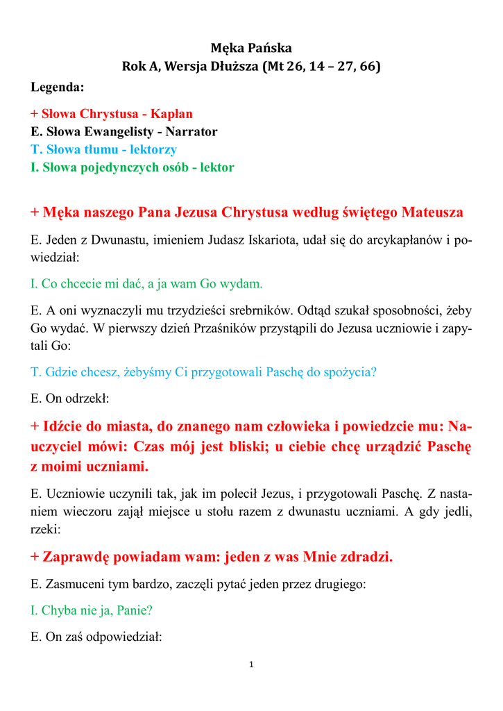 Męka Pańska Rok A, Wersja Dłuższa (Mt 26, 14 – 27, 66) Legenda: + Słowa Chrystusa - Kapłan E. Słowa Ewangelisty - Narrator T. Słowa tłumu - lektorzy I. Słowa pojedynczych osób - lektor + Męka naszego Pana Jezusa Chrystusa według świętego Mateusza E. Jeden z Dwunastu, imieniem Judasz Iskariota, udał się do arcykapłanów i powiedział: I. Co chcecie mi dać, a ja wam Go wydam. E. A oni wyznaczyli mu trzydzieści srebrników. Odtąd szukał sposobności, żeby Go wydać. W pierwszy dzień Przaśników przystąpili do Jezusa uczniowie i zapytali Go: T. Gdzie chcesz, żebyśmy Ci przygotowali Paschę do spożycia? E. On odrzekł: + Idźcie do miasta, do znanego nam człowieka i powiedzcie mu: Nauczyciel mówi: Czas mój jest bliski; u ciebie chcę urządzić Paschę z moimi uczniami. E. Uczniowie uczynili tak, jak im polecił Jezus, i przygotowali Paschę. Z nastaniem wieczoru zajął miejsce u stołu razem z dwunastu uczniami. A gdy jedli, rzeki: + Zaprawdę powiadam wam: jeden z was Mnie zdradzi. E. Zasmuceni tym bardzo, zaczęli pytać jeden przez drugiego: I. Chyba nie ja, Panie? E. On zaś odpowiedział: 1 + Ten, który ze Mną rękę zanurza w misie, on Mnie zdradzi. Wprawdzie Syn Człowieczy odchodzi, jak o Nim jest napisane; lecz biada temu człowiekowi, przez którego Syn Człowieczy będzie wydany. Byłoby lepiej dla tego człowieka, gdyby się nie narodził. E. Wtedy Judasz, który Go miał zdradzić, powiedział: I. Czy nie ja, Rabbi? E. Odpowiedział mu: + Tak, to ty jesteś. E. A gdy oni jedli, Jezus wziął chleb i odmówiwszy błogosławieństwo, połamał go i dał uczniom, mówiąc: + Bierzcie i jedzcie, to jest Ciało moje. E. Następnie wziął kielich i odmówiwszy dziękczynienie dał im, mówiąc: + Pijcie z niego wszyscy; bo to jest moja Krew Przymierza, która za wielu będzie wylana na odpuszczenie grzechów. Lecz powiadam wam: Odtąd nie będę już pił z tego owocu winnego krzewu aż do owego dnia, kiedy pić go będę z wami nowy, w królestwie Ojca mojego. E. Po odśpiewaniu hymnu wyszli na Górę Oliwną. Wówczas Jezus rzekł do nich: + Wy wszyscy zwątpicie we Mnie tej nocy. Bo jest napisane: Uderzę pasterza, a rozproszą się owce stada. Lecz gdy powstanę, uprzedzę was do Galilei. E. Piotr Mu odpowiedział: I. Choćby wszyscy zwątpili w Ciebie, ja nigdy nie zwątpię. E. Jezus mu rzekł: + Zaprawdę powiadam ci: Jeszcze tej nocy, zanim kogut zapieje, trzy razy się Mnie wyprzesz. 2 E. Na to Piotr: I. Choćby mi przyszło umrzeć z Tobą, nie zaprę się Ciebie. E. Podobnie zapewniali wszyscy uczniowie. Wtedy przyszedł Jezus z nimi do ogrodu, zwanego Getsemani, i rzekł do uczniów: + Usiądźcie tu, Ja tymczasem odejdę tam i będę się modlił. E. Wziąwszy z sobą Piotra i dwóch synów Zebedeusza, począł się smucić i odczuwać trwogę. Wtedy rzekł do nich: + Smutna jest moja dusza aż do śmierci; zostańcie tu i czuwajcie ze Mną. E. I odszedłszy nieco dalej, upadł na twarz i modlił się tymi słowami: + Ojcze mój, jeśli to możliwe, niech Mnie ominie ten kielich. Wszakże nie jak Ja chcę, ale jak Ty. E. Potem przyszedł do uczniów i zastał ich śpiących. Rzekł więc do Piotra: + Tak, jednej godziny nie mogliście czuwać ze Mną? Czuwajcie i módlcie się, abyście nie ulegli pokusie; duch wprawdzie ochoczy, ale ciało słabe. E. Powtórnie odszedł i tak się modlił: + Ojcze mój, jeśli nie może ominąć Mnie ten kielich i muszę go wypić, niech się stanie wola Twoja. E. Potem przyszedł i znów zastał ich śpiących, bo oczy ich były senne. Zostawiwszy ich, odszedł znowu i modlił się po raz trzeci, powtarzając te same słowa. Potem wrócił do uczniów i rzekł do nich: + Śpicie jeszcze i odpoczywacie? A oto nadeszła godzina i Syn Człowieczy będzie wydany w ręce grzeszników. Wstańcie, chodźmy; oto się zbliża mój zdrajca. 3 E. Gdy On jeszcze mówił, oto przyszedł Judasz, jeden z Dwunastu, a z nim wielka zgraja z mieczami i kijami od arcykapłanów i starszych ludu. Zdrajca zaś dał im taki znak: I. Ten, którego pocałuję, to On; Jego pochwyćcie. E. Zaraz też przystąpił do Jezusa, mówiąc: I. Witaj, Rabbi. E. I pocałował Go. A Jezus rzekł do niego: + Przyjacielu, po coś przyszedł? E. Wtedy rzucili się na Jezusa i pochwycili Go. A oto jeden z tych, którzy byli z Jezusem, wyciągnął rękę, dobył miecza i ugodziwszy sługę najwyższego kapłana, odciął mu ucho. Wtedy Jezus rzekł do niego: + Schowaj miecz swój do pochwy, bo wszyscy, którzy za miecz chwytają, od miecza giną. Czy myślisz, że nie mógłbym prosić Ojca mojego, a zaraz wystawiłby Mi więcej niż dwanaście zastępów aniołów? Jakże więc spełnią się Pisma, że tak się stać musi? E. W owej chwili Jezus rzekł do tłumów: + Wyszliście mieczami kijami jak na zbójcę, żeby Mnie pochwycić. Codziennie zasiadałem w świątyni i nauczałem, a nie pojmaliście Mnie. Lecz stało się to wszystko, żeby się wypełniły Pisma proroków. E. Wtedy wszyscy uczniowie opuścili Go i uciekli. Ci zaś, którzy pochwycili Jezusa, zaprowadzili Go do najwyższego kapłana, Kajfasza, gdzie zebrali się uczeni w Piśmie i starsi. A Piotr szedł za Nim z daleka, aż do pałacu najwyższego kapłana. Wszedł tam na dziedziniec i usiadł między służbą, aby widzieć, jaki będzie wynik. Tymczasem arcykapłani i cała Wysoka Rada szukali fałszywego świadectwa przeciw Jezusowi, aby Go zgładzić. Lecz nie znaleźli, jakkolwiek występowało wielu fałszywych świadków. W końcu stanęli dwaj i zeznali: 4 T. On powiedział: Mogę zburzyć przybytek Boży i w ciągu trzech dni go odbudować. E. Wtedy powstał najwyższy kapłan i rzekł do Niego: I. Nic nie odpowiadasz na to, co oni zeznają przeciwko Tobie? E. Lecz Jezus milczał. A najwyższy kapłan rzekł do Niego: I. Poprzysięgam Cię na Boga żywego, powiedz nam: Czy Ty jesteś Mesjaszem, Synem Bożym? E. Jezus mu odpowiedział: + Tak, Ja Nim jestem. Ale