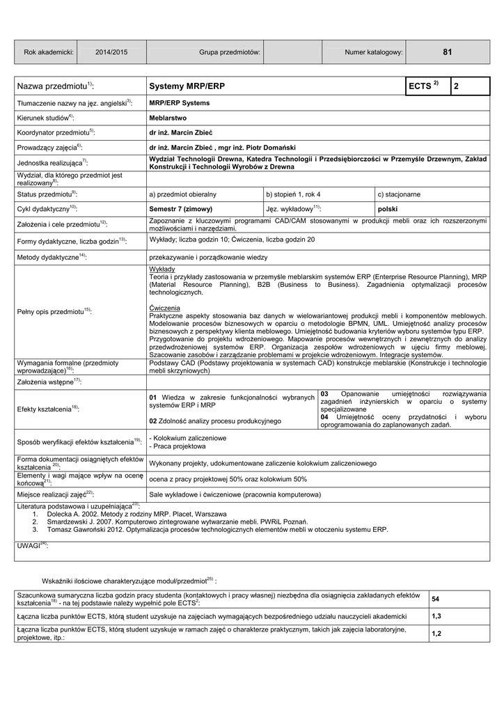 81 Nazwa przedmiotu1): Systemy MRP/ERP ECTS 2) 2