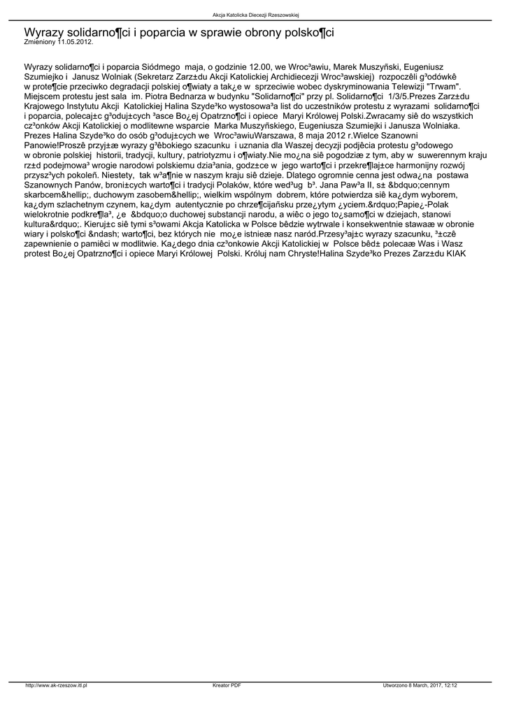 Akcja Katolicka Diecezji Rzeszowskiej Wyrazy solidarno¶ci i poparcia w sprawie obrony polsko¶ci Zmieniony 11.05.2012. Wyrazy solidarno¶ci i poparcia Siódmego maja, o godzinie 12.00, we Wroc³awiu, Marek Muszyñski, Eugeniusz Szumiejko i Janusz Wolniak (Sekretarz Zarz±du Akcji Katolickiej Archidiecezji Wroc³awskiej) rozpoczêli g³odówkê w prote¶cie przeciwko degradacji polskiej o¶wiaty a tak¿e w sprzeciwie wobec dyskryminowania Telewizji "Trwam". Miejscem protestu jest sala im. Piotra Bednarza w budynku "Solidarno¶ci" przy pl. Solidarno¶ci 1/3/5.Prezes Zarz±du Krajowego Instytutu Akcji Katolickiej Halina Szyde³ko wystosowa³a list do uczestników protestu z wyrazami solidarno¶ci i poparcia, polecaj±c g³oduj±cych ³asce Bo¿ej Opatrzno¶ci i opiece Maryi Królowej Polski.Zwracamy siê do wszystkich cz³onków Akcji Katolickiej o modlitewne wsparcie Marka Muszyñskiego, Eugeniusza Szumiejki i Janusza Wolniaka. Prezes Halina Szyde³ko do osób g³oduj±cych we Wroc³awiuWarszawa, 8 maja 2012 r.Wielce Szanowni Panowie!Proszê przyj±æ wyrazy g³êbokiego szacunku i uznania dla Waszej decyzji podjêcia protestu g³odowego w obronie polskiej historii, tradycji, kultury, patriotyzmu i o¶wiaty.Nie mo¿na siê pogodziæ z tym, aby w suwerennym kraju rz±d podejmowa³ wrogie narodowi polskiemu dzia³ania, godz±ce w jego warto¶ci i przekre¶laj±ce harmonijny rozwój przysz³ych pokoleñ. Niestety, tak w³a¶nie w naszym kraju siê dzieje. Dlatego ogromnie cenna jest odwa¿na postawa Szanownych Panów, broni±cych warto¶ci i tradycji Polaków, które wed³ug b³. Jana Paw³a II, s± „cennym skarbcem…, duchowym zasobem…, wielkim wspólnym dobrem, które potwierdza siê ka¿dym wyborem, ka¿dym szlachetnym czynem, ka¿dym autentycznie po chrze¶cijañsku prze¿ytym ¿yciem.”Papie¿-Polak wielokrotnie podkre¶la³, ¿e „o duchowej substancji narodu, a wiêc o jego to¿samo¶ci w dziejach, stanowi kultura”. Kieruj±c siê tymi s³owami Akcja Katolicka w Polsce bêdzie wytrwale i konsekwentnie stawaæ w obronie wiary i polsko¶ci – warto¶ci, bez których nie mo¿e istnieæ nasz naród.Przesy³aj±c wyrazy szacunku, ³±czê zapewnienie o pamiêci w modlitwie. Ka¿dego dnia cz³onkowie Akcji Katolickiej w Polsce bêd± polecaæ Was i Wasz protest Bo¿ej Opatrzno¶ci i opiece Maryi Królowej Polski. Króluj nam Chryste!Halina Szyde³ko Prezes Zarz±du KIAK http://www.ak-rzeszow.itl.pl Kreator PDF Utworzono 8 March, 2017, 12:12