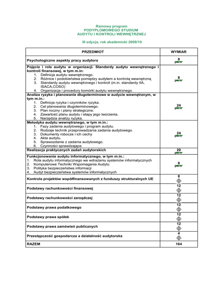 Ramowy program PODYPLOMOWEGO STUDIUM AUDYTU I KONTROLI WEWNĘTRZNEJ III edycja, rok akademicki 2009/10 PRZEDMIOT Psychologiczne aspekty pracy audytora Pojęcie i rola audytu w organizacji. Standardy audytu wewnętrznego i kontroli finansowej, w tym m.in: 1. Definicja audytu wewnętrznego. 2. Różnice i podobieństwa pomiędzy audytem a kontrolą wewnętrzną 3. Standardy audytu wewnętrznego i kontroli (m.in. standardy IIA, ISACA,COSO) 4. Organizacja i procedury komórki audytu wewnętrznego. Analiza ryzyka i planowanie długoterminowe w audycie wewnętrznym, w tym m.in.: 1. Definicja ryzyka i czynników ryzyka. 2. Cel planowania długoterminowego. 3. Plan roczny i plany strategiczne. 4. Zawartość planu audytu i etapy jego tworzenia. 5. Narzędzia analizy ryzyka. Metodyka audytu wewnętrznego, w tym m.in.: 1. Fazy zadania audytowego i program audytu. 2. Rodzaje technik przeprowadzania zadania audytowego. 3. Dokumenty robocze i ich cechy 4. Akta audytu. 5. Sprawozdanie z zadania audytowego. 6. Czynności sprawdzające Realizacja praktycznych zadań audytorskich Funkcjonowanie audytu informatycznego, w tym m.in.: 1. Rola audytu informatycznego we wdrażaniu systemów informatycznych 2. Komputerowe Techniki Wspomagania Audytu 3. Polityka bezpieczeństwa informacji 4. Audyt bezpieczeństwa systemów informatycznych Kontrola projektów współfinansowanych z funduszy strukturalnych UE Podstawy rachunkowości finansowej Podstawy rachunkowości zarządczej Podstawy prawa podatkowego Podstawy prawa spółek Podstawy prawa zamówień publicznych Przestępczość gospodarcza a działalność audytorska RAZEM WYMIAR 8 8 24 24 20 8 8 12 12 12 12 12 4 164