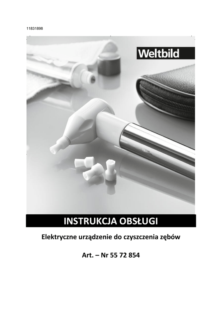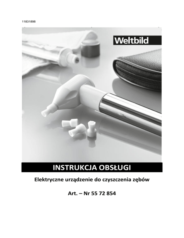 11831898 INSTRUKCJA OBSŁUGI Elektryczne urządzenie do czyszczenia zębów Art. – Nr 55 72 854 Drodzy Klienci! Niesamowite, łatwe w obsłudze urządzenie do czyszczenia zębów, które zapewni Wam naprawdę promienny uśmiech! Elektryczne urządzenie do czyszczenia zębów jest niezwykłym, nowym urządzeniem do usuwania kamienia nazębnego – taki rodzaj przyrządu, w który wierzą zwolennicy doskonałej higieny jamy ustnej – ponieważ on naprawdę działa. Urządzenie, stworzone przez naukowców i zasilane bateriami jest idealne do pielęgnacji jamy ustnej w domu i podczas podróży, w czasie której potrzebna jest Ci szczoteczka do zębów. Urządzenie do czyszczenia zębów nie zostało pomyślane jako zwykły zamiennik dla szczoteczki do zębów. Powstało po to, aby umożliwić Ci wyjątkową pielęgnację jamy ustnej, której zwykła szczoteczka do zębów nie jest w stanie zapewnić. Używane dwa razy w tygodniu po 2 minuty, z pastą do zębów lub bez, urządzenie czyści profesjonalnie nie tylko powierzchnię Twoich przednich zębów (to one tworzą Twój promienny uśmiech), lecz usuwa także plamy i przebarwienia, jak również uniemożliwia tworzenie się osadu. Łagodna rotacja nakładki polerującej poleruje zęby i powoduje, że błyszczą. Życzymy wiele radości z korzystania z tego produktu. Wasz Ideenshop Team Unikanie nadmiernego pryskania Jeśli zamkniesz usta wokół urządzenia i będziesz polerować zęby w taki sposób, unikniesz pryskania na zewnątrz. Jak często powinieneś polerować zęby W normalnych warunkach wystarczy polerowanie zębów dwa razy w tygodniu. Naturalnie, dla pełnej ochrony zębów, należy je także myć dwa razy dziennie szczoteczką do zębów. Jak długo powinno trwać polerowanie Każdy ząb należy polerować nie dłużej, niż kilka sekund, a ponieważ będziesz polerować tylko przednie zęby, nie będzie to trwać w sumie dłużej, niż 2 – 3 minuty. Jak należy polerować zęby Nałóż na nakładkę polerującą niewielką ilość pasty do zębów – zwykła pasta do zębów to wszystko, czego potrzebujesz /co jest zalecane. Jeśli jesteś gotowy do polerowania, przytrzymaj urządzenie w ręku, palec wskazujący powinien się znajdować niedaleko włącznika ON a wolny palec powinien wspierać Twoją brodę, co zapewni lepszą kontrolę procesu polerowania. Przed włączeniem urządzenia, nałóż na zęby, korzystając z gumowej nasadki, nieco pasty do zębów a następnie włącz urządzenie, uruchamiając włącznik. Teraz możesz polerować swoje zęby. Nie wywieraj zbyt wielkiego nacisku! Urządzenie jest zbudowane w taki sposób, że jego główka przestanie się obracać, jeśli nacisk na zęby będzie zbyt duży. Postępuj w taki sam sposób ze wszystkimi przednimi zębami, u góry i u dołu. Podczas polerowania zębów będziesz musiał kilkakrotnie nakładać pastę na nakładkę. Możesz też nanieść pastę palcem na zęby, jeśli tak wolisz. Wystarcza delikatnie przyłożenie końcówki do zęba, prowadź urządzenie łukiem po każdym zębie, do dołu i z powrotem. W taki sposób, brzegiem nakładki, wypolerujesz wszystkie miejsca, także boki i powierzchnię między zębową. Włącznik Wkładanie baterii Urządzenie jest zasilane 2 bateriami AA, 1,5 V (niedołączone do urządzenia). Aby włożyć baterie, odkręć po prostu górną część urządzenia od części głównej i włóż baterie do części głównej, biegun dodatni + skierowany do dołu (patrz rys.). Następnie ponownie skręć ze sobą części urządzenia. Wymienne nakładki polerujące Wraz z urządzeniem dostarczyliśmy Ci 5 wymiennych nakładek. Mogą z nich korzystać członkowie rodziny, lub możesz je potraktować jako części zamienne, które zachowasz do wykorzystania w późniejszym czasie. Konserwacja i pielęgnacja Nigdy nie zanurzaj urządzenia w wodzie. Po każdym użyciu zdejmij nakładkę polerującą i umyj ją pod bieżącą wodą. Przetrzyj trzonek, osusz nakładkę i załóż ją ponownie na urządzenie. Uchwytu i silniczka nie należy zdejmować do czyszczenia. Wystarczy przetrzeć obudowę miękką szmatką. Gdy brzegi nakładki się zużyją, nakładka powinna zostać wymieniona na nową. WSKAZÓWKA: Urządzenie nie jest przeznaczone dla dzieci. Utylizacja Urządzenia po zużyciu nie wolno wyrzucać wraz z odpadami domowymi, lecz oddać do punktu zbiórki tego typu odpadów elektrycznych i elektronicznych. Zwraca na to uwagę symbol umieszczony na produkcie, opakowaniu i w instrukcji obsługi.