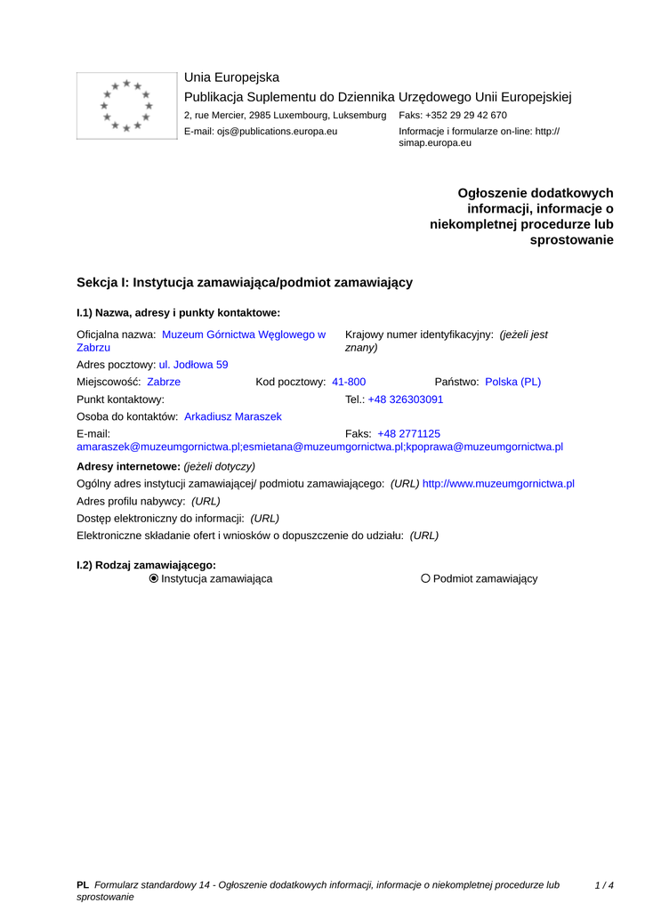 Unia Europejska Publikacja Suplementu do Dziennika Urzędowego Unii Europejskiej 2, rue Mercier, 2985 Luxembourg, Luksemburg Faks: +352 29 29 42 670 E-mail: [email protected] Informacje i formularze on-line: http:// simap.europa.eu Ogłoszenie dodatkowych informacji, informacje o niekompletnej procedurze lub sprostowanie Sekcja I: Instytucja zamawiająca/podmiot zamawiający I.1) Nazwa, adresy i punkty kontaktowe: Oficjalna nazwa: Muzeum Górnictwa Węglowego w Zabrzu Krajowy numer identyfikacyjny: (jeżeli jest znany) _____ Adres pocztowy: ul. Jodłowa 59 Miejscowość: Zabrze Kod pocztowy: 41-800 Punkt kontaktowy: _____ Państwo: Polska (PL) Tel.: +48 326303091 Osoba do kontaktów: Arkadiusz Maraszek E-mail: Faks: +48 2771125 [email protected];[email protected];[email protected] Adresy internetowe: (jeżeli dotyczy) Ogólny adres instytucji zamawiającej/ podmiotu zamawiającego: (URL) http://www.muzeumgornictwa.pl Adres profilu nabywcy: (URL) _____ Dostęp elektroniczny do informacji: (URL) _____ Elektroniczne składanie ofert i wniosków o dopuszczenie do udziału: (URL) _____ I.2) Rodzaj zamawiającego: Instytucja zamawiająca Podmiot zamawiający PL Formularz standardowy 14 - Ogłoszenie dodatkowych informacji, informacje o niekompletnej procedurze lub sprostowanie 1/4 Sekcja II: Przedmiot zamówienia II.1.1) Nazwa nadana zamówieniu: Sukcesywne dostawy materiałów elektrycznych dla potrzeb Muzeum Górnictwa Węglowego w Zabrzu ZP/16/ MGW/2015; Zadanie 1: Sukcesywne dostawy materiałów elektrycznych dla potrzeb Muzeum Górnictwa Węglowego w Zabrzu; Zadanie 2 „Sukcesywne dostawy materiałów elektrycznych - górniczych dla potrzeb Muzeum Górnictwa Węglowego w Zabrzu. II.1.2) Krótki opis zamówienia lub zakupu: (podano w pierwotnym ogłoszeniu) 1.Przedmiotem zamówienia są: Sukcesywne dostawy materiałów elektrycznych dla potrzeb Muzeum Górnictwa Węglowego w Zabrzu Zadanie 1: Sukcesywne dostawy materiałów elektrycznych dla potrzeb Muzeum Górnictwa Węglowego w Zabrzu Zamówienie będzie realizowane po cenach jednostkowych zadeklarowanych w ofercie przedstawionych przez wykonawcę – stanowiącym załącznik nr 1 do niniejszej umowy - do wysokości środków budżetowych zabezpieczonych na realizację powyższego zadania jeżeli nastąpi to przed dniem 31.03.2016 r., tj. do kwoty brutto: 26.025,19 PLN brutto (słownie dwadzieścia sześć tysięcy dwadzieścia pięć złotych 19/100). Powyższa wartość ma charakter wartości maksymalnej. Zamawiający zastrzega sobie prawo do niewykorzystania pełnego zakresu umowy tj. do niewykorzystania pełnej wartości umowy, a wykonawcy nie przysługuje prawo do jakichkolwiek roszczeń z tego tytułu. Zadanie 2: „Sukcesywne dostawy materiałów elektrycznych - górniczych dla potrzeb Muzeum Górnictwa Węglowego w Zabrzu. Zamówienie będzie realizowane po cenach jednostkowych zadeklarowanych w ofercie przedstawionych przez wykonawcę. Wykonawca może złożyć ofertę na jedno lub dwa zadania. W przypadku jeśli Wykonawca składa ofertę na dwa zadania, wszystkie wymagane dokumenty wymienione w punkcie 5.2 SIWZ mogą być złożone raz lub oddzielnie dla każdego z zadań. II.1.3) Wspólny Słownik Zamówień (CPV) Główny przedmiot Słownik główny 31600000 Słownik uzupełniający (jeżeli dotyczy) PL Formularz standardowy 14 - Ogłoszenie dodatkowych informacji, informacje o niekompletnej procedurze lub sprostowanie 2/4 Sekcja IV: Procedura IV.1)Rodzaj procedury (podano w pierwotnym ogłoszeniu) Otwarta Ograniczona Ograniczona przyspieszona Negocjacyjna Negocjacyjna przyspieszona Dialog konkurencyjny Negocjacyjna z uprzednim ogłoszeniem Negocjacyjna bez uprzedniego ogłoszenia Negocjacyjna z publikacją ogłoszenia o zamówieniu Negocjacyjna bez publikacji ogłoszenia o zamówieniu Udzielenie zamówienia bez uprzedniej publikacji ogłoszenia o zamówieniu w Dzienniku Urzędowym Unii Europejskiej IV.2)Informacje administracyjne IV.2.1)Numer referencyjny: (podano w pierwotnym ogłoszeniu) ZP/16/MGW/2015 IV.2.2)Dane referencyjne ogłoszenia w przypadku ogłoszeń przesłanych drogą elektroniczną: Pierwotne ogłoszenie przesłane przez eNotices TED eSender Login: ENOTICES_MGWZ Dane referencyjne ogłoszenia: 2015-023110 rok i numer dokumentu IV.2.3)Ogłoszenie, którego dotyczy niniejsza publikacja: Numer ogłoszenia w Dz.U.: 2015/S 037-062921 z dnia: 21/02/2015 (dd/mm/rrrr) IV.2.4)Data wysłania pierwotnego ogłoszenia: 18/02/2015 (dd/mm/rrrr) PL Formularz standardowy 14 - Ogłoszenie dodatkowych informacji, informacje o niekompletnej procedurze lub sprostowanie 3/4 Sekcja VI: Informacje uzupełniające VI.1) Ogłoszenie dotyczy: Procedury niepełnej Sprostowania Informacji dodatkowych VI.2) Informacje na temat niepełnej procedury udzielenia zamówienia: Postępowanie o udzielenie zamówienia zostało przerwane Postępowanie o udzielenie zamówienia uznano za nieskuteczne Zamówienia nie udzielono Zamówienie może być przedmiotem ponownej publikacji VI.3) Informacje do poprawienia lub dodania : VI.3.1) Zmiana oryginalnej informacji podanej przez instytucję zamawiającą Publikacja w witrynie TED niezgodna z oryginalną informacją, przekazaną przez instytucję zamawiającą Oba przypadki VI.3.2) W ogłoszeniu pierwotnym W odpowiedniej dokumentacji przetargowej (więcej informacji w odpowiedniej dokumentacji przetargowej) W obu przypadkach (więcej informacji w odpowiedniej dokumentacji przetargowej) VI.3.3) Tekst, który należy poprawić w pierwotnym ogłoszeniu Miejsce, w którym znajduje się Zamiast: zmieniany tekst: VI.3.4) Daty, które należy poprawić w pierwotnym ogłoszeniu Miejsce, w którym znajdują się Zamiast: zmieniane daty: 01/04/2015 Godzina: 10:00 IV.3.4) Termin składania ofert lub (dd/mm/rrrr) wniosków o dopuszczenie do udziału w postępowaniu. Miejsce, w którym znajdują się zmieniane daty: IV.3.8) Warunki otwarcia ofert Zamiast: 01/04/2015 Godzina: 10:00 (dd/mm/rrrr) Powinno być: Powinno b