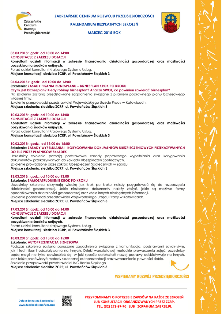 ZABRZAŃSKIE CENTRUM ROZWOJU PRZEDSIĘBIORCZOŚCI KALENDARIUM BEZPŁATNYCH SZKOLEŃ MARZEC 2015 ROK 03.03.2015r. godz. od 10:00 do 14:00 KONSULTACJE Z ZAKRESU DOTACJI Konsultant udzieli informacji w zakresie finansowania działalności gospodarczej oraz możliwości pozyskiwania środków unijnych. Porad udzieli konsultant Krajowego Systemu Usług. Miejsce konsultacji: siedziba ZCRP, ul. Powstańców Śląskich 3 06.03.2015 r. godz. od 10:00 do 13:00 Szkolenie: ZASADY PISANIA BIZNESPLANU – BIZNESPLAN KROK PO KROKU Czym jest biznesplan? Kiedy robimy biznesplan? Analiza SWOT, co powinien zawierać biznesplan? Na szkoleniu zostaną przedstawione zagadnienia związane z pisaniem poprawnego planu biznesowego własnej firmy. Szkolenie przeprowadzi przedstawiciel Wojewódzkiego Urzędu Pracy w Katowicach. Miejsce szkolenia: siedziba ZCRP, ul. Powstańców Śląskich 3 10.03.2015r. godz. od 10:00 do 14:00 KONSULTACJE Z ZAKRESU DOTACJI Konsultant udzieli informacji w zakresie finansowania działalności gospodarczej oraz możliwości pozyskiwania środków unijnych. Porad udzieli konsultant Krajowego Systemu Usług. Miejsce konsultacji: siedziba ZCRP, ul. Powstańców Śląskich 3 10.03.2015r. godz. od 13:00 do 15:00 Szkolenie: ZASADY WYPEŁNIANIA I KORYGOWANIA DOKUMENTÓW UBEZPIECZENIOWYCH PRZEKAZYWANYCH DO ZUS PRZEZ PŁATNIKÓW SKŁADEK Uczestnicy szkolenia poznają podstawowe zasady poprawnego wypełniania oraz korygowania dokumentów przekazywanych do Zakładu Ubezpieczeń Społecznych. Szkolenie prowadzone przez Zakład Ubezpieczeń Społecznych w Zabrzu. Miejsce szkolenia: siedziba ZCRP, ul. Powstańców Śląskich 3 13.03.2015r. godz. od 10:00 do 13:00 Szkolenie: SAMOZATRUDNIENIE KROK PO KROKU Uczestnicy szkolenia otrzymają wiedzę jak krok po kroku należy przygotować się do rozpoczęcia działalności gospodarczej. Jakie niezbędne dokumenty należy złożyć, jakie są możliwe formy opodatkowania działalności gospodarczej oraz wiele innych niezbędnych informacji. Szkolenie poprowadzi przedstawiciel Wojewódzkiego Urzędu Pracy w Katowicach. Miejsce szkolenia: siedziba ZCRP, ul. Powstańców Śląskich 3 17.03.2015r. godz. od 10:00 do 14:00 KONSULTACJE Z ZAKRESU DOTACJI Konsultant udzieli informacji w zakresie finansowania działalności gospodarczej oraz możliwości pozyskiwania środków unijnych. Porad udzieli konsultant Krajowego Systemu Usług. Miejsce konsultacji: siedziba ZCRP, ul. Powstańców Śląskich 3 18.03.2015r. godz. od 13:00 do 15:00 Szkolenie: AUTOPREZENTACJA BIZNESOWA Podczas szkolenia zostaną poruszone zagadnienia związane z komunikacją, podstawami savoir-vivre, jak i technikami oddziaływania na innych. Dzięki warsztatowej metodzie prowadzenia zajęć, uczestnicy będą mogli nie tylko dowiedzieć się, w jaki sposób całokształt naszej postawy oddziaływuje na innych, lecz także przećwiczyć metody skutecznej autoprezentacji oraz wzmacniania pewności siebie. Szkolenie przeprowadzi przedstawiciel ING Banku Śląskiego Miejsce szkolenie: siedziba ZCRP, ul. Powstańców Śląskich 3 Dołącz do nas na Facebooku! www.facebook.com/um.zcrp PRZYPOMINAMY O POTRZEBIE ZAPISÓW NA KAŻDE ZE SZKOLEO LUB KONSULTACJI ORGANIZOWANYCH PRZEZ ZCRP. TEL. (32) 273-97-70 LUB [email protected] 20.03.2015r. godz. od 10:00 do 13:00 Szkolenie: ZASADY PISANIA BIZNESPLANU – BIZNESPLAN KROK PO KROKU Czym jest biznesplan? Kiedy robimy biznesplan? Analiza SWOT, co powinien zawierać biznesplan? Na szkoleniu zostaną przedstawione zagadnienia związane z pisaniem poprawnego planu biznesowego własnej firmy. Szkolenie przeprowadzi przedstawiciel Wojewódzkiego Urzędu Pracy w Katowicach. Miejsce szkolenia: siedziba ZCRP, ul. Powstańców Śląskich 3 23.03.2015r. godz. od 13:00 do 15:00 Szkolenie: UMOWY O DZIEŁO Na szkoleniu zostaną omówione regulacje cywilno – prawne dotyczące umowy o dzieło, a także różnice pomiędzy umowami o dzieło, a umowami o pracę oraz umowami zlecenie, a umowami o dzieło. Szkolenie przeprowadzi przedstawiciel Kancelarii Prawnej. Miejsce szkolenia: siedziba ZCRP, ul. Powstańców Śląskich 3 24.03.2015r. godz. od 10:00 do 14:00 KONSULTACJE Z ZAKRESU DOTACJI Konsultant udzieli informacji w zakresie finansowania działalności gospodarczej oraz możliwości pozyskiwania środków unijnych. Porad udzieli konsultant Krajowego Systemu Usług. Miejsce konsultacji: siedziba ZCRP, ul. Powstańców Śląskich 3 26.03.2015r. godz. od 8:30 do 14:30 KONSULTACJE NT. WSPARCIA ZE ŚRODKÓW UNII EUROPEJSKIEJ MOBILNY PUNKT INFORMACYJNY W ZABRZU Mobilne Punkty Informacyjne to nowa usługa dostępna dla mieszkańców regionu oferowana przez pracowników Punktu Informacyjnego Funduszy Europejskich w Katowicach. Konsultanci będą udzielać bezpłatnych konsultacji w zakresie możliwości uzyskania wsparcia ze środków Unii Europejskiej w nowej perspektywie finansowej 2014 – 2020. Miejsce konsultacji: siedziba ZCRP, ul. Powstańców Śląskich 3 31.03.2015r. godz. od 10:00 do 14:00 KONSULTACJE Z ZAKRESU DOTACJI Konsultant udzieli informacji w zakresie finansowania działalności gospodarczej oraz możliwości pozyskiwania środków unijnych. Porad udzieli konsultant Krajowego Systemu Usług. Miejsce konsultacji: siedziba ZCRP, ul. Powstańców Śląskich 3 ZAPISZ SIĘ! ZADZWOO: (32) 273-97-70, NAPISZ: [email protected] ZAPRASZAMY DO SKORZYSTANIA Z BEZPŁATNYCH PORAD PRAWNYCH Z ZAKRESU PROWADZENIA DZIAŁALNOŚCI GOSPODARCZEJ. Godziny konsultacji: Poniedziałek 14:00 – 17:00 Piątek 7:30 – 10:30 Prosimy o wcześniejszą rejestrację telefoniczną (32) 273-97-70 Dołącz do nas na Facebooku! www.facebook.com/um.zcrp PRZYPOMINAMY O POTRZEBIE ZAPISÓW NA KAŻDE ZE SZKOLEO LUB KONSULTACJI ORGANIZOWANYCH PRZEZ ZCRP. TEL. (32) 273-97-70 LUB [email protected]