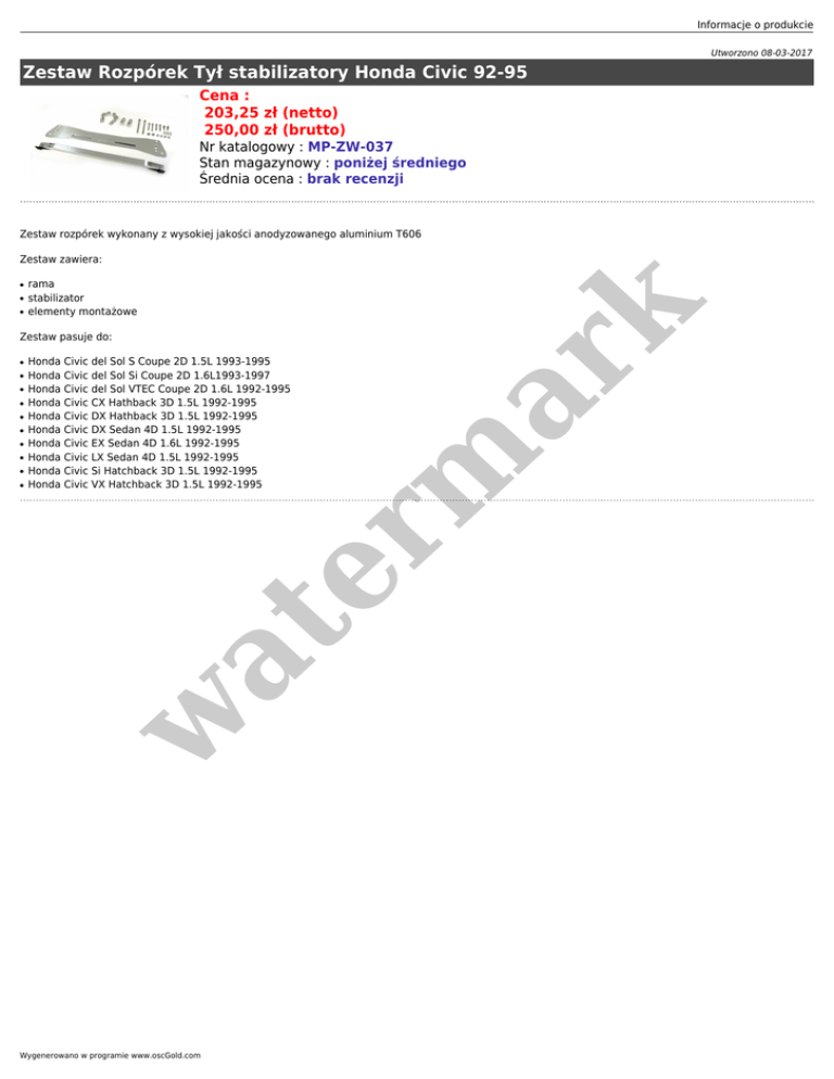 Informacje o produkcie Utworzono 08-03-2017 Zestaw Rozpórek Tył stabilizatory Honda Civic 92-95 Cena : 203,25 zł (netto) 250,00 zł (brutto) Nr katalogowy : MP-ZW-037 Stan magazynowy : poniżej średniego Średnia ocena : brak recenzji Zestaw rozpórek wykonany z wysokiej jakości anodyzowanego aluminium T606 ● ● ● rama stabilizator elementy montażowe Zestaw pasuje do: ● ● ● ● ● ● ● ● ● Honda Civic del Sol S Coupe 2D 1.5L 1993-1995 Honda Civic del Sol Si Coupe 2D 1.6L1993-1997 Honda Civic del Sol VTEC Coupe 2D 1.6L 1992-1995 Honda Civic CX Hathback 3D 1.5L 1992-1995 Honda Civic DX Hathback 3D 1.5L 1992-1995 Honda Civic DX Sedan 4D 1.5L 1992-1995 Honda Civic EX Sedan 4D 1.6L 1992-1995 Honda Civic LX Sedan 4D 1.5L 1992-1995 Honda Civic Si Hatchback 3D 1.5L 1992-1995 Honda Civic VX Hatchback 3D 1.5L 1992-1995 w at ● er m ar k Zestaw zawiera: Wygenerowano w programie www.oscGold.com