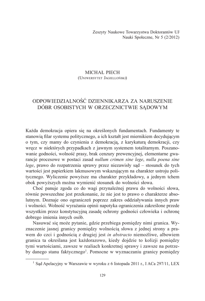 Zeszyty Naukowe Towarzystwa Doktorantów UJ Nauki Społeczne, Nr 5 (2/2012) Michał Piech (Uniwersytet Jagielloński) Odpowiedzialność dziennikarza za naruszenie dóbr osobistych w orzecznictwie sądowym Każda demokracja opiera się na określonych fundamentach. Fundamenty te stanowią filar systemu politycznego, a ich kształt jest miernikiem decydującym o tym, czy mamy do czynienia z demokracją, z karykaturą demokracji, czy wręcz w niektórych przypadkach z jawnym systemem totalitarnym. Poszanowanie godności, wolność prasy, brak cenzury prewencyjnej, elementarne gwarancje procesowe w postaci zasad nullum crimen sine lege, nulla poena sine lege, prawo do rozpatrzenia sprawy przez niezawisły sąd – stosunek do tych wartości jest papierkiem lakmusowym wskazującym na charakter ustroju politycznego. Wyliczenie powyższe ma charakter przykładowy, a jednym tchem obok powyższych można wymienić stosunek do wolności słowa. Choć panuje zgoda co do wagi przynależnej prawu do wolności słowa, równie powszechne jest przekonanie, że nie jest to prawo o charakterze absolutnym. Doznaje ono ograniczeń poprzez zakres oddziaływania innych praw i wolności. Wolność wyrażania opinii napotyka ograniczenia zakreślone przede wszystkim przez konstytucyjną zasadę ochrony godności człowieka i ochronę dobrego imienia innych osób. Nasuwać się może pytanie, gdzie przebiega pomiędzy nimi granica. Wyznaczenie jasnej granicy pomiędzy wolnością słowa z jednej strony a prawem do czci i godnością z drugiej jest in abstracto niemożliwe, albowiem granica ta określana jest każdorazowo, kiedy dojdzie to kolizji pomiędzy tymi wartościami, zawsze w realiach konkretnej sprawy i zawsze na potrzeby danego stanu faktycznego1. Pomocne w wyznaczaniu granicy pomiędzy 1 Sąd Apelacyjny w Warszawie w wyroku z 6 listopada 2011 r., I ACa 297/11, LEX 129 Michał Piech wolnością słowa a poszanowaniem godności i prawem do dobrego imienia jest orzecznictwo sądowe. Chyba nigdzie nie uwidacznia się tak jak w działalności dziennikarskiej konflikt pomiędzy prawem do wolności słowa a ochroną dobrego imienia osób będących „bohaterami” publikacji dziennikarzy. Znalazło to swoje odbicie w orzecznictwie sądów, wielokrotnie zajmujących się tą kwestią. W Polsce ochrona godności, dobrego imienia i czci konkretyzowana jest na gruncie prawa cywilnego2. Stosowne przepisy kodeksu cywilnego3 nakładają sankcje za naruszenie w wypowiedziach dóbr osobistych jednostki, dając jej możliwość wytoczenia powództwa o naruszenie dóbr osobistych w oparciu o przepisy prawa cywilnego. Regulacje te dają każdemu prawo do poszukiwania ochrony prawnej wówczas, gdy wypowiedzi innych osób przestają stanowić realizację wolności jednostki i wkraczają w prawnie chronione dobra. Na gruncie kodeksu cywilnego przyjmuje się, że wystarczające do stwierdzenia naruszenia dobra osobistego jest ustalenie, że określona wypowiedź mogła choćby potencjalnie wywołać negatywną ocenę osoby domagającej się ochrony swoich dóbr4. Przy czym o zniesławiającym charakterze wypowiedzi decyduje opinia społeczna, znajdująca wyraz w poglądach ludzi rozsądnie i uczciwie myślących. Należy zatem badać każdorazowo, czy określona wypowiedź mogła nie tylko u adresata, ale u przeciętnego, rozsądnie zachowującego się człowieka wywołać negatywne oceny i odczucia5. Nie jest zatem miarodajny wyłącznie stan uczuć oraz miara indywidualnej wrażliwości adresata wypowiedzi, lecz także kontekst społeczny, a zwłaszcza odbiór przypisywanych zachowań w danym środowisku6. Ocena, czy w konkretnej sytuacji naruszenie dobra osobistego rzeczywiście nastąpiło, nie może być dokonywana według miary indywidualnej wrażliwości (ocena nr 1027929 stwierdził, że ranga obu praw: prawa do wolności słowa i prawa do ochrony czci, ma być jednakowa, z czego ma nadto wynikać, że kolizja pomiędzy nimi winna być rozwiązywana zawsze w okolicznościach konkretnej sprawy. Jednak prawo do wolności słowa nie może zostać nadużyte kosztem praw osobistych. 2 Wyrok Sądu Najwyższego z 7 listopada 2002 r., V CKN 1493/00, LEX nr 57238. 3 Ustawa z 23 kwietnia 1964 r. – Kodeks cywilny (DzU Nr 16, poz. 93 z późn. zm.). 4 Wyrok Sądu Apelacyjnego w Warszawie z 12 stycznia 2012 r., VI ACa 961/11, LEX nr 1214976. 5 Wyrok Sądu Najwyższego z 8 marca 2012 r., V CSK 109/11, LEX nr 1169352; wyrok Sądu Apelacyjnego w Łodzi z 28 sierpnia 1996 r., I ACr 341/96; wyrok Sądu Najwyższego z 6 października 1969 r., I CR 305/69, LEX nr 6576. 6 Wyrok Sądu Apelacyjnego w Krakowie z 28 października 2010 r., I ACa 908/10, LEX nr 743278. 130 Odpowiedzialność dziennikarza... subiektywna) zainteresowanego, ta bowiem może być szczególnie duża ze względu na cechy osobowe (na przykład szczególna drażliwość i przewrażliwienie)7. Co istotne, każdą wypowiedź, co do której podnoszony jest zarzut naruszenia dóbr osobistych, należy badać w kontekście sytuacyjnym, a definicja słownikowa poszczególnych sformułowań ma jedynie znaczenie posiłkowe8. Nawet prawdziwość informacji zawartych w materiale prasowym nie zawsze wyłącza bezprawność działania dziennikarza, istotne znaczenie mają bowiem właściwa forma i sposób ujęcia wypowiedzi dziennikarskiej9. Dobro osobiste może zostać naruszone całą treścią publikacji i jej sensem, a nie tylko konkretnymi sformułowaniami. Możliwe jest naruszenie dobra osobistego treścią publikacji prasowej, z której wynikają jednoznaczne sugestie co do nagannego moralnie postępowania osoby wskazanej w tej publikacji z imienia i nazwiska10. Za naruszające dobra osobiste mogą też być uznane kompozycja artykułu prasowego, tytuły, podtytuły, zdjęcia, o ile ich dobór i układ tworzy nieprawdziwy, godzący w te dobra obraz osoby, której dotyczy11. Fakt zamieszczenia dopuszczalnej i rzetelnej krytyki w materiale opublikowanym w środku gazety n