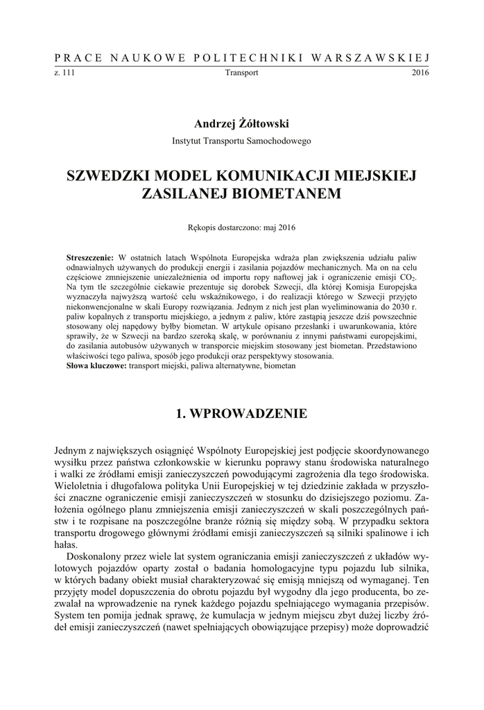 13. Gis 'G! A., Grzelak P., L.: Biomethane as a fuel for city transport. Journal of Kones / Vol. 19,