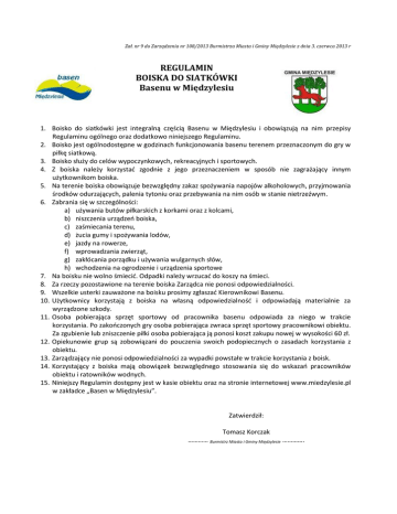 Zał. nr 9 do Zarządzenia nr 108/2013 Burmistrza Miasta i Gminy Międzylesie z dnia 3. czerwca 2013 r REGULAMIN BOISKA DO SIATKÓWKI Basenu w Międzylesiu 1. Boisko do siatkówki jest integralną częścią Basenu w Międzylesiu i obowiązują na nim przepisy Regulaminu ogólnego oraz dodatkowo niniejszego Regulaminu. 2. Boisko jest ogólnodostępne w godzinach funkcjonowania basenu terenem przeznaczonym do gry w piłkę siatkową. 3. Boisko służy do celów wypoczynkowych, rekreacyjnych i sportowych. 4. Z boiska należy korzystać zgodnie z jego przeznaczeniem w sposób nie zagrażający innym użytkownikom boiska. 5. Na terenie boiska obowiązuje bezwzględny zakaz spożywania napojów alkoholowych, przyjmowania środków odurzających, palenia tytoniu oraz przebywania na nim osób w stanie nietrzeźwym. 6. Zabrania się w szczególności: a) używania butów piłkarskich z korkami oraz z kolcami, b) niszczenia urządzeń boiska, c) zaśmiecania terenu, d) żucia gumy i spożywania lodów, e) jazdy na rowerze, f) wprowadzania zwierząt, g) zakłócania porządku i używania wulgarnych słów, h) wchodzenia na ogrodzenie i urządzenia sportowe 7. Na boisku nie wolno śmiecić. Odpadki należy wrzucać do koszy na śmieci. 8. Za rzeczy pozostawione na terenie boiska Zarządca nie ponosi odpowiedzialności. 9. Wszelkie usterki zauważone na boisku prosimy zgłaszać Kierownikowi Basenu. 10. Użytkownicy korzystają z boiska na własną odpowiedzialność i odpowiadają materialnie za wyrządzone szkody. 11. Osoba pobierająca sprzęt sportowy od pracownika basenu odpowiada za niego w trakcie korzystania. Po zakończonych gry osoba pobierająca zwraca sprzęt sportowy pracownikowi obiektu. Za zgubienie lub zniszczenie piłki osoba pobierająca ją ponosi koszt zakupu nowej w wysokości 60 zł. 12. Opiekunowie grup są zobowiązani do pouczenia swoich podopiecznych o zasadach korzystania z obiektu. 13. Zarządzający nie ponosi odpowiedzialności za wypadki powstałe w trakcie korzystania z boisk. 14. Korzystający z boiska mają obowiązek bezwzględnego stosowania się do wskazań pracowników obiektu i ratowników wodnych. 15. Niniejszy Regulamin dostępny jest w kasie obiektu oraz na stronie internetowej www.miedzylesie.pl w zakładce „Basen w Międzylesiu”. Zatwierdził: Tomasz Korczak ………… Burmistrz Miasta i Gminy Międzylesie ………….