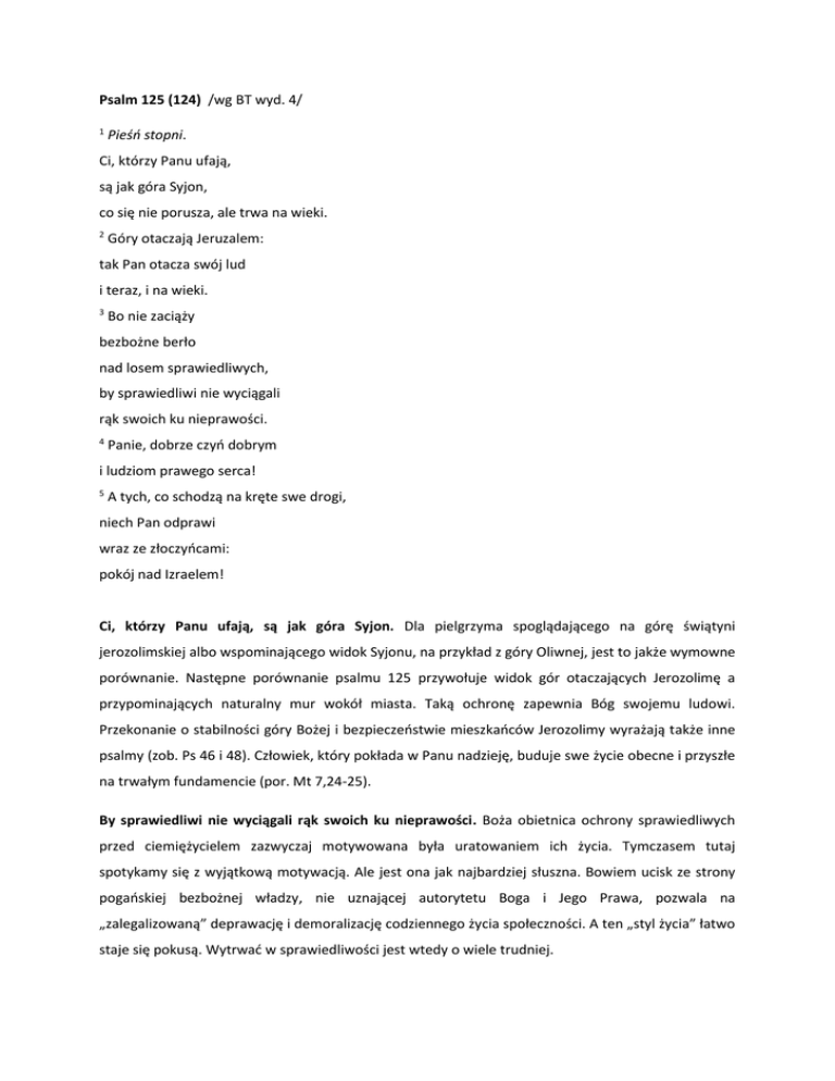 Psalm 125 (124) /wg BT wyd. 4/ 1 Pieśń stopni. Ci, którzy Panu ufają, są jak góra Syjon, co się nie porusza, ale trwa na wieki. 2 Góry otaczają Jeruzalem: tak Pan otacza swój lud i teraz, i na wieki. 3 Bo nie zaciąży bezbożne berło nad losem sprawiedliwych, by sprawiedliwi nie wyciągali rąk swoich ku nieprawości. 4 Panie, dobrze czyń dobrym i ludziom prawego serca! 5 A tych, co schodzą na kręte swe drogi, niech Pan odprawi wraz ze złoczyńcami: pokój nad Izraelem! Ci, którzy Panu ufają, są jak góra Syjon. Dla pielgrzyma spoglądającego na górę świątyni jerozolimskiej albo wspominającego widok Syjonu, na przykład z góry Oliwnej, jest to jakże wymowne porównanie. Następne porównanie psalmu 125 przywołuje widok gór otaczających Jerozolimę a przypominających naturalny mur wokół miasta. Taką ochronę zapewnia Bóg swojemu ludowi. Przekonanie o stabilności góry Bożej i bezpieczeństwie mieszkańców Jerozolimy wyrażają także inne psalmy (zob. Ps 46 i 48). Człowiek, który pokłada w Panu nadzieję, buduje swe życie obecne i przyszłe na trwałym fundamencie (por. Mt 7,24-25). By sprawiedliwi nie wyciągali rąk swoich ku nieprawości. Boża obietnica ochrony sprawiedliwych przed ciemiężycielem zazwyczaj motywowana była uratowaniem ich życia. Tymczasem tutaj spotykamy się z wyjątkową motywacją. Ale jest ona jak najbardziej słuszna. Bowiem ucisk ze strony pogańskiej bezbożnej władzy, nie uznającej autorytetu Boga i Jego Prawa, pozwala na „zalegalizowaną” deprawację i demoralizację codziennego życia społeczności. A ten „styl życia” łatwo staje się pokusą. Wytrwać w sprawiedliwości jest wtedy o wiele trudniej. Panie, dobrze czyń dobrym … Modlitwa jest zgodna z poczuciem sprawiedliwości. Zawiera prośbę o Boże błogosławieństwo dla dobrych i prawych, a złoczyńców i innych, którzy nie chodzą Bożymi drogami, Pan ma odprawić. Stworzy to warunki dla życia pełnego pokoju dla ludu Izraela. Uczniowie Jezusa proszą także o pokój dla siebie, dla Kościoła, dla świata. Modlitwa ta znajdzie swój kres i spełnienie w czasach ostatecznych. Panie Boże, obdarz pokojem ufających Tobie. Przez Chrystusa Pana naszego. Amen. o. Michał Baranowski OFMConv