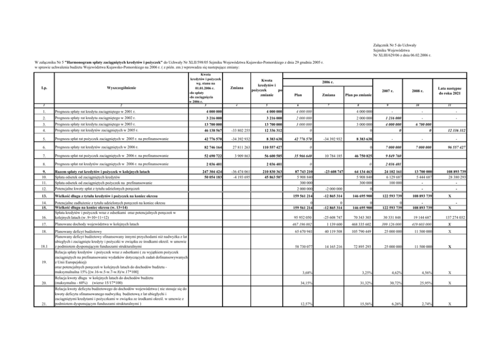 Załącznik Nr 5 do Uchwały Sejmiku Województwa Nr XLIII/629/06 z dnia 06.02.2006 r. W załączniku Nr 5 "Harmonogram spłaty zaciągniętych kredytów i pożyczek" do Uchwały Nr XLII/598/05 Sejmiku Województwa Kujawsko-Pomorskiego z dnia 29 grudnia 2005 r. w sprawie uchwalenia budżetu Województwa Kujawsko-Pomorskiego na 2006 r. ( z późn. zm.) wprowadza się nastepujące zmiany: Lp. 1 Wyszczególnienie 2 Kwota kredytów i pożyczek wg. stanu na 01.01.2006 r. -do spłaty -do zaciągnięcia w 2006 r. Zmiana 3 4 Kwota kredytów i pożyczek po zmianie 2006 r. Plan Zmiana 7 Plan po zmianie 8 2007 r. 2008 r. Lata następne do roku 2021 9 10 11 5 6 1. Prognoza spłaty rat kredytu zaciągniętego w 2001 r. 4 000 000 4 000 000 4 000 000 4 000 000 - - - 2. Prognoza spłaty rat kredytu zaciągniętego w 2002 r. 3 216 000 3 216 000 2 000 000 2 000 000 1 216 000 - - 6 700 000 3. Prognoza spłaty rat kredytu zaciągniętego w 2003 r. 13 700 000 13 700 000 3 000 000 3 000 000 4 000 000 4. Prognoza spłaty rat kredytów zaciągniętych w 2005 r. 46 138 567 -33 802 255 12 336 312 0 0 0 5. Prognoza spłat rat pożyczek zaciągniętych w 2005 r. na prefinansowanie 42 776 570 -34 392 932 8 383 638 42 776 570 6. Prognoza spłaty rat kredytów zaciągniętych w 2006 r. 82 746 164 27 811 263 110 557 427 0 7. Prognoza spłat rat pożyczek zaciągniętych w 2006 r. na prefinansowanie 52 690 722 3 909 863 56 600 585 35 966 640 2 036 401 0 -36 474 061 -4 193 695 210 830 363 45 863 507 87 743 210 5 908 840 300 000 8. Prognoza spłat rat kredytów zaciągniętych w 2006 r. na prefinansowanie 9. 10. 11. Razem spłaty rat kredytów i pożyczek w kolejnych latach Spłata odsetek od zaciągniętych kredytów Spłata odsetek od zaciągniętych pożyczek na prefinansowanie 2 036 401 247 304 424 50 054 183 -34 392 932 8 383 638 10 784 185 0 2 036 401 -23 608 747 64 134 463 5 908 840 300 000 0 12 336 312 - - - 0 7 000 000 7 000 000 96 557 427 46 750 825 9 849 760 24 102 161 6 129 687 100 000 13 700 000 5 444 687 - 108 893 739 28 380 293 - 12. Potencjalne kwoty spłat z tytułu udzielonych poręczeń 2 000 000 -2 000 000 0 13. Wielkość długu z tytułu kredytów i pożyczek na koniec okresu 159 561 214 -12 865 314 146 695 900 122 593 739 108 893 739 X 14. 15. 0 159 561 214 0 -12 865 314 0 146 695 900 0 122 593 739 108 893 739 X 16. Potencjalne zadłużenie z tytułu udzielonych poręczeń na koniec okresu Wielkość długu na koniec okresu (w. 13+14) Spłata kredytów i pożyczek wraz z odsetkami oraz potencjalnych poręczeń w kolejnych latach (w .9+10+11+12) 95 952 050 -25 608 747 70 343 303 30 331 848 19 144 687 17. Planowane dochody województwa w kolejnych latach 467 196 002 1 139 600 468 335 602 399 126 000 419 603 000 X 18. Planowany deficyt budżetowy Planowany deficyt budżetowy sfinansowany innymi przychodami niż nadwyżka z lat ubiegłych i zaciągnięte kredyty i pożyczki w związku ze środkami określ. w umowie z podmiotem dysponującym funduszami strukturalnymi Relacja spłaty kredytów i pożyczek wraz z odsetkami ( za wyjątkiem pożyczek zaciągniętych na prefinansowanie wydatków dotyczących zadań dofinansowywanych z Unii Europejskiej) oraz potencjalnych poręczeń w kolejnych latach do dochodów budżetu maksymalnalna 15% [(w.16-w.5-w.7-w.8)/w.17*100] 65 670 941 40 119 508 105 790 449 25 000 000 11 500 000 X 58 730 077 14 165 216 72 895 293 25 000 000 11 500 000 X 18.1 19. - - 137 274 032 3,68% 3,25% 4,62% 4,56% X 20. Relacja kwoty długu w kolejnych latach do dochodów budżetu (maksymalna - 60%) (wiersz 15/17*100) 34,15% 31,32% 30,72% 25,95% X 21. Relacja kwoty deficytu budżetowego do dochodów województwa ( nie stosuje się do kwoty deficytu sfinansowanego nadwyżką budżetową z lat ubiegłychi i zaciągniętymi kredytami i pożyczkami w związku ze środkami określ. w umowie z podmiotem dysponującym funduszami strukturalnymi ) 12,57% 15,56% 6,26% 2,74% X