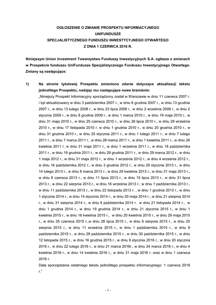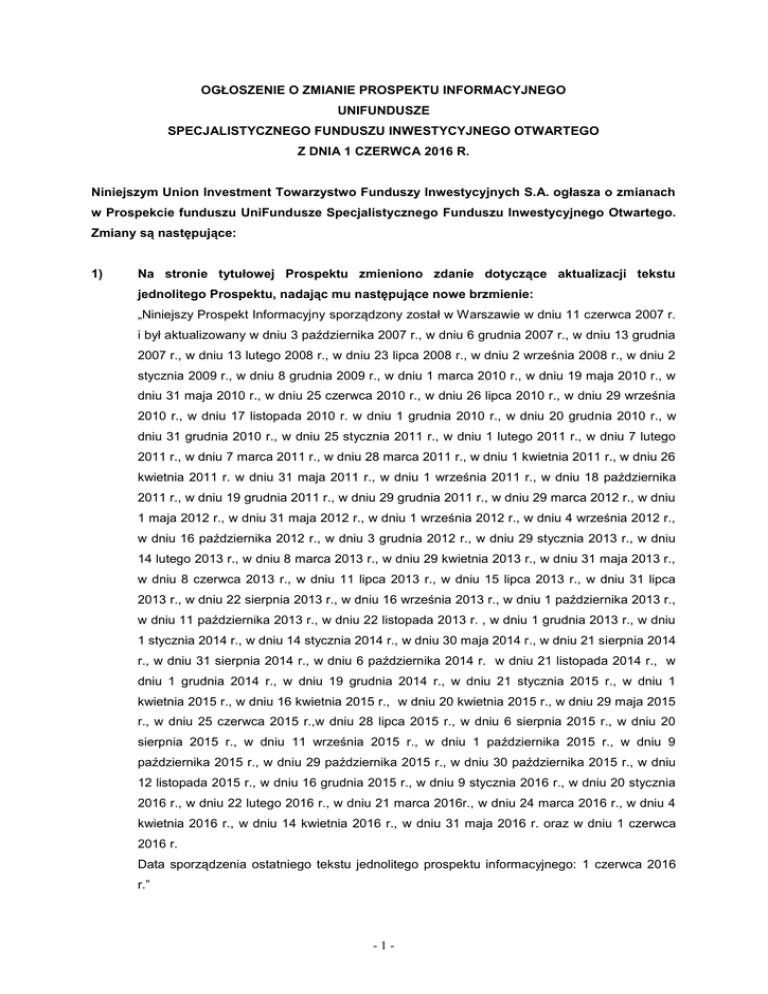 OGŁOSZENIE O ZMIANIE PROSPEKTU INFORMACYJNEGO UNIFUNDUSZE SPECJALISTYCZNEGO FUNDUSZU INWESTYCYJNEGO OTWARTEGO Z DNIA 1 CZERWCA 2016 R. Niniejszym Union Investment Towarzystwo Funduszy Inwestycyjnych S.A. ogłasza o zmianach w Prospekcie funduszu UniFundusze Specjalistycznego Funduszu Inwestycyjnego Otwartego. Zmiany są następujące: 1) Na stronie tytułowej Prospektu zmieniono zdanie dotyczące aktualizacji tekstu jednolitego Prospektu, nadając mu następujące nowe brzmienie: „Niniejszy Prospekt Informacyjny sporządzony został w Warszawie w dniu 11 czerwca 2007 r. i był aktualizowany w dniu 3 października 2007 r., w dniu 6 grudnia 2007 r., w dniu 13 grudnia 2007 r., w dniu 13 lutego 2008 r., w dniu 23 lipca 2008 r., w dniu 2 września 2008 r., w dniu 2 stycznia 2009 r., w dniu 8 grudnia 2009 r., w dniu 1 marca 2010 r., w dniu 19 maja 2010 r., w dniu 31 maja 2010 r., w dniu 25 czerwca 2010 r., w dniu 26 lipca 2010 r., w dniu 29 września 2010 r., w dniu 17 listopada 2010 r. w dniu 1 grudnia 2010 r., w dniu 20 grudnia 2010 r., w dniu 31 grudnia 2010 r., w dniu 25 stycznia 2011 r., w dniu 1 lutego 2011 r., w dniu 7 lutego 2011 r., w dniu 7 marca 2011 r., w dniu 28 marca 2011 r., w dniu 1 kwietnia 2011 r., w dniu 26 kwietnia 2011 r. w dniu 31 maja 2011 r., w dniu 1 września 2011 r., w dniu 18 października 2011 r., w dniu 19 grudnia 2011 r., w dniu 29 grudnia 2011 r., w dniu 29 marca 2012 r., w dniu 1 maja 2012 r., w dniu 31 maja 2012 r., w dniu 1 września 2012 r., w dniu 4 września 2012 r., w dniu 16 października 2012 r., w dniu 3 grudnia 2012 r., w dniu 29 stycznia 2013 r., w dniu 14 lutego 2013 r., w dniu 8 marca 2013 r., w dniu 29 kwietnia 2013 r., w dniu 31 maja 2013 r., w dniu 8 czerwca 2013 r., w dniu 11 lipca 2013 r., w dniu 15 lipca 2013 r., w dniu 31 lipca 2013 r., w dniu 22 sierpnia 2013 r., w dniu 16 września 2013 r., w dniu 1 października 2013 r., w dniu 11 października 2013 r., w dniu 22 listopada 2013 r. , w dniu 1 grudnia 2013 r., w dniu 1 stycznia 2014 r., w dniu 14 stycznia 2014 r., w dniu 30 maja 2014 r., w dniu 21 sierpnia 2014 r., w dniu 31 sierpnia 2014 r., w dniu 6 października 2014 r. w dniu 21 listopada 2014 r., w dniu 1 grudnia 2014 r., w dniu 19 grudnia 2014 r., w dniu 21 stycznia 2015 r., w dniu 1 kwietnia 2015 r., w dniu 16 kwietnia 2015 r., w dniu 20 kwietnia 2015 r., w dniu 29 maja 2015 r., w dniu 25 czerwca 2015 r.,w dniu 28 lipca 2015 r., w dniu 6 sierpnia 2015 r., w dniu 20 sierpnia 2015 r., w dniu 11 września 2015 r., w dniu 1 października 2015 r., w dniu 9 października 2015 r., w dniu 29 października 2015 r., w dniu 30 października 2015 r., w dniu 12 listopada 2015 r., w dniu 16 grudnia 2015 r., w dniu 9 stycznia 2016 r., w dniu 20 stycznia 2016 r., w dniu 22 lutego 2016 r., w dniu 21 marca 2016r., w dniu 24 marca 2016 r., w dniu 4 kwietnia 2016 r., w dniu 14 kwietnia 2016 r., w dniu 31 maja 2016 r. oraz w dniu 1 czerwca 2016 r. Data sporządzenia ostatniego tekstu jednolitego prospektu informacyjnego: 1 czerwca 2016 r.” -1- 2) W treści Rozdziału III Prospektu w pkt 6.2.4 ppkt 2 otrzymuje następujące brzmienie: „W przypadku odkupienia od Uczestnika wszystkich Jednostek Uczestnictwa, Fundusz po 6 miesiącach od dnia odkupienia zamyka Subrejestr, chyba że Uczestnik zażąda wcześniejszego zamknięcia Subejestru. Zamknięcie Subejestru ma ten skutek, że w przypadku nabywania przez tego samego Uczestnika Funduszu Jednostek Uczestnictwa w Funduszu, Fundusz otwiera nowy Rejestr z nowym numerem identyfikacyjnym.” Zmiany wchodzą w życie w dniu ukazania się ogłoszenia. -2-
