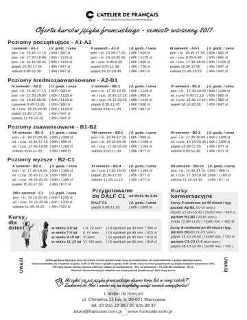 Oferta kursów języka francuskiego - semestr wiosenny 2017 Poziomy początkujące A1A2 I semestr A11 pon. i śr. 15.4517.15 pon. i śr. 17.3019.00 pon. i śr. 19.1520.45 piątek 15.3017.55 sobota 9.0011.30 | il. godz. / cena | 60h / 960 zł | 60h / 1129 zł | 60h / 1129 zł | 45h / 847 zł | 45h / 847 zł II semestr A12 pon. i śr. 15.4517.15 pon. i śr. 19.1520.45 wt. i czw. 8.009.30 piątek 9.0011.30 piątek 18.1020.35 | il. godz. / cena | 60h / 960 zł | 60h / 1129 zł | 60h / 960 zł | 45h / 720 zł | 45h / 847 zł III semestr A21 pon. i śr. 15.4517.15 wt. i czw. 8.009.30 wt. i czw. 17.3019.00 piątek 15.3017.55 sobota 11.4514.15 | il. godz. / cena | 60h / 960 zł | 60h / 960 zł | 60h / 1129 zł | 45h / 847 zł | 45h / 847 zł | il. godz. / cena | 60h / 1129 zł | 60h / 960 zł | 60h / 1129 zł | 60h / 960 zł | 45h / 847 zł VI semestr B12 | il. godz. / cena pon. i śr. 17.3019.00 | 60h / 1129 zł wt. i czw. 9.4511.15 | 60h / 960 zł wt. i czw. 15.4517.15 | 60h / 960 zł piątek 18.1020.35 | 45h / 847 zł VIII semestr B21 pon. i śr. 15.4517.15 pon. i śr. 19.1520.45 wt. i czw. 17.3019.00 sobota 9.0011.30 | il. godz. / cena | 60h / 995 zł | 60h / 1169 zł | 60h / 1169 zł | 45h / 877 zł IX semestr B22 | il. godz. / cena pon. i śr. 17.3019.00 | 60h / 1169 zł wt. i czw. 19.1520.45 | 60h / 1169 zł piątek 15.3017.55 | 45h / 877 zł sobota 9.0011.30 | 45h / 877 zł XI semestr B24 wt. i czw 17.3019.00 piątek 15.3017.55 sobota 11.4514.15 | il. godz. / cena | 60h / 1169 zł | 45h / 877 zł | 45h / 877 zł XII semestr B2C1 pon. i śr. 15.4517.15 wt. i czw. 17.3019.00 sobota 11.4514.15 Poziomy średniozaawansowane A2B1 IV semestr A22 pon. i śr. 15.4517.15 pon. i śr. 17.3019.00 pon. i śr. 19.1520.45 czwartek 9.4513.00 wt. i czw. 19.1520.45 piątek 15.3017.55 sobota 11.4514.15 | il. godz. / cena | 60h / 960 zł | 60h / 1129 zł | 60h / 1129 zł | 60h / 960 zł | 60h / 1129 zł | 45h / 847 zł | 45h / 847 zł V semestr B11 pon. i śr. 17.3019.00 wt. i czw. 15.4517.15 wt. i czw. 19.1520.45 piątek 8.3011.45 sobota 9.0011.30 Poziomy zaawansowane B1B2 VII semestr B13 pon. i śr. 19.1520.45 wt. i czw. 15.4517.15 wt. i czw. 17.3019.00 sobota 9.0011.30 | il. godz. / cena | 60h / 1169 zł | 60h / 995 zł | 60h / 1169 zł | 45h / 995 zł Poziomy wyższe B2C1 X semestr B23 pon. i śr. 17.3019.00 wt. i czw. 15.4517.15 wt. i czw. 19.1520.45 piątek 15.3017.55 | il. godz. / cena | 60h / 1169 zł | 60h / 995 zł | 60h / 1169 zł | 45h / 877 zł XIII+ semestr C1 pon. i śr. 19.1520.45 wt. i czw. 19.1520.45 sobota 11.4514.15 | il. godz. / cena | 60h / 1229 zł | 60h / 1229 zł | 45h / 922 zł w wieku 35 lat w wieku 79 lat w wieku 810 lat w wieku 1113 lat Przygotowanie do DALF C1 od 20.01 do 9.06 Kursy konwersacyjne DALF C1 piątek 9.0011.30 | il. godz. / cena | 60h / 1500 zł kursy 3osobowe po 60 minut / tyg. poziom A2B1 (IVVI sem.) wtorek 12.0013.00 | 15x60 min. / 450 zł poziom B1B2 (VIIIX sem.) środa 12.0013.00 | 15x60 min. / 450 zł | 15 spotkań po 40 min. / 585 zł | 15 spotkań po 85 min. / 810 zł | 15 spotkań po 85 min. / 810 zł | 15 spotkań po 85 min. / 810 zł kursy 6osobowe po 90 minut / tyg. poziom B2C1 (XXII sem.) piątek 18.1019.40 | 15x90 min. / 750 zł I, II, IV sem. II, IV sem. VI sem. VI, XIII sem. poziom C1C2 (XIII plus sem.) piątek 18.1019.40 | 15x90 min. / 750 z Jedna godzina lekcyjna liczy 45 minut. Liczba godzin oraz cena są uzależnione od częstotliwości i godzin danego kursu. Od poniedziałku do czwartku w godz. 8.0017.00 oraz w piątki w godz. 8.0015.00, ceny kursów grupowych są objęte rabatem wysokości 15%. Od ceny kursu należy jeszcze odliczyc rabaty za kontynuację 5%, za polecenie 5% lub dla studenta 50 zł. Wartość skumulowanych rabatów nie może jednak przekroczyć 15% ceny kursu. Uczyłeś się już języka francuskiego dawno temu lub w innej szkole? Zadzwoń do Nas i umów się na bezpłatny audyt swoich umiejętności! L'atelier de français ul. Chmielna 21 lok. 5, 00021 Warszawa tel. 22 826 12 08 / 22 826 69 37 [email protected] www.francuski.com.pl UWAGI UWAGI Kursy dla dzieci | il. godz. / cena | 60h / 995 zł | 60h / 1169 zł | 45h / 877 zł