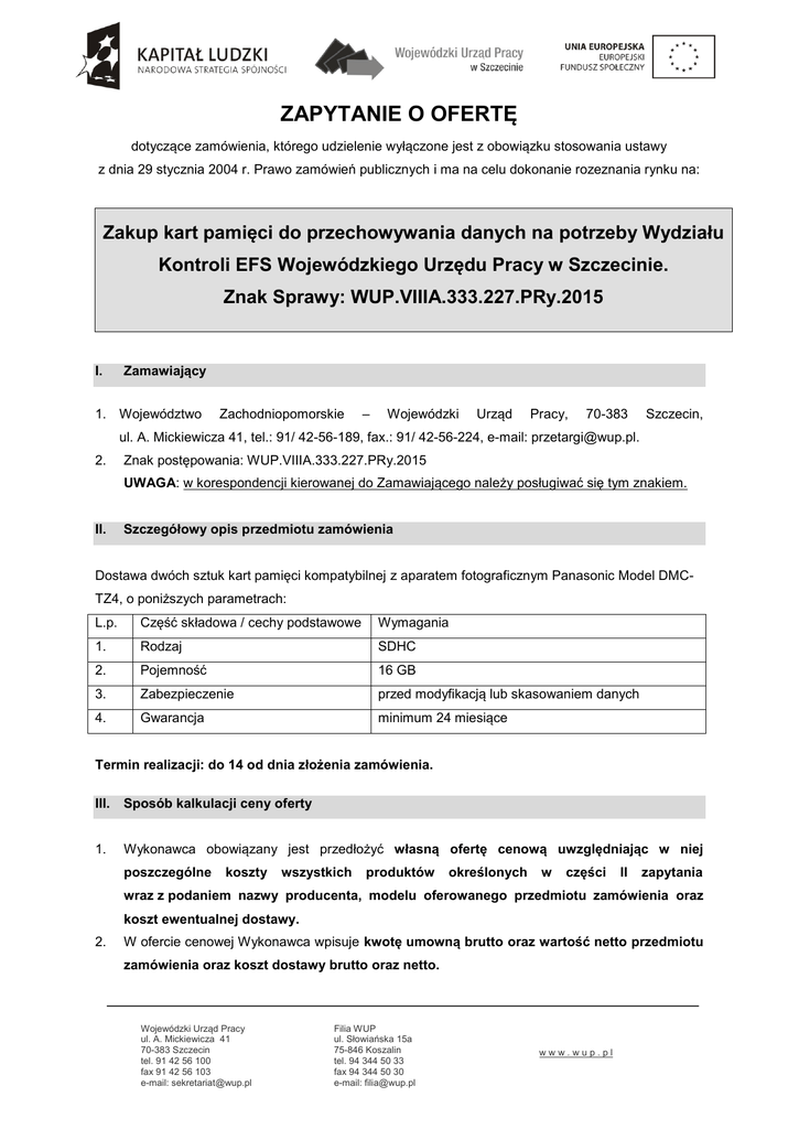 ZAPYTANIE O OFERTĘ dotyczące zamówienia, którego udzielenie wyłączone jest z obowiązku stosowania ustawy z dnia 29 stycznia 2004 r. Prawo zamówień publicznych i ma na celu dokonanie rozeznania rynku na: Zakup kart pamięci do przechowywania danych na potrzeby Wydziału Kontroli EFS Wojewódzkiego Urzędu Pracy w Szczecinie. Znak Sprawy: WUP.VIIIA.333.227.PRy.2015 I. Zamawiający 1. Województwo Zachodniopomorskie – Wojewódzki Urząd Pracy, 70-383 Szczecin, ul. A. Mickiewicza 41, tel.: 91/ 42-56-189, fax.: 91/ 42-56-224, e-mail: [email protected]. 2. Znak postępowania: WUP.VIIIA.333.227.PRy.2015 UWAGA: w korespondencji kierowanej do Zamawiającego należy posługiwać się tym znakiem. II. Szczegółowy opis przedmiotu zamówienia Dostawa dwóch sztuk kart pamięci kompatybilnej z aparatem fotograficznym Panasonic Model DMCTZ4, o poniższych parametrach: L.p. Część składowa / cechy podstawowe Wymagania 1. Rodzaj SDHC 2. Pojemność 16 GB 3. Zabezpieczenie przed modyfikacją lub skasowaniem danych 4. Gwarancja minimum 24 miesiące Termin realizacji: do 14 od dnia złożenia zamówienia. III. Sposób kalkulacji ceny oferty 1. Wykonawca obowiązany jest przedłożyć własną ofertę cenową uwzględniając w niej poszczególne koszty wszystkich produktów określonych w części II zapytania wraz z podaniem nazwy producenta, modelu oferowanego przedmiotu zamówienia oraz koszt ewentualnej dostawy. 2. W ofercie cenowej Wykonawca wpisuje kwotę umowną brutto oraz wartość netto przedmiotu zamówienia oraz koszt dostawy brutto oraz netto. Wojewódzki Urząd Pracy ul. A. Mickiewicza 41 70-383 Szczecin tel. 91 42 56 100 fax 91 42 56 103 e-mail: [email protected] Filia WUP ul. Słowiańska 15a 75-846 Koszalin tel. 94 344 50 33 fax 94 344 50 30 e-mail: [email protected] www.wup.pl 3. Wykonawca zobowiązany będzie do wystawienia faktury za realizację zamówienia, ze stawką podatku VAT obowiązującą na dzień składania faktury. Cena oferty musi być podana w PLN cyfrowo do dwóch miejsc po przecinku. Podana cena musi uwzględniać wszelkie koszty bezpośrednie, koszty pośrednie, upusty i rabaty, zniżki stosowane przez Wykonawcę oraz zysk. W cenie powinny być uwzględnione wszystkie podatki, ubezpieczenia, opłaty, itp., włącznie z podatkiem od towarów i usług – VAT. 4. Wszelkie rozliczenia między Zamawiającym a Wykonawcą związane z realizacją zamówienia publicznego, którego dotyczy niniejsze zapytanie będą prowadzone w walucie PLN. 5. Ceny określone przez Wykonawcę w ofercie cenowej nie będą zmieniane w toku realizacji zamówienia i nie będą podlegały waloryzacji, z wyjątkiem ewentualnej zmiany stawki podatku od towarów i usług . IV. Forma oferty. 1. Wykonawca obowiązany jest przedłożyć własną ofertę cenową. 2. Zamawiający dokona wyboru oferty na podstawie kryterium: cena – wyliczona w następujący sposób: najniższa łączna wartość umowna brutto C = --------------------------------------------------------------- x 100 pkt łączna wartość umowna brutto oferty badanej 3. Pytania należy kierować w godzinach pracy Urzędu od poniedziałku do piątku, w godz.: 7:30 – 15:30, na adres: Wojewódzki Urząd Pracy w Szczecinie, ul. A. Mickiewicza 41, 70-383 Szczecin, za pośrednictwem faksu: 91/ 42 56 224, bądź za pośrednictwem poczty elektronicznej na adres e-mail: [email protected]. V. Składanie i forma ofert. 1. Oferty należy składać w terminie do dnia 26 października 2015 r., przesyłając ofertę cenową pocztą elektroniczna na adres [email protected], faksem na nr 91 42 56 224 lub składając w siedzibie Zamawiającego: Wojewódzki Urząd Pracy w Szczecinie ul. A. Mickiewicza 41, 70-383 Szczecin, w Kancelarii – pok. 06. Kopertę lub temat wiadomości elektronicznej należy opisać następująco: Zakup kart pamięci do przechowywania danych na potrzeby Wydziału Kontroli EFS Wojewódzkiego Urzędu Pracy w Szczecinie. WUP.VIIIA.333.227.PRy.2015 Na kopercie, oprócz opisu jw. należy umieścić nazwę i adres Wykonawcy 2. Ofertom będą nadawane numery wg kolejności wpływu. 3. Za termin złożenia oferty uważa się termin jej dotarcia do Zamawiającego. 4. Zamawiający zastrzega możliwość nie rozpatrywania ofert złożonych po wyznaczonym terminie. 5. Na ofertę składają się następujące dokumenty: a) Oferta cenowa Wykonawcy. VI. Zawarcie umowy. 1. Podstawą realizacji zamówienia będzie zamówienie/zapotrzebowanie złożone przez Zamawiającego po wyborze oferty najkorzystniejszej. 2. Zamawiający dopuszcza możliwość osobistego odbioru towaru z terenu miasta Szczecin. 3. Niniejszy wybór zostanie dokonany na podstawie bilansu kosztu przedmiotu zamówienia oraz kosztu dostawy do siedziby Wojewódzkiego Urzędu pracy w Szczecinie, ul. A. Mickiewicza 41, 70-383 Szczecin. Przygotował: Piotr Rychłowski