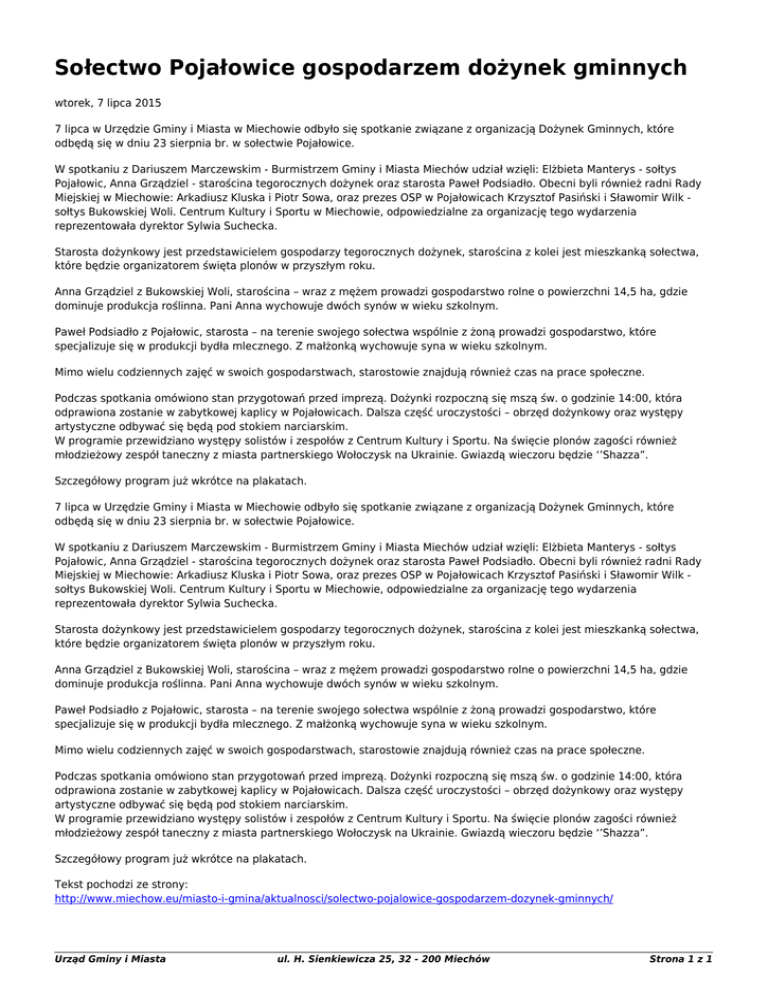 Sołectwo Pojałowice gospodarzem dożynek gminnych wtorek, 7 lipca 2015 7 lipca w Urzędzie Gminy i Miasta w Miechowie odbyło się spotkanie związane z organizacją Dożynek Gminnych, które odbędą się w dniu 23 sierpnia br. w sołectwie Pojałowice. W spotkaniu z Dariuszem Marczewskim - Burmistrzem Gminy i Miasta Miechów udział wzięli: Elżbieta Manterys - sołtys Pojałowic, Anna Grządziel - starościna tegorocznych dożynek oraz starosta Paweł Podsiadło. Obecni byli również radni Rady Miejskiej w Miechowie: Arkadiusz Kluska i Piotr Sowa, oraz prezes OSP w Pojałowicach Krzysztof Pasiński i Sławomir Wilk sołtys Bukowskiej Woli. Centrum Kultury i Sportu w Miechowie, odpowiedzialne za organizację tego wydarzenia reprezentowała dyrektor Sylwia Suchecka. Starosta dożynkowy jest przedstawicielem gospodarzy tegorocznych dożynek, starościna z kolei jest mieszkanką sołectwa, które będzie organizatorem święta plonów w przyszłym roku. Anna Grządziel z Bukowskiej Woli, starościna – wraz z mężem prowadzi gospodarstwo rolne o powierzchni 14,5 ha, gdzie dominuje produkcja roślinna. Pani Anna wychowuje dwóch synów w wieku szkolnym. Paweł Podsiadło z Pojałowic, starosta – na terenie swojego sołectwa wspólnie z żoną prowadzi gospodarstwo, które specjalizuje się w produkcji bydła mlecznego. Z małżonką wychowuje syna w wieku szkolnym. Mimo wielu codziennych zajęć w swoich gospodarstwach, starostowie znajdują również czas na prace społeczne. Podczas spotkania omówiono stan przygotowań przed imprezą. Dożynki rozpoczną się mszą św. o godzinie 14:00, która odprawiona zostanie w zabytkowej kaplicy w Pojałowicach. Dalsza część uroczystości – obrzęd dożynkowy oraz występy artystyczne odbywać się będą pod stokiem narciarskim. W programie przewidziano występy solistów i zespołów z Centrum Kultury i Sportu. Na święcie plonów zagości również młodzieżowy zespół taneczny z miasta partnerskiego Wołoczysk na Ukrainie. Gwiazdą wieczoru będzie ‘’Shazza”. Szczegółowy program już wkrótce na plakatach. 7 lipca w Urzędzie Gminy i Miasta w Miechowie odbyło się spotkanie związane z organizacją Dożynek Gminnych, które odbędą się w dniu 23 sierpnia br. w sołectwie Pojałowice. W spotkaniu z Dariuszem Marczewskim - Burmistrzem Gminy i Miasta Miechów udział wzięli: Elżbieta Manterys - sołtys Pojałowic, Anna Grządziel - starościna tegorocznych dożynek oraz starosta Paweł Podsiadło. Obecni byli również radni Rady Miejskiej w Miechowie: Arkadiusz Kluska i Piotr Sowa, oraz prezes OSP w Pojałowicach Krzysztof Pasiński i Sławomir Wilk sołtys Bukowskiej Woli. Centrum Kultury i Sportu w Miechowie, odpowiedzialne za organizację tego wydarzenia reprezentowała dyrektor Sylwia Suchecka. Starosta dożynkowy jest przedstawicielem gospodarzy tegorocznych dożynek, starościna z kolei jest mieszkanką sołectwa, które będzie organizatorem święta plonów w przyszłym roku. Anna Grządziel z Bukowskiej Woli, starościna – wraz z mężem prowadzi gospodarstwo rolne o powierzchni 14,5 ha, gdzie dominuje produkcja roślinna. Pani Anna wychowuje dwóch synów w wieku szkolnym. Paweł Podsiadło z Pojałowic, starosta – na terenie swojego sołectwa wspólnie z żoną prowadzi gospodarstwo, które specjalizuje się w produkcji bydła mlecznego. Z małżonką wychowuje syna w wieku szkolnym. Mimo wielu codziennych zajęć w swoich gospodarstwach, starostowie znajdują również czas na prace społeczne. Podczas spotkania omówiono stan przygotowań przed imprezą. Dożynki rozpoczną się mszą św. o godzinie 14:00, która odprawiona zostanie w zabytkowej kaplicy w Pojałowicach. Dalsza część uroczystości – obrzęd dożynkowy oraz występy artystyczne odbywać się będą pod stokiem narciarskim. W programie przewidziano występy solistów i zespołów z Centrum Kultury i Sportu. Na święcie plonów zagości również młodzieżowy zespół taneczny z miasta partnerskiego Wołoczysk na Ukrainie. Gwiazdą wieczoru będzie ‘’Shazza”. Szczegółowy program już wkrótce na plakatach. Tekst pochodzi ze strony: http://www.miechow.eu/miasto-i-gmina/aktualnosci/solectwo-pojalowice-gospodarzem-dozynek-gminnych/ Urząd Gminy i Miasta ul. H. Sienkiewicza 25, 32 - 200 Miechów Strona 1 z 1