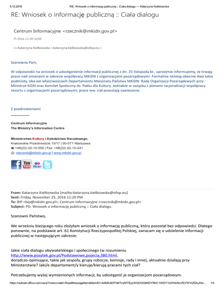 9.12.2016 RE: Wniosek o informację publiczną :: Ciała dialogu — Katarzyna Kiełbiowska RE: Wniosek o informację publiczną :: Ciała dialogu Centrum Informacyjne <[email protected]> Pt 2016‐12‐09 10:06 Do:Katarzyna Kiełbiowska <[email protected]>; Szanowna Pani, W odpowiedzi na wniosek o udostępnienie informacji publicznej z dn. 25 listopada br., uprzejmie informujemy, że trwają prace nad zmianami w zakresie współpracy MKiDN z organizacjami pozarządowymi. Formalnie istnieją obecnie dwa takie podmioty, oba we właściwościach Departamentu Mecenatu Państwa MKiDN: Rada Organizacji Pozarządowych przy Ministrze KiDN oraz Komitet Społeczny ds. Paktu dla Kultury. Jednakże w związku z planami racjonalizacji współpracy resortu z organizacjami pozarządowymi, prace ww. ciał pozostają zawieszone. Z pozdrowieniami _________ Centrum Informacyjne The Ministry's Information Centre Ministerstwo Kultury i Dziedzictwa Narodowego. Krakowskie Przedmieście 15/17 | 00071 Warszawa :+48(22) 4210555 | Fax: +48(22) 4210441 @: [email protected] | www.mkidn.gov.pl From: Katarzyna Kiełbiowska [mailto:[email protected]] Sent: Friday, November 25, 2016 12:20 PM To: BIP <[email protected]>; Centrum Informacyjne <[email protected]> Subject: PD: Wniosek o informację publiczną :: Ciała dialogu Szanowni Państwo, We wrześniu bieżącego roku złożyłam wniosek o informację publiczną, który pozostał bez odpowiedzi. Dlatego ponownie, na podstawie art. 61 Konstytucji Rzeczypospolitej Polskiej, zwracam się o udzielenie informacji publicznej w następującym zakresie: Jakie ciała dialogu obywatelskiego i społecznego (w rozumieniu hĥp://www.pozytek.gov.pl/Podstawowe,pojecia,380.html, doradczo‐opiniujące, takie jak zespoły, grupy robocze, komisje, rady i inne), aktualnie działają przy Ministerstwie? Jaki/e departament/y kieruje/kierują pracami tych ciał? Potrzebujemy wyżej wymienionych informacji, by udostępnić je organizacjom pozarządowym. https://outlook.office.com/owa/?viewmodel=ReadMessageItem&ItemID=AAMkADFhMTcyMTEyLWI2OGQtNDY5NC1iNDY1LWNkNmRjYWViZDkyNw… 1/3 9.12.2016 RE: Wniosek o informację publiczną :: Ciała dialogu — Katarzyna Kiełbiowska Uprzejmie proszę o udzielenie odpowiedzi na adres poczty elektronicznej: [email protected]. Z wyrazami szacunku, Katarzyna Kiełbiowska ‐‐ Ogólnopolska Federacja Organizacji Pozarządowych OFOP ul. Strzelecka 3 lok. 12, 03‐433 Warszawa tel. 884 209 313 www.ofop.eu, hĥp://repozytorium.ofop.eu/ hĥps://www.facebook.com/ofop.eu Od: Katarzyna Kiełbiowska Wysłane: 6 września 2016 18:26 Do: [email protected] Temat: Wniosek o informację publiczną :: Ciała dialogu Warszawa, dn. 06.09.2016 r. Katarzyna Kiełbiowska Ogólnopolska Federacja Organizacji Pozarządowych ul. Strzelecka 3/12 03433 Warszawa Ministerstwo Kultury i Dziedzictwa Narodowego [email protected] Na podstawie art. 61 Konstytucji Rzeczypospolitej Polskiej zwracam się o udzielenie informacji publicznej w następującym zakresie: Jakie ciała dialogu obywatelskiego i społecznego (w rozumieniu http://www.pozytek.gov.pl/Podstawowe,pojecia,380.html, doradczoopiniujące, takie jak zespoły, grupy robocze, komisje, rady i inne), aktualnie działają przy Ministerstwie? Jaki/e departament/y kieruje/kierują pracami tych ciał? Podstawowe pojęcia :: Ministerstwo Rodziny, Pracy i ... www.pozytek.gov.pl Podstawowe pojęcia Ministerstwo Rodziny, Pracy i Polityki Społecznej Departament Pożytku Publicznego Potrzebujemy wyżej wymienionych informacji, by udostępnić je organizacjom pozarządowym. Uprzejmie proszę o udzielenie odpowiedzi na adres poczty elektronicznej: [email protected]. Z wyrazami szacunku, Katarzyna Kiełbiowska https://outlook.office.com/owa/?viewmodel=ReadMessageItem&ItemID=AAMkADFhMTcyMTEyLWI2OGQtNDY5NC1iNDY1LWNkNmRjYWViZDkyNw… 2/3 9.12.2016 RE: Wniosek o informację publiczną :: Ciała dialogu — Katarzyna Kiełbiowska __________________________________________ Ogólnopolska Federacja Organizacji Pozarządowych OFOP ul. Strzelecka 3 lok. 12, 03‐433 Warszawa tel. 884 209 313 www.ofop.eu hĥps://www.facebook.com/ofop.eu hĥp://mapa3sektora.org https://outlook.office.com/owa/?viewmodel=ReadMessageItem&ItemID=AAMkADFhMTcyMTEyLWI2OGQtNDY5NC1iNDY1LWNkNmRjYWViZDkyNw… 3/3