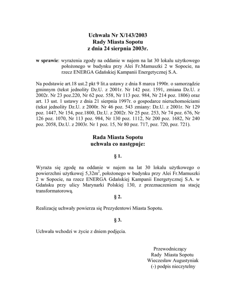Uchwała Nr X/143/2003 Rady Miasta Sopotu z dnia 24 sierpnia 2003r. w sprawie: wyraŜenia zgody na oddanie w najem na lat 30 lokalu uŜytkowego połoŜonego w budynku przy Alei Fr.Mamuszki 2 w Sopocie, na rzecz ENERGA Gdańskiej Kampanii Energetycznej S.A. Na podstawie art.18 ust.2 pkt 9 lit.a ustawy z dnia 8 marca 1990r. o samorządzie gminnym (tekst jednolity Dz.U. z 2001r. Nr 142 poz. 1591, zmiana Dz.U. z 2002r. Nr 23 poz.220, Nr 62 poz. 558, Nr 113 poz. 984, Nr 214 poz. 1806) oraz art. 13 ust. 1 ustawy z dnia 21 sierpnia 1997r. o gospodarce nieruchomościami (tekst jednolity Dz.U. z 2000r. Nr 46 poz. 543 zmiany: Dz.U. z 2001r. Nr 129 poz. 1447, Nr 154, poz.1800, Dz.U. z 2002r. Nr 25 poz. 253, Nr 74 poz. 676, Nr 126 poz. 1070, Nr 113 poz. 984, Nr 130 poz. 1112, Nr 200 poz. 1682, Nr 240 poz. 2058, Dz.U. z 2003r. Nr 1 poz. 15, Nr 80 poz. 717, poz. 720, poz. 721). Rada Miasta Sopotu uchwala co następuje: § 1. WyraŜa się zgodę na oddanie w najem na lat 30 lokalu uŜytkowego o powierzchni uŜytkowej 5,32m2, połoŜonego w budynku przy Alei Fr.Mamuszki 2 w Sopocie, na rzecz ENERGA Gdańskiej Kampanii Energetycznej S.A. w Gdańsku przy ulicy Marynarki Polskiej 130, z przeznaczeniem na stację transformatorową. § 2. Realizację uchwały powierza się Prezydentowi Miasta Sopotu. § 3. Uchwała wchodzi w Ŝycie z dniem podjęcia. Przewodniczący Rady Miasta Sopotu Wieczesław Augustyniak (-) podpis nieczytelny UZASADNIENIE ENERGA Gdańska Kampania Energetyczna S.A. na wniosek Gminy Miasta Sopotu wyraziła zgodę na przejęcie do eksploatacji stacji transformatorowej, aktualnie abonenckiej, znajdującej się w budynku przy Alei Fr.Mamuszki 2. Stacja transformatorowa została zaprojektowana z przeznaczeniem dla obsługi wszystkich uŜytkowników pomieszczeń znajdujących się w tym obiekcie. Urządzenia stacji są własnością spółki ANTRAKT- inwestora nadbudowy i rozbudowy budynku, a jednocześnie najemcy części powierzchni uŜytkowej i energia elektryczna dostarczana jest obecnie wyłącznie do pomieszczeń spółki. ENERGA jako profesjonalna firma zapewni sprawną i bezkolizyjną dostawę prądu wszystkim odbiorcom. ENERGA wyraziła zgodę na przejęcie w wieloletni najem pomieszczenia trafostacji od Gminy oraz odkupienie od spółki ANTRAKT urządzeń elektrycznych wyposaŜenia stacji. Prezydent Miasta Sopotu wnioskuje o wyraŜenie zgody na zawarcie z ENERGA Gdańską Kampanią Energetyczną S.A. umowy najmu na lat 30 lokalu uŜytkowego w budynku przy Alei Fr.Mamuszki 2 w Sopocie, przeznaczonego na stację transformatorową. Wiceprezydent Miasta Cezary Jakubowski (-) podpis nieczytelny
