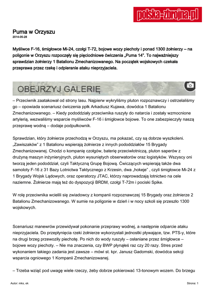 Puma w Orzyszu 2014-05-28 Myśliwce F-16, śmigłowce Mi-24, czołgi T-72, bojowe wozy piechoty i ponad 1300 żołnierzy – na poligonie w Orzyszu rozpoczęły się pięciodniowe ćwiczenia „Puma 14”. To najważniejszy sprawdzian żołnierzy 1 Batalionu Zmechanizowanego. Na początek wojskowych czekała przeprawa przez rzekę i odpieranie ataku nieprzyjaciela. – Przeciwnik zaatakował od strony lasu. Najpierw wykryliśmy pluton rozpoznawczy i ostrzelaliśmy go – opowiada scenariusz ćwiczenia ppłk Arkadiusz Kujawa, dowódca 1 Batalionu Zmechanizowanego. – Kiedy pododdziały przeciwnika ruszyły do natarcia i zostały wzmocnione artylerią, wezwaliśmy wsparcie myśliwców F-16 i śmigłowce bojowe. To one zabezpieczyły naszą przeprawę wodną – dodaje podpułkownik. Sprawdzian, który żołnierze przechodzą w Orzyszu, ma pokazać, czy są dobrze wyszkoleni. „Zawiszaków” z 1 Batalionu wspierają żołnierze z innych pododdziałów 15 Brygady Zmechanizowanej. Chodzi o kompanię czołgów, baterię przeciwlotniczą, pluton saperów z drużyną maszyn inżynieryjnych, pluton wysuniętych obserwatorów oraz logistyków. Wszyscy oni tworzą jeden pododdział, czyli Taktyczną Grupę Bojową. Ćwiczących wspierają także dwa samoloty F-16 z 31 Bazy Lotnictwa Taktycznego z Krzesin, dwa „hokeje” , czyli śmigłowce Mi-24 z 1 Brygady Wojsk Lądowych, oraz operatorzy JTAC, którzy naprowadzają lotnictwo na cele naziemne. Żołnierze mają też do dyspozycji BRDM, czołgi T-72m i pociski Spike. W rolę przeciwnika wcielili się zwiadowcy z kompanii rozpoznawczej 15 Brygady oraz żołnierze 2 Batalionu Zmechanizowanego. W sumie na poligonie w dzień i w nocy szkoli się przeszło 1300 wojskowych. Scenariusz manewrów przewidywał pokonanie przeprawy wodnej, a następnie odparcie ataku nieprzyjaciela. Do przepłynięcia rzeki żołnierze wykorzystali jednostki pływające, tzw. PTS-y, które na drugi brzeg przewoziły piechotę. Po nich do wody ruszyły – osłaniane przez śmigłowce – bojowe wozy piechoty. – Nie ma znaczenia, czy BWP płynąłeś raz czy 20 razy. Stres przed wykonaniem takiego zadania jest zawsze – mówi st. kpr. Janusz Gadomski, dowódca sekcji wsparcia ogniowego 1 Kompanii Zmechanizowanej. – Trzeba wziąć pod uwagę wiele rzeczy, żeby dobrze pokierować 13-tonowym wozem. Do brzegu Autor: mks, ek Strona: 1 podjeżdżamy zwykle z dużą prędkością, ale do wody wjeżdżamy bardzo powoli. Jeżeli brzeg jest stromy, a kierowca źle oceni kąt nachylenia, to wóz wjedzie w wodę zbyt szybko. To grozi przechyleniem maszyny i jej zanurzeniem w taki sposób, że mechanizm wydechowy zostanie zalany – tłumaczy st. kpr. Janusz Gadomski. Kiedy ważący 13 ton BWP jest już w wodzie, płynie dość wolno. Przy obrotach silnika ok. 2 tysiące na minutę rozwija prędkość maksymalnie 7 kilometrów na godzinę. Mimo to żołnierze cenią go za zwrotność. – Zwykle włączamy trzeci bieg, bo przy większych prędkościach opór wody jest zbyt duży i maszyna mogłaby się zanurzyć – wyjaśnia kpr. Gadomski. Podczas przeprawy przez wodę w BWP znajdują się zwykle trzy osoby, czyli dowódca, kierowca i działonowy. Takie rozwiązanie stosuje się jednak tylko w czasie pokoju. Gdy trwa wojna, w wozie przebywałaby cała drużyna. Na poligonie w Orzyszu załogi BWP pokonują wodę dwukrotnie – za każdym razem zajmuje im to jedynie 30 sekund. Początkowo przeciwnik okazał się zbyt silny i dowódca plutonu zdecydował o wycofaniu dwóch wozów na przeciwny brzeg rzeki. Do akcji włącza się artyleria i śmigłowce. To decyduje o zdobyciu przewagi nad przeciwnikiem. Ćwiczenie Puma 14 potrwa do 30 maja. W 15 Brygadzie Zmechanizowanej służy około 3,5 tysiąca żołnierzy. Nazywani są „Zawiszakami”, ponieważ patronem ich jednostki jest Zawisza Czarny. W skład Brygady wchodzą: w Giżycku – 2 Batalion Zmechanizowany, Dywizjon Przeciwlotniczy, Batalion Dowodzenia, Batalion Logistyczny, Kompania Rozpoznawcza i dowództwo; w Orzyszu – 1 Batalion Zmechanizowany, Batalion Czołgów, Dywizjon Artylerii Samobieżnej, 15 Mazurski Batalion Saperów. Autor: mks, ek Strona: 2