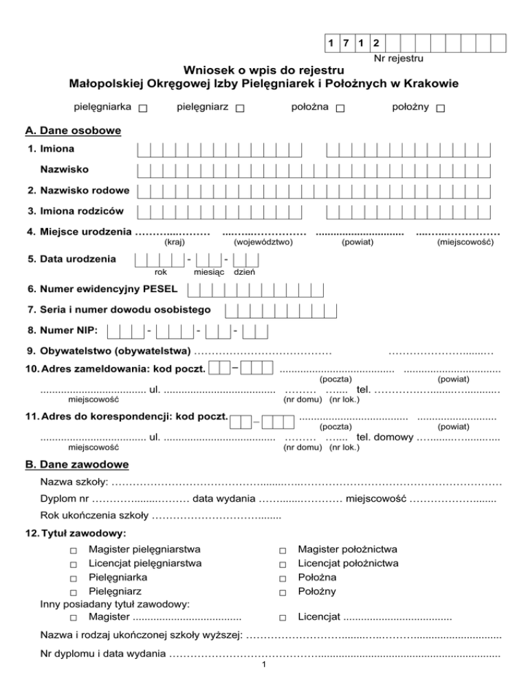 1 7 1 2 Nr rejestru Wniosek o wpis do rejestru Małopolskiej Okręgowej Izby Pielęgniarek i Położnych w Krakowie pielęgniarka □ pielęgniarz □ położna □ położny □ A. Dane osobowe 1. Imiona Nazwisko 2. Nazwisko rodowe 3. Imiona rodziców 4. Miejsce urodzenia ………....……… ....…...…………… .............................. (kraj) 5. Data urodzenia (województwo) rok (powiat) ....…...…………… (miejscowość) miesiąc dzień 6. Numer ewidencyjny PESEL 7. Seria i numer dowodu osobistego 8. Numer NIP: - - - 9. Obywatelstwo (obywatelstwa) ………………………………… 10. Adres zameldowania: kod poczt. ………………….......… ....................................... ................................. (poczta) (powiat) .................................... ul. ...................................... ……… ….... tel. ………….…........…............ miejscowość (nr domu) (nr lok.) 11. Adres do korespondencji: kod poczt. ..................................... ........................... (poczta) (powiat) .................................... ul. ...................................... ……… ….... tel. domowy .…........…............ miejscowość (nr domu) (nr lok.) B. Dane zawodowe Nazwa szkoły: ……………………………………........…..………………………………………………… Dyplom nr …………........……… data wydania …….......………… miejscowość ………………........ Rok ukończenia szkoły …………………………........ 12. Tytuł zawodowy: □ □ □ □ Magister pielęgniarstwa Licencjat pielęgniarstwa Pielęgniarka Pielęgniarz Inny posiadany tytuł zawodowy: □ Magister ..................................... □ □ □ □ Magister położnictwa Licencjat położnictwa Położna Położny □ Licencjat ..................................... Nazwa i rodzaj ukończonej szkoły wyższej: ………………………........…..……….............................. Nr dyplomu i data wydania …………………………………….............................................................. 1 13. Informacja o posiadaniu Prawa Wykonywania Zawodu w innym państwie: Nazwa państwa ……………………………………………........…..………………………………….…… Numer prawa wykonywania zawodu .....………………………….…........…...…………………….…… Data wydania prawa wykonywania zawodu .....……………………........…........………………….…… na czas ograniczony/nieograniczony (niepotrzebne skreślić) ograniczony od dnia ...……………........……………… do dnia ……….......…………………………… Organ wydający zezwolenie Prawo Wykonywania Zawodu …………………………………........….... ...…………………………………………………………………………………………………........…........ 14. Informacje o ograniczeniach w wykonywaniu zawodu: podstawa prawna: uchwała Okręgowej Rady/Prezydium Okręgowej Rady Nr .......……........…........ od dnia ..……………………........…........………… do dnia ..………........……........…………………… orzeczenie lekarskie od dnia .………………........………… do dnia ..……........……………………… 15. Data rozpoczęcia stażu podyplomowego ..……………........….........…………….....……………… miejsce rozpoczęcia stażu ……………...……………………........…............…………………………… (nazwa zakładu opieki zdrowotnej) 16. Data ukończenia stażu podyplomowego …………………...………...………………………..…… miejsce zakończenia stażu …….....………………………………...……………………………………… (nazwa zakładu opieki zdrowotnej) 17. Przebieg pracy zawodowej: Lp. PEŁNA NAZWA PRACODAWCY Okres zatrudnienia 1. od do 2. od do 3. od do 4. od do 5. od do 6. od do 7. od do - Stanowisko - 18. Znajomość języków obcych 1. Język: ___________________________________ 2. Stopień znajomości (bierna, czynna) ________________________________________ 2 19. Indywidualna, indywidualna specjalistyczna, grupowa praktyka pielęgniarek/położnych: Lp. Nazwa praktyki Adres praktyki Nr wpisu Data rozpoczęcia do rejestru działalności 1. 2. 20. Kształcenia podyplomowe (Data i rodzaj ukończonego kształcenia podyplomowego, nazwa organizatora, oraz w przypadku szkolenia specjalizacyjnego numer dyplomu, oraz datę jego wystawienia ): Lp. SPECJALIZACJA Data ukończenia Nazwa organizatora wydającego zaświadczenie Nr Data dyplomu wystawienia Kurs kwalifikacyjny Data ukończenia Nazwa organizatora wydającego zaświadczenie Nr Data dyplomu wystawienia Kurs specjalistyczny/dokształcający Data ukończenia Nazwa organizatora wydającego zaświadczenie Nr Data dyplomu wystawienia 1. 2. Lp. 1. 2. 3. Lp. 1. 2. 3. 4. 5. 21. Uzyskany stopień naukowy ………………………………… data uzyskania ……………………… Nadany przez ………………………………………………………………………………………………… (organ nadający tytuł) 22. Uzyskany tytuł naukowy ……………………………………… data uzyskania ……………………… Nadany przez ………………………………………………………………………………………………… (organ nadający tytuł) 3 23. Zaprzestanie wykonywania zawodu rok 24. Zawieszenie prawa wykonywania zawodu miesiąc rok 25. Zrzeczenie się prawa wykonywania zawodu dzień miesiąc rok - dzień miesiąc dzień 26. Stosunek do służby wojskowej uregulowany □ □ nieuregulowany nie dotyczy □ 27. Skreślona/y z rejestru pielęgniarek/rejestru położnych prowadzonego przez Okręgową Radę Pielęgniarek i Położ