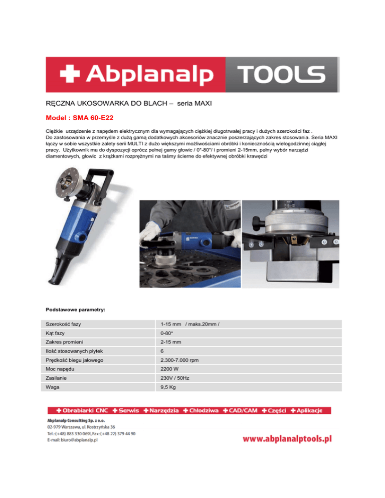 RĘCZNA UKOSOWARKA DO BLACH – seria MAXI Model : SMA 60-E22 Ciężkie urządzenie z napędem elektrycznym dla wymagających ciężkiej długotrwałej pracy i dużych szerokości faz . Do zastosowania w przemyśle z dużą gamą dodatkowych akcesoriów znacznie poszerzających zakres stosowania. Seria MAXI łączy w sobie wszystkie zalety serii MULTI z dużo większymi możliwościami obróbki i koniecznością wielogodzinnej ciągłej pracy. Użytkownik ma do dyspozycji oprócz pełnej gamy głowic / 0*-80*/ i promieni 2-15mm, pełny wybór narządzi diamentowych, głowic z krążkami rozprężnymi na taśmy ścierne do efektywnej obróbki krawędzi Podstawowe parametry: Szerokość fazy 1-15 mm / maks.20mm / Kąt fazy 0-80* Zakres promieni 2-15 mm Ilość stosowanych płytek 6 Prędkość biegu jałowego 2.300-7.000 rpm Moc napędu 2200 W Zasilanie 230V / 50Hz Waga 9,5 Kg