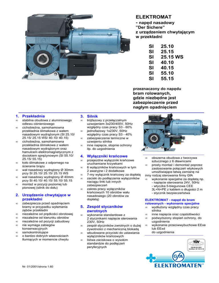 ELEKTROMAT - napęd nasadowy ”Der Sichere” z urządzeniem chwytającym w przekładni SI SI SI SI SI SI SI 25.10 25.15 25.15 WS 40.10 40.15 55.10 55.15 przeznaczony do napędu bram rolowanych, gdzie niezbędne jest zabezpieczenie przed nagłym opadnięciem 1. Przekładnia • • • • • • • stabilna obudowa z aluminiowego odlewu ciśnieniowego cichobieżna, samohamowna przekładnia ślimakowa z wałem nasadowym wydrążonym (SI 25.10/ 25.15/ 25.15 WS/ 40.10/ 40.15) cichobieżna, samohamowna przekładnia ślimakowa z wałem nasadowym wydrążonym oraz hamulcem elektromagnetycznym z dociskiem sprężynowym (SI 55.10/ 25.15/ 55.15) koło ślimakowe z odpornego na ścieranie brązu wał nasadowy wydrążony Ø 30mm przy SI 25.10/ 25.15/ 25.15 WS wał nasadowy wydrążony Ø 40mm przy SI 40.10/ 40.15/ 55.10/ 55.15 montaż w pozycji poziomej lub pionowej (silnik do dołu) 3. Silnik • • • • 4. Wyłączniki krańcowe • • • • • 2. Urządzenie chwytające w przekładni • • • • • • • zabezpiecza przed opadnięciem bramy w przypadku wyłamania zębów przekładni niezależne od prędkości obrotowej niezależne od kierunku obrotów niezależne od pozycji zabudowy nie wymaga zabiegów konserwacyjnych samokontrolujące o bardzo dobrych własnościach tłumiących w momencie chwytu Nr: 01/2001/strona 1.60 trójfazowy z przełączalnym uzwojeniem 3x230/400V, 50Hz względny czas pracy S3 - 60% jednofazowy 1x230V, 50Hz względny czas pracy S3 - 40% zabezpieczenie termiczne w uzwojeniu silnika inne napięcia, stopnie ochrony itp. do uzgodnienia przejezdne wyłączniki krańcowe uruchamiane krzywkami 6 wyłączników krańcowych w tym 2 awaryjne i 2 dodatkowe 7-my wyłącznik krańcowy za dopłatą zaciski do podłączenia wyłączników naciągu linki lub innych zabezpieczeń zakres pracy wyłączników krańcowych 10 obrotów wału nasadowego (20 obrotów za dopłatą) 5. Zespół styczników zwrotnych • • • • wykonanie standardowe z 2 stycznikami napięcie sterowania 230V, 50Hz zespół styczników zwrotnych o dużej żywotności z mechaniczną blokadą wbudowane przyciski do ustawiania wyłączników krańcowych listwa zaciskowa o wysokim standardzie do podłączeń peryferyjnych • obszerna obudowa z tworzywa sztucznego z 6 dławnicami • prosty montaż i demontaż poprzez zastosowanie połączeń wtykowych umożliwiające łatwą zamianę na inny rodzaj sterowania firmy GfA • wykonanie specjalne za dopłatą np. - napięcie sterowania 24V, 50Hz - wtyczka 5-biegunowa CEE 3L+N+PE z kablem o długości 2 m - stycznik bezpieczeństwa ELEKTROMAT - napęd do bram rolowanych - wykonanie specjalne • wydłużony względny czas pracy silnika • inne napięcia oraz częstotliwości • podwyższony stopień ochrony, do uzgodnienia • wykonanie przeciwwybuchowe EExe lub EExd do uzgodnienia 6. Wytyczne, wskazania 6.1 6.2 Napęd ręczny - zwolnienie hamulca Napęd reczny odbywa się z reguły przy dociśniętym hamulcu. Ręczne zwolnienie hamulca przy niewyważonych bramach dopuszczalne jest tylko w następujących przypadkach: - brama znajduje się w dolnym położeniu - w trakcie rewizji lub kontroli - przez upoważnionego specjalistę Przepisy Elektrycznie napędzane bramy podlegają aktualnym normom i przepisom branżowym obowiązującym w kraju docelowym. 7. Dane techniczne SI 25.10 SI 25.15 SI 40.15 SI 55.10 SI 55.15 SG 85 F SI 25.15 WS SG 85 F SI 40.10 SG 85 F SG 85 F SG 85 F SG 85 F SG 85 F 250 635 97117 250 635 97117 250 635 97117 400 1020 97117 400 1020 97117 550 1400 97117 550 1400 97117 10 0,55 3x230/400 50 230 3,5 / 2,0 S3 - 60 5 x 1,5² 10 A 15 0,4 3x230/400 50 230 3,1 / 1,8 S3 - 60 5 x 1,5² 10 A 15 0,75 1x230 50 230 8,0 S3 - 40 3 x 1,5² 10 A 10 0,75 3x230/400 50 230 4,8 / 2,8 S3 - 60 5 x 1,5² 10 A 15 1,1 3x230/400 50 230 4,6 / 2,7 S3 - 60 5 x 1,5² 10 A 10 0,75 3x230/400 50 230 8,0 / 4,6 S3 - 60 5 x 1,5² 10 A 15 1,1 3x230/400 50 230 7,3 / 4,2 S3 - 60 5 x 1,5² 10 A 10 (20) 10 (20) 10 (20) 10 (20) 10 (20) 10 (20) 10 (20) -5 / +40 -5 / +40 -5 / +40 -5 / +40 -5 / +40 -5 / +40 -5 / +40 <70 54 23 <70 54 21 <70 54 27 <70 54 26 <70 54 28 <70 54 30 <70 54 30 wielkość (szereg) Nm Nm moment na wale moment chwytający urządzenie chwytające w przekładni (Nr. protokołu dopuszczającego) liczba obrotów wału moc silnika napięcie pracy (sieci zasilającej) częstotliwość napięcie sterowania prąd znamionowy silnika względny czas pracy silnika kabel zasilający / zabezpieczenie zakres pracy wyłączników krańcowych, max. liczba obrotów wału dopuszczalny zakres temperatur (przy rozbieżnościach wymagana zgoda producenta) poziom hałasu stopień ochrony ciężar napędu min-1 kW V Hz V A % O C DB(A) IP kg 8. Wymiary . . 1.przekładnia ślimakowa z urządzeniem chwytającym 2.silnik 3.wyłączniki krańcowe 4.stycznik zwrotny z kabelem 0.7m 5.blokada napędu ręcznego 6.stopa wahliwa w wykonaniu poziomym lub pionowym 7.hamulec z dociskiem sprężynowym (tylko przy SI 55.55.10 / SI 55.15) *wymiary w nawiasach dotyczą SI 25.15WS / 55.10 / 55.15 wielkość SI 25.10 SI 25.15 SI 25.15 WS SI 40.10 SI 40.15 SI 55.10 SI 55.15 D 30 30 30 40 40 40 40 Nr.01/2001/strona 1.61 H 33,3 33,3 33,3 43,3 43,3 43,3 43,3 B 8 8 8 12 12 12 12 L1 486 459 513 523 538 513 513 L2 439 412 466 476 491 466 466 L3 464 437 491 501 516 532 532