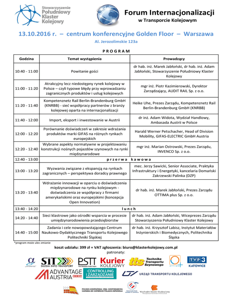 Forum Internacjonalizacji w Transporcie Kolejowym 13.10.2016 r. – centrum konferencyjne Golden Floor – Warszawa Al. Jerozolimskie 123a PROGRAM Godzina Temat wystąpienia Prowadzący 10:40 - 11:00 Powitanie gości dr hab. inż. Marek Jabłoński, dr hab. inż. Adam Jabłoński, Stowarzyszenie Południowy Klaster Kolejowy 11:00 - 11:20 Atrakcyjny lecz niedostępny rynek kolejowy w Polsce – czyli typowe błędy przy wprowadzaniu zagranicznych produktów i usług kolejowych mgr inż. Piotr Kazimierowski, Dyrektor Zarządzający, AUDIT RAIL Sp. z o.o. 11:20 - 11:40 Kompetenznetz Rail Berlin-Brandenburg GmbH (KNRBB) - sieć współpracy partnerów z branży kolejowej oparta na internacjonalizacji Heike Uhe, Prezes Zarządu, Kompetenznetz Rail Berlin-Brandenburg GmbH (KNRBB) 11:40 - 12:00 Import, eksport i inwestowanie w Austrii dr inż. Adam Widota, Wydział Handlowy, Ambasada Austrii w Polsce Porównanie doświadczeń w zakresie wdrażania Harald Werner Petschacher, Head of Division produktów marki GIFAS na różnych rynkach Mobility, GIFAS-ELECTRIC GmbH Austria europejskich Wybrane aspekty normatywne w projektowaniu mgr inż. Marian Ostrowski, Prezes Zarządu, 12:20 - 12:40 konstrukcji nośnych pojazdów szynowych na rynki INVENCO Sp. z o.o. międzynarodowe 12:40 - 13:00 przerwa kawowa 12:00 - 12:20 13:00 - 13:20 Wyzwania związane z ekspansją na rynkach zagranicznych – perspektywa doradcy prawnego mec. Jerzy Sawicki, Senior Associate, Praktyka Infrastruktury i Energetyki, kancelaria Domański Zakrzewski Palinka (DZP) 13:20 - 13:40 Wdrażanie innowacji w oparciu o doświadczenia międzynarodowe na rynku kolejowym doświadczenia ze współpracy z firmami amerykańskimi oraz europejskimi (koncepcja Open Innovation) dr hab. inż. Marek Jabłoński, Prezes Zarządu OTTIMA plus Sp. z o.o. 13:40 - 14:20 lunch Sieci klastrowe jako ośrodki wsparcia w procesie umiędzynarodowienia przedsiębiorstw dr hab. inż. Adam Jabłoński, Wiceprezes Zarządu Stowarzyszenia Południowy Klaster Kolejowy Zadania i cele nowopowstającego Centrum 14:40 - 15:00 Naukowo-Dydaktycznego Transportu Kolejowego Politechniki Śląskiej dr hab. inż. Krzysztof Labisz, Instytut Materiałów Inżynierskich i Biomedycznych, Politechnika Śląska 14:20 - 14:40 *program może ulec zmianie koszt udziału: 399 zł + VAT zgłoszenia: [email protected] patronaty: