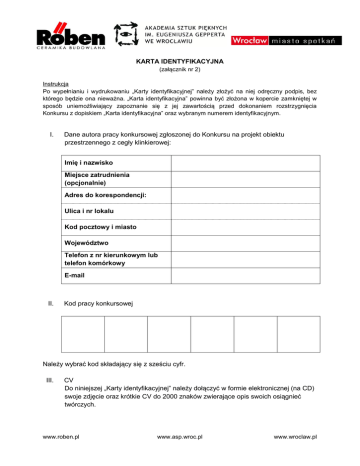 KARTA IDENTYFIKACYJNA (załącznik nr 2) Instrukcja Po wypełnianiu i wydrukowaniu „Karty identyfikacyjnej” należy złożyć na niej odręczny podpis, bez którego będzie ona nieważna. „Karta identyfikacyjna” powinna być złożona w kopercie zamkniętej w sposób uniemożliwiający zapoznanie się z jej zawartością przed dokonaniem rozstrzygnięcia Konkursu z dopiskiem „Karta identyfikacyjna” oraz wybranym numerem identyfikacyjnym. I. Dane autora pracy konkursowej zgłoszonej do Konkursu na projekt obiektu przestrzennego z cegły klinkierowej: Imię i nazwisko Miejsce zatrudnienia (opcjonalnie) Adres do korespondencji: Ulica i nr lokalu Kod pocztowy i miasto Województwo Telefon z nr kierunkowym lub telefon komórkowy E-mail II. Kod pracy konkursowej Należy wybrać kod składający się z sześciu cyfr. III. CV Do niniejszej „Karty identyfikacyjnej” należy dołączyć w formie elektronicznej (na CD) swoje zdjęcie oraz krótkie CV do 2000 znaków zwierające opis swoich osiągnieć twórczych. www.roben.pl www.asp.wroc.pl www.wroclaw.pl IV. Oświadczenia: 1. Oświadczam, że informacje podane wyżej w niniejszym formularzu są zgodne ze stanem faktycznym. 2. Zapoznałem/zapoznałam się z treścią regulaminu i akceptuję jego postanowienia. 3. Oświadczam, że jestem Autorem pracy zgłoszonej do Konkursu na projekt obiektu przestrzennego z cegły klinkierowej i przysługują mi do niej pełne prawa autorskie. 4. Oświadczam, że w przypadku przyznania mi nagrody głównej lub wyróżnienia w Konkursie, zgadzam się na nieodpłatne publikowanie, rozpowszechnianie oraz dokonywanie niezbędnych opracowań, skrótów oraz innych modyfikacji wobec nadesłanej pracy konkursowej przez Organizatorów na wszelkich polach eksploatacji, w szczególności: druk w dowolnej liczbie egzemplarzy, zamieszczanie jej w internecie oraz innych formach utrwaleń nadających się do rozpowszechniania, wprowadzanie do pamięci komputera oraz publiczne prezentowanie. 5. Oświadczam, że nie roszczę praw do zwrotu materiałów przekazanych wraz z niniejszym formularzem zgłoszeniowym w przypadku nieodebrania ich w wyznaczonym terminie. 6. Wyrażam zgodę na wprowadzenie do bazy danych i przetwarzanie moich danych osobowych oraz informacji o projekcie przez Organizatorów Konkursu lub upoważnione przez nich instytucje (zgodnie z ustawą z dnia 29 sierpnia 1997 r. o ochronie danych osobowych – Dz. U. z 2002r. Nr 101 poz. 926 z późn. zm.) w celach informacyjnych i marketingowych. ------------------------------------Miejsce i data www.roben.pl -------------------------------------Podpis autora zgłoszonego projektu www.asp.wroc.pl www.wroclaw.pl