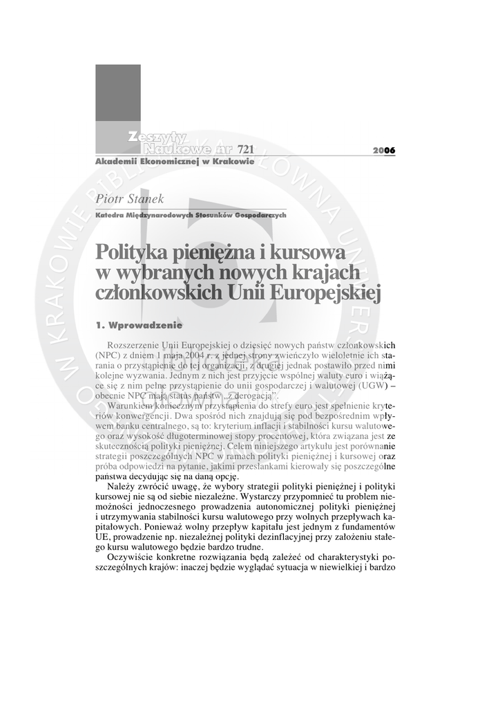 Zesz yty Naukowe nr 721 2006 Akademii Ekonomicznej w Krakowie Piotr Stanek Katedra Mi´dzynarodowych Stosunków Gospodarczych Polityka pieni´˝na i kursowa w wybranych nowych krajach cz∏onkowskich Unii Europejskiej 1. Wprowadzenie Rozszerzenie Unii Europejskiej o dziesi´ç nowych paƒstw cz∏onkowskich (NPC) z dniem 1 maja 2004 r. z jednej strony zwieƒczy∏o wieloletnie ich starania o przystàpienie do tej organizacji, z drugiej jednak postawi∏o przed nimi kolejne wyzwania. Jednym z nich jest przyj´cie wspólnej waluty euro i wià˝àce si´ z nim pe∏ne przystàpienie do unii gospodarczej i walutowej (UGW) – obecnie NPC majà status paƒstw „z derogacjà”. Warunkiem koniecznym przystàpienia do strefy euro jest spe∏nienie kryteriów konwergencji. Dwa spoÊród nich znajdujà si´ pod bezpoÊrednim wp∏ywem banku centralnego, sà to: kryterium inflacji i stabilnoÊci kursu walutowego oraz wysokoÊç d∏ugoterminowej stopy procentowej, która zwiàzana jest ze skutecznoÊcià polityki pieni´˝nej. Celem niniejszego artyku∏u jest porównanie strategii poszczególnych NPC w ramach polityki pieni´˝nej i kursowej oraz próba odpowiedzi na pytanie, jakimi przes∏ankami kierowa∏y si´ poszczególne paƒstwa decydujàc si´ na danà opcj´. Nale˝y zwróciç uwag´, ˝e wybory strategii polityki pieni´˝nej i polityki kursowej nie sà od siebie niezale˝ne. Wystarczy przypomnieç tu problem niemo˝noÊci jednoczesnego prowadzenia autonomicznej polityki pieni´˝nej i utrzymywania stabilnoÊci kursu walutowego przy wolnych przep∏ywach kapita∏owych. Poniewa˝ wolny przep∏yw kapita∏u jest jednym z fundamentów UE, prowadzenie np. niezale˝nej polityki dezinflacyjnej przy za∏o˝eniu sta∏ego kursu walutowego b´dzie bardzo trudne. OczywiÊcie konkretne rozwiàzania b´dà zale˝eç od charakterystyki poszczególnych krajów: inaczej b´dzie wyglàdaç sytuacja w niewielkiej i bardzo 168 Piotr Stanek otwartej gospodarce, jaka jest np. w Estonii, a inaczej – w relatywnie du˝ej i mniej zale˝nej od przep∏ywów kapita∏owych i handlowych Polsce. W pierwszej cz´Êci artyku∏u przedstawione zostanà strategie polityki pieni´˝nej i kursowej przyj´te w Czechach, Estonii, ¸otwie i Polsce w latach 2002–2004. Wybór ten podyktowany jest ch´cià zaprezentowania mo˝liwie szerokiego spektrum strategii polityki pieni´˝nej, kursowej i deklarowanej Êcie˝ki przyj´cia wspólnej waluty przy jednoczesnym ograniczeniu liczby analizowanych krajów. Przekrój czasowy analizy pokrywa si´ z okresem referencyjnym raportu konwergencji. Na tym tle w cz´Êci drugiej zaprezentowana zostanie ocena osiàgni´ç w zakresie konwergencji zawarta w Raporcie zbie˝noÊci opublikowanym przez EBC w paêdzierniku 2004 r. Artyku∏ zakoƒczà wnioski odnoÊnie do dajàcych si´ zaobserwowaç zale˝noÊci mi´dzy wyborem strategii polityki pieni´˝nej i kursowej a skutecznoÊcià procesu konwergencji. 2. Polityka pieni´˝na i kursowa 2.1. Uwagi wst´pne Zgodnie z wymaganiami aquis communautaire (jak równie˝ konsensusem panujàcym w g∏ównym nurcie ekonomii1), g∏ównym celem banku centralnego, a wi´c i prowadzonej przez niego polityki pieni´˝nej, powinna byç stabilnoÊç cen. Cel ten mo˝e byç oczywiÊcie osiàgni´ty ró˝nymi sposobami. Jednà ze strategii znajdujàcych zastosowanie w coraz wi´kszej liczbie banków centralnych, a jednoczeÊnie szeroko dyskutowanà w Êrodowisku naukowym, jest strategia bezpoÊredniego celu inflacyjnego2. W pewnym uproszczeniu mo˝na przyjàç, ˝e polega ona na zobowiàzaniu si´ banku centralnego do osiàgni´cia w Êrednim okresie pewnego, uprzednio okreÊlonego poziomu inflacji. Dla osiàgni´cia tego celu bank centralny u˝ywa dost´pnych mu instrumentów (przede wszystkim krótkoterminowej stopy procentowej). Bardzo wa˝nà rol´ odgrywa w niej równie˝ systematyczne publikowanie prognoz inflacji, które ma za zadanie ustabilizowanie oczekiwaƒ inflacyjnych na poziomie celu inflacyjnego. Strategia ta uznawana jest doÊç powszechnie za skutecznà w wal1 Jednà z podstawowych pozycji w literaturze z zakresu niezale˝noÊci banku centralnego jest: A. Cukierman, Central Bank Strategy, Credibility and Independence, MIT Press, 1992; nowsze badania podsumowane zosta∏y np. w: H. Berger, J. de Haan, S.C.W. Eijfinger, Central Bank Independence: An Update of Theory and Evidence, „Journal of Economic Surveys” 2001, vol. 15, nr 1. 2 Por. np. B.S. Bernanke, T. Laubach, F. Mishkin, A.S. Posen, Inflation Targeting. Lessons from the International Experience, Princeton University Press, Princeton 1999; J. Drop, A. Wojtyna, Strategia bezpoÊredniego celu inflacyjnego: przes∏anki teoretyczne i doÊwiadczenia wybranych krajów, „Materia∏y i Studia NBP” 2001, nr 118; A. Fraga, I. Goldfajn, A. Minella, Inflation Targeting in Emerging Market Economies, NBER Working Paper nr 10019, 2003; lub D. Daianu, L. Lungu, Inflation Targeting. Between Rhetoric and Reality. The Case of Transition Economies, William Davidson Institute Working Paper 743, 2005. Ostatnie dwa opracowania dotyczà w szczególnoÊci krajów na drodze transformacji. Polityka pieni´˝na i kursowa... 169 ce z inflacjà. Ponadto przyczynia si´ ona do wzrostu przejrzystoÊci polityki pieni´˝nej, jej „odpowiedzialnoÊci demokratycznej” (accountability) oraz odpornoÊci gospodarki na szoki zewn´trzne3. Innà mo˝liwà strategià polityki pieni´˝nej dost´pnà dla NPC jest tzw. zarzàd waluty (currency board), czyli jednostronne zobowiàzanie banku centralnego do utrzymania sta∏ego kursu wobec danej waluty, co w praktyce oznacza te˝ koniecznoÊç „importowania” stóp procentowych z kraju, w stosunku do którego waluty usztywniany jest kurs4. Teoretycznie mo˝liwe jest te˝ wprowadzenie waluty innego kraju do obiegu na mocy jednostronnej decyzji – w przypadku analizowanych krajów mo˝na ewentualnie zastanawiaç si´ nad „euroizacjà”5. Na drodze do przyj