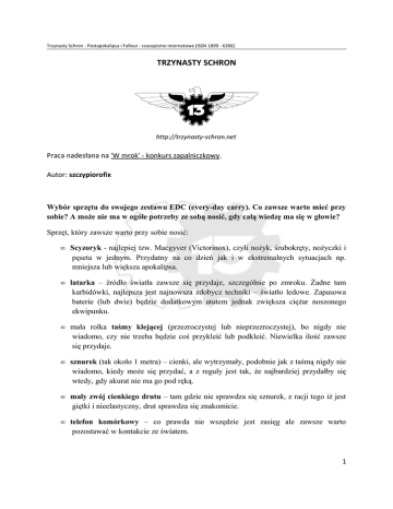 Trzynasty Schron - Postapokalipsa i Fallout - czasopismo internetowe (ISSN 1899 - 6396) TRZYNASTY SCHRON http://trzynasty-schron.net Praca nadesłana na 'W mrok' - konkurs zapalniczkowy. Autor: szczypiorofix Wybór sprzętu do swojego zestawu EDC (every-day carry). Co zawsze warto mieć przy sobie? A może nie ma w ogóle potrzeby ze sobą nosić, gdy całą wiedzę ma się w głowie? Sprzęt, który zawsze warto przy sobie nosić: • Scyzoryk - najlepiej tzw. Macgyver (Victorinox), czyli nożyk, śrubokręty, nożyczki i pęseta w jednym. Przydatny na co dzień jak i w ekstremalnych sytuacjach np. mniejsza lub większa apokalipsa. • latarka – źródło światła zawsze się przydaje, szczególnie po zmroku. Żadne tam karbidówki, najlepsza jest najnowsza zdobycz techniki – światło ledowe. Zapasowa baterie (lub dwie) będzie dodatkowym atutem jednak zwiększa ciężar noszonego ekwipunku. • mała rolka taśmy klejącej (przezroczystej lub nieprzezroczystej), bo nigdy nie wiadomo, czy nie trzeba będzie coś przykleić lub podkleić. Niewielka ilość zawsze się przydaje. • sznurek (tak około 1 metra) – cienki, ale wytrzymały, podobnie jak z taśmą nigdy nie wiadomo, kiedy może się przydać, a z reguły jest tak, że najbardziej przydałby się wtedy, gdy akurat nie ma go pod ręką. • mały zwój cienkiego drutu – tam gdzie nie sprawdza się sznurek, z racji tego iż jest giętki i nieelastyczny, drut sprawdza się znakomicie. • telefon komórkowy – co prawda nie wszędzie jest zasięg ale zawsze warto pozostawać w kontakcie ze światem. 1 Trzynasty Schron - Postapokalipsa i Fallout - czasopismo internetowe (ISSN 1899 - 6396) • guma balonowa – odświeża oddech i poprzez permanentne żucie pozwala trochę się od stresować, a po wymiętoleniu świetnie nadaje się do zalepiania wszelkich nieszczelności. • długopis (lub ołówek) i mała kartka papieru – np. gdy trzeba coś zapisać lub zostawić komuś wiadomość. • mały batonik czekoladowy – gdy nagle najdzie nas ochota na coś słodkiego, poza tym źródło energii. • 0,5 l wody mineralnej – woda jest absolutnie konieczna, niezbędna do życia i funkcjonowania organizmu. Pić trzeba codziennie, nie tylko w czasach kryzysu • absolutnie ważnym przedmiotem należącym do zestawu Every-Day-Carry jest źródło ognia – zapalniczka. Zapałki – też dobre jednak zmoczone są zupełnie nieprzydatne. Jeszcze lepiej, jeśli jest ona opatrzona czaderskim logiem np. Metro 2033 i wcale nie musi to być „moja szczęśliwa Zippo” z „4 pokoje” Tarantino. Wystarczy, żeby dawała ogień wtedy, gdy jest on potrzebny, np. do przypalenia fajka (mimo, iż sam nie palę nigdy nie wiadomo, czy nie nadarzy się okazja aby służyć ogniem komuś innemu). • cały ten sprzęt potrzebuje ośrodka, który będzie w stanie go należycie wykorzystać, czyli głowy. To głowa, a w zasadzie mózg, będzie analizował odbierane bodźce i decydował, co zrobić z nimi dalej. Bez niej przedstawiciel gatunku Homo sapiens za pomocą powyższych przedmiotów mógłby zrobić sobie, co najwyżej krzywdę: pociąć się, oślepnąć, powiesić się, skleić sobie to i owo a na końcu podpalić. Głowa służy także do gromadzenia wiedzy, zapamiętywania różnych przydatnych rzeczy. • Sama głowa to jednak nie wszystko, potrzeba czegoś, do czego powinna być ona przytwierdzona nie bezpośrednio do dupy tyłka, ale do tułowia, wyposażonego w sprawne ręce i nogi. Pomagają one głowie raczej tylko pod względem „technicznym” i umożliwiają jej transport z miejsca na miejsce, służą także w trakcie wykorzystywania ww. przedmiotów Every-Day-Carry. Wymieniony sprzęt, który można nosić ze sobą na co dzień nie zajmuje dużo miejsca, niewiele waży i z łatwością zmieści się standardowym „lunch boksie” wyprodukowanym przez Vault-Tec Industries. Jeśli ktoś chce być hardkorem – nie ma problemu, nie trzeba nosić przy sobie nic z wymienionych przeze mnie przedmiotów, wystarczy improwizacja. ksywa z forum: szczypiorofix Pisownia mniej więcej zgodna z oryginałem ;-) - redakcja. 2