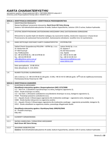 KARTA CHARAKTERYSTYKI sporządzona zgodnie z Rozporządzeniem WE nr 1907/2006 (REACH) załącznik II zmieniony przez Rozporządzenie Komisji (UE) nr 453/2010 zał. II. SEKCJA 1: IDENTYFIKACJA MIESZANINY I IDENTYFIKACJA PRZEDSIĘBIORSTWA 1.1. IDENTYFIKATOR PRODUKTU Nazwa handlowa/ oznaczenie mieszaniny: Bacti Grom WC Extra Strong Zawiera: N,N-dimethyltetradecylamine N-oxide; Sodium hypochlorite, solution 13% Cl active; Sodium hydroxide. 1.2. ISTOTNE ZIDENTYFIKOWANE ZASTOSOWANIA MIESZANINY ORAZ ZASTOSOWANIA ODRADZANE Mieszanina to wysoko lepki żel idealnie nadający się czyszczenia toalety, skutecznie rozpuszcza i zmywa brud. Przeznaczony do zastosowań konsumenckich. Zastosowania odradzane: wszelkie inne niż wymienione. 1.3. DANE DOTYCZĄCE DOSTAWCY KARTY CHARAKTERYSTYKI DYSTRYBUTOR Zakład Chemii Gospodarczej POLLENA – ASTRA Sp. z o.o. Ul. Herburtów 34 37-700 Przemyśl woj. Podkarpackie tel. +48 16 678 66 31, +48 16 678 66 32 fax. +48 16 678 99 39 [email protected] www.pollena-astra.com.pl Lakma Strefa Sp. z o.o. Ul. Gajowa 7 43-254 Warszowice woj. śląskie tel. +48 32 43 53 188 fax. +48 32 43 49 213 [email protected] www.lakma.com Data sporządzenia: 23.08.2013r. Data aktualizacji: II. 2.01.2015r. 1.4. NUMER TELEFONU ALARMOWEGO 00 Jak w wierszu 1.3. +48 16 678 66 31 (do godz. 15.00), +48 32 43 53 188 (do godz. 16 ) lub do najbliższej terenowej Państwowej Straży Pożarnej tel. 998 SEKCJA 2: IDENTYFIKACJA ZAGROŻEŃ: 2.1. KLASYFIKACJA MIESZANINY Klasyfikacja mieszaniny zgodna z Rozporządzeniem (WE) 1272/2008 3.2 – Skin Irrit. 2 (Działanie żrące/drażniące na skórę, kategoria zagrożenia 2), H315 - Działa drażniąco na skórę. 3.3 – Eye Dam. 1 (Poważne uszkodzenie oczu/działanie drażniące na oczy, kategoria zagrożenia 1), H318 - Powoduje poważne uszkodzenie oczu. 4.1 – Aquatic Acute 1 (Stwarzające zagrożenie dla środowiska wodnego – zagrożenie ostre, kategoria 1), H400 - Działa bardzo toksycznie na organizmy wodne. 4.1 – Aquatic Chronic 3 (Stwarzające zagrożenie dla środowiska wodnego – zagrożenie przewlekłe, kategoria 3), H412 - Działa szkodliwie na organizmy wodne, powodując długotrwałe skutki. Klasyfikacja mieszaniny zgodna z Dyrektywą Rady 1999/45/EWG Xi – Produkt drażniący, R38, R41 2.2. ELEMENTY OZNAKOWANIA 2.2.1 NAZWA HANDLOWA / OZNACZENIE MIESZANINY Bacti Grom WC Extra Strong 2.2.2 SKŁADNIKI NIEBEZPIECZNE Zawiera: N,N-dimethyltetradecylamine N-oxide; Sodium hypochlorite, solution 13% Cl active; Sodium hydroxide. Strona 1 z 10 KARTA CHARAKTERYSTYKI sporządzona zgodnie z Rozporządzeniem WE nr 1907/2006 (REACH) załącznik II zmieniony przez Rozporządzenie Komisji (UE) nr 453/2010 zał. II. 2.2.3 SYMBOLE, ZWROTY I NAPISY OSTRZEGAWCZE Piktogramy: Hasło ostrzegawcze: Niebezpieczeństwo Zwroty wskazujące rodzaj zagrożenia: H315 - Działa drażniąco na skórę. H318 - Powoduje poważne uszkodzenie oczu. H400 - Działa bardzo toksycznie na organizmy wodne. H412 - Działa szkodliwie na organizmy wodne, powodując długotrwałe skutki. Zwroty wskazujące środki ostrożności: P264 - Dokładnie umyć ręce po użyciu. P280 - Stosować rękawice ochronne/ ochronę oczu/ochronę twarzy. P305+P351+P338 – W PRZYPADKU DOSTANIA SIĘ DO OCZU: Ostrożnie płukać wodą przez kilka minut. Wyjąć soczewki kontaktowe, jeżeli są i można je łatwo usunąć. Nadal płukać. P310 - Natychmiast skontaktować się z OŚRODKIEM ZATRUĆ lub lekarzem. P273 - Unikać uwolnienia do środowiska. Napisy dodatkowe: Nie stosować razem z innymi produktami. Może uwalniać niebezpieczne gazy (chlor). Nie nanosić na powierzchnie aluminiowe, ocynkowane i lakierowane. Odbarwia i niszczy tekstylia oraz drewno. 2.3. INNE ZAGROŻENIA Mieszanina nie spełnia kryteriów klasyfikacji PBT i vPvB wymienionych w załączniku XIII Rozporządzenia REACH. Inne nieodzwierciedlone w klasyfikacji zagrożenia: Nieznane. SEKCJA 3: SKŁAD/INFORMACJA O SKŁADNIKACH 3.2 MIESZANINY NIEBEZPIECZNE SKŁADNIKI MIESZANINY WG ROZPORZĄDZENIA (WE) 1272/2008 Nazwa substancji/ INCI Nr indeksowy Nr WE Nr CAS Nr rejestru % wagowy Klasa name zagrożenia Węglan sodu, INCI name: Sodium carbonate 011-005-00-2 207-838-8 497-19-8 N,N-dimethyltetradecylamine N-oxide, INCI name: Myristamine oxide - 222-059-3 3332-27-2 Chloran(I) sodu, r-r, 13% Cl, INCI name: Sodium hypochlorite, solution 13% Cl active 017-011-00-1 231-668-3 7681-52-9 Zwroty H 01211948549819-xxxx 01211994926237-0000 2,0-5,0 3.3-Eye Irrit, 2, H319, 1,5-3,5 H318, H302, H400, H411, 01211948815434-XXXX 1,5-2,25 aktywnego chloru 3.3-Eye Dam. 1, 3.1-Acute Tox. 4, 3.6-Aquatic Acute 1, 4.1-Aquatic Chronic 2, 2.16-Met. Corr. 1, 3.2-Skin Corr. 1B, H290, H314, H318, H400, Strona 2 z 10 KARTA CHARAKTERYSTYKI sporządzona zgodnie z Rozporządzeniem WE nr 1907/2006 (REACH) załącznik II zmieniony przez Rozporządzenie Komisji (UE) nr 453/2010 zał. II. Wodorotlenek sodu, INCI name: Sodium hydroxide Nazwa substancji/ INCI name 011-002-00-6 215-185-5 1310-73-2 01211945789227-XXXX 0,5-1,0 NIEBEZPIECZNE SKŁADNIKI MIESZANINY WG DYREKTYWY 67/548 /EWG Nr indeksowy Nr WE Nr CAS Nr rejestru % wagowy Węglan sodu bezwodny, INCI name: sodium carbonate 011-005-00-2 207-838-8 497-19-8 N,N-dimethyltetradecylamine N-oxide, INCI name: Myristamine oxide - 222-059-3 3332-27-2 Chloran(I) sodu, r-r, 13% Cl, INCI name: Sodium hypochlorite, solution 13% Cl active 017-011-00-1 231-668-3 Wodorotlenek sodu, INCI name: Sodium hydroxide 011-002-00-6 215-185-5 3.3-Eye Dam. 1, 4.1-Aquatic Acute 1, 4.1-Aquatic Chronic 2, 3.2-Skin Corr. 1A, 3.2-Skin Corr. 1B, 3.2-Skin Irrit. 2, 3.2-Eye Irrit. 2, H411, EUH031 Symbole zagrożenia Zwroty R H314: C ≥ 5 % H314: 2%≤C<5% H315: 0,5% ≤ C<2 % H319: 0,5% ≤ C< 2% 01211948549819-xxxx 01211994926237-0000 2,0-5,0 Xi R36, 1,5-3,5 Xn, Xi, N, R22, R38, R41 R50, 7681-52-9 01211948815434-XXXX 1,5-2,25 aktywnego chloru C, N, R34, R50, R31, 1310-73-2 01211945789227-XXXX 0,5-1,0 C, Xi, R35: C ≥ 5% R34: 2%≤C<5% R36/38: 0,5%≤