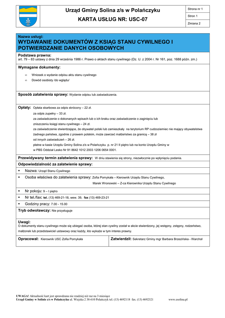 Urząd Gminy Solina z/s w Polańczyku KARTA USŁUG NR: USC