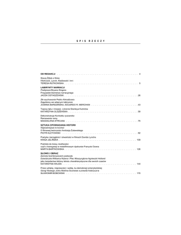 S P I S R Z E C Z Y OD REDAKCJI . . . . . . . . . . . . . . . . . . . . . . . . . . . . . . . . . . . . . . . . . . . . . 4 Slavoj Žižek o filmie Hitchcock, Lynch, Kieślowski i inni TERESA RUTKOWSKA . . . . . . . . . . . . . . . . . . . . . . . . . . . . . . . . . . . . . . . . . 5 LABIRYNTY NARRACJI Podejrzani Bryana Singera Przypadek kłamstwa narracyjnego JACEK OSTASZEWSKI . . . . . . . . . . . . . . . . . . . . . . . . . . . . . . . . . . . . . . . . . 26 Złe wychowanie Pedro Almodóvara Zagubiony we własnym labiryncie JOANNA BARDZIŃSKA, EDUARDO R. MERCHAN . . . . . . . . . . . . . . . . . . . . . . . . . . 43 Toposy le˛ku i inicjacji. Lśnienie Stanleya Kubricka KATARZYNA OLSZEWSKA . . . . . . . . . . . . . . . . . . . . . . . . . . . . . . . . . . . . . . . 59 Dekonstrukcja Kontraktu rysownika Ramowanie ramy MAGDALENA STROJNA . . . . . . . . . . . . . . . . . . . . . . . . . . . . . . . . . . . . . . . . 75 SZTUKA OPOWIADANIA HISTORII Najważniejsze to kochać O filmowej twórczości Andrzeja Żuławskiego PIOTR KLETOWSKI . . . . . . . . . . . . . . . . . . . . . . . . . . . . . . . . . . . . . . . . . . 92 Poetyka niecia˛głości i otwartości w filmach Davida Lyncha KINGA JELIŃSKA . . . . . . . . . . . . . . . . . . . . . . . . . . . . . . . . . . . . . . . . . . . 109 Podróże do kresu możliwości czyli o transgresji w metafilmowym dyskursie François Ozona MARTA BARTKOWSKA . . . . . . . . . . . . . . . . . . . . . . . . . . . . . . . . . . . . . . . . 126 SŁOWO I OBRAZ Zemsta Gombrowiczem podszyta Dziedziczka Williama Wylera i Plac Waszyngtona Agnieszki Holland jako świadectwa lektury tekstu charakterystyczne dla swoich czasów KATARZYNA WAJDA . . . . . . . . . . . . . . . . . . . . . . . . . . . . . . . . . . . . . . . . . 144 Przez udre˛ke˛, nieprawości i walke˛, ku demokracji amerykańskiej Gangi Nowego Jorku Martina Scorsese a prawda historyczna SŁAWOMIR BOBOWSKI . . . . . . . . . . . . . . . . . . . . . . . . . . . . . . . . . . . . . . . 170 S P I S R Z E C Z Y POŻEGNANIA Malarstwo to pamie˛tnik, to wypowiedź intymna Z JERZYM SKARŻYŃSKIM rozmawia IWONA GRODŹ . . . . . . . . . . . . . . . . . . . . . . . 196 VARIA Teoria i historia filmu w Polsce w latach 1945-1990 BEATA KOSIŃSKA-KRIPPNER, ZBIGNIEW BENEDYKTOWICZ . . . . . . . . . . . . . . . . . . 203 FESTIWALE Tartuskie wydarzenia filmowe, czyli sok z ananasa syberyjskiego SŁAWOMIR SIKORA . . . . . . . . . . . . . . . . . . . . . . . . . . . . . . . . . . . . . . . . . 228 OKIEM I UCHEM Kino w cieniu pochodów, czyli entuzjaści MARCIN GIŻYCKI . . . . . . . . . . . . . . . . . . . . . . . . . . . . . . . . . . . . . . . . . . 235 KSIA˛ŻKI O FILMIE Ostatni romantyk KRYSTYNA DUNIEC . . . . . . . . . . . . . . . . . . . . . . . . . . . . . . . . . . . . . . . . . 240 Antropolog patrzy na fotografie˛ ROCH SULIMA . . . . . . . . . . . . . . . . . . . . . . . . . . . . . . . . . . . . . . . . . . . . 245 W poszukiwaniu straconego blasku ŁUKASZ MACIEJEWSKI . . . . . . . . . . . . . . . . . . . . . . . . . . . . . . . . . . . . . . . 250 NOTY O AUTORACH . . . . . . . . . . . . . . . . . . . . . . . . . . . . . . . . . . . . . . . . . 254 KINO W POLSCE 2002 (cz.3) oprac. Beata Kosińska-Krippner . . . . . . . . . . . . . . . . . . . 255 SUMMARY . . . . . . . . . . . . . . . . . . . . . . . . . . . . . . . . . . . . . . . . . . . . . . 279 TABLE DE MATIERE . . . . . . . . . . . . . . . . . . . . . . . . . . . . . . . . . . . . . . . . . 284
