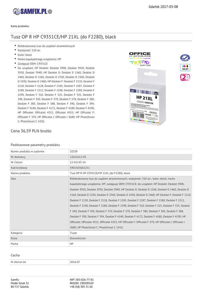 Gdańsk 2017-03-08 Karta produktu: Tusz OP R HP C9351CE/HP 21XL (do F2280), black Refabrykowany tusz do uządzeń atramentowych Wydajność: 510 str. Kolor: black Marka kopatyblinego urządzenia: HP Zastępuje OEM: C9351CE Do urządzeń: HP DeskJet: DeskJet 3900, DeskJet 3920, DeskJet 3930, DeskJet 3940; HP DeskJet D: DeskJet D 1360, DeskJet D 1460, DeskJet D 1560, DeskJet D 2330, DeskJet D 2360, DeskJet D 2430, DeskJet D 2460; HP DeskJet F: DeskJet F 2110, DeskJet F 2120, DeskJet F 2128, DeskJet F 2185, DeskJet F 2187, DeskJet F 2188, DeskJet F 2212, DeskJet F 2240, DeskJet F 2280, DeskJet F 2290, DeskJet F 310, DeskJet F 325, DeskJet F 335, DeskJet F 340, DeskJet F 350, DeskJet F 370, DeskJet F 378, DeskJet F 380, DeskJet F 385, DeskJet F 388, DeskJet F 390, DeskJet F 394, DeskJet F 4140, DeskJet F 4172, DeskJet F 4180, DeskJet F 4190; HP OfficeJet: OfficeJet 4315, OfficeJet 4355; HP OfficeJet F: OfficeJet F 370; HP OfficeJet J: OfficeJet J 3680; HP PhotoSmart C: PhotoSmart C 1410; Cena 36,59 PLN brutto Podstawowe parametry produktu Numer produktu w systemie 32539 Nr dostawcy 12621612-05 Nr Celcen 12-01145-14 Kod kreskowy 5901503681251 Nazwa produktu Tusz OP R HP C9351CE/HP 21XL (do F2280), black Opis Refabrykowany tusz do uządzeń atramentowych; wydajność: 510 str.; kolor: black; marka kopatyblinego urządzenia: HP; zastępuje OEM: C9351CE; do urządzeń: HP DeskJet: DeskJet 3900, DeskJet 3920, DeskJet 3930, DeskJet 3940; HP DeskJet D: DeskJet D 1360, DeskJet D 1460, DeskJet D 1560, DeskJet D 2330, DeskJet D 2360, DeskJet D 2430, DeskJet D 2460; HP DeskJet F: DeskJet F 2110, DeskJet F 2120, DeskJet F 2128, DeskJet F 2185, DeskJet F 2187, DeskJet F 2188, DeskJet F 2212, DeskJet F 2240, DeskJet F 2280, DeskJet F 2290, DeskJet F 310, DeskJet F 325, DeskJet F 335, DeskJet F 340, DeskJet F 350, DeskJet F 370, DeskJet F 378, DeskJet F 380, DeskJet F 385, DeskJet F 388, DeskJet F 390, DeskJet F 394, DeskJet F 4140, DeskJet F 4172, DeskJet F 4180, DeskJet F 4190; HP OfficeJet: OfficeJet 4315, OfficeJet 4355; HP OfficeJet F: OfficeJet F 370; HP OfficeJet J: OfficeJet J 3680; HP PhotoSmart C: PhotoSmart C 1410; Kategoria Tusze Klasa Ekonomiczne Marka HP Cecha W ofercie od 2016-07 Samfix Miałki Szlak 52 80-717 Gdańsk NIP: 583-026-77-81 REGON: 190500169 +48 (58) 305 31 60 Gdańsk 2017-03-08 Karta katalogowa produktu cd. Tusz OP R HP C9351CE/HP 21XL (do F2280), black Produkt HP Typ Refabrykowany Wspólny słownik zamówień CPV 30192113-6 Wkłady drukujące Kolor Kolor Black Certyfikaty Nowy produkt w ofercie Standard Hit Standard Zastosowanie Zastosowanie Do urządzeń atramentowych Serdecznie zapraszamy do współpracy Zespół Samfix. Samfix Miałki Szlak 52 80-717 Gdańsk NIP: 583-026-77-81 REGON: 190500169 +48 (58) 305 31 60