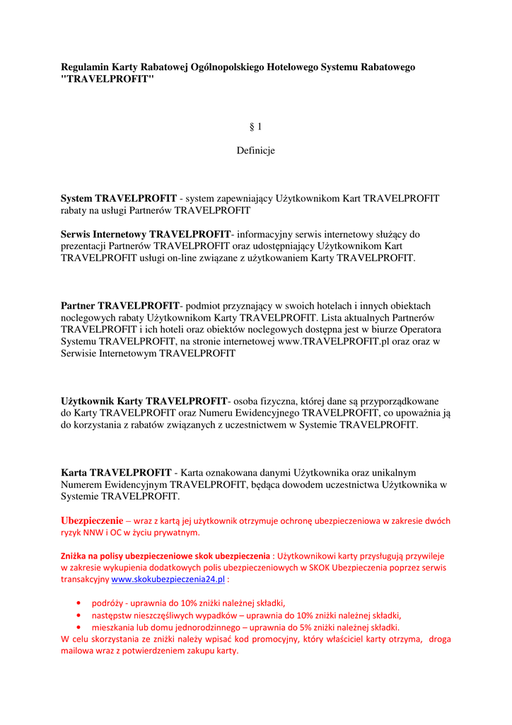 Regulamin Karty Rabatowej Ogólnopolskiego Hotelowego Systemu Rabatowego "TRAVELPROFIT" §1 Definicje System TRAVELPROFIT - system zapewniający Użytkownikom Kart TRAVELPROFIT rabaty na usługi Partnerów TRAVELPROFIT Serwis Internetowy TRAVELPROFIT- informacyjny serwis internetowy służący do prezentacji Partnerów TRAVELPROFIT oraz udostępniający Użytkownikom Kart TRAVELPROFIT usługi on-line związane z użytkowaniem Karty TRAVELPROFIT. Partner TRAVELPROFIT- podmiot przyznający w swoich hotelach i innych obiektach noclegowych rabaty Użytkownikom Karty TRAVELPROFIT. Lista aktualnych Partnerów TRAVELPROFIT i ich hoteli oraz obiektów noclegowych dostępna jest w biurze Operatora Systemu TRAVELPROFIT, na stronie internetowej www.TRAVELPROFIT.pl oraz oraz w Serwisie Internetowym TRAVELPROFIT Użytkownik Karty TRAVELPROFIT- osoba fizyczna, której dane są przyporządkowane do Karty TRAVELPROFIT oraz Numeru Ewidencyjnego TRAVELPROFIT, co upoważnia ją do korzystania z rabatów związanych z uczestnictwem w Systemie TRAVELPROFIT. Karta TRAVELPROFIT - Karta oznakowana danymi Użytkownika oraz unikalnym Numerem Ewidencyjnym TRAVELPROFIT, będąca dowodem uczestnictwa Użytkownika w Systemie TRAVELPROFIT. Ubezpieczenie – wraz z kartą jej użytkownik otrzymuje ochronę ubezpieczeniowa w zakresie dwóch ryzyk NNW i OC w życiu prywatnym. Zniżka na polisy ubezpieczeniowe skok ubezpieczenia : Użytkownikowi karty przysługują przywileje w zakresie wykupienia dodatkowych polis ubezpieczeniowych w SKOK Ubezpieczenia poprzez serwis transakcyjny www.skokubezpieczenia24.pl : • podróży - uprawnia do 10% zniżki należnej składki, • następstw nieszczęśliwych wypadków – uprawnia do 10% zniżki należnej składki, • mieszkania lub domu jednorodzinnego – uprawnia do 5% zniżki należnej składki. W celu skorzystania ze zniżki należy wpisać kod promocyjny, który właściciel karty otrzyma, droga mailowa wraz z potwierdzeniem zakupu karty. Numer Ewidencyjny TRAVELPROFIT - unikalny numer umieszczony na Karcie TRAVELPROFIT powiązany w bazie użytkowników Systemu TRAVELPROFIT z danymi Użytkownika Karty TRAVELPROFIT. Operator Systemu TRAVELPROFIT, lub Operator Serwisu Internetowego TRAVELPROFIT - Grupa Gram Sp. z o.o. z siedzibą w Warszawie (kod: 02-972) przy ul. Ks. Prymasa Augusta Hlonda 2A/8, wpisaną do rejestru przedsiębiorców Krajowego Rejestru Sądowego pod nr 0000224187, REGON 140003837, NIP 951-21-29-635, adres poczty elektronicznej: [email protected] zarządzająca systemem TRAVELPROFIT i serwisem internetowym TRAVELPROFIT, odpowiedzialna za ustalanie zasad działania systemu rabatowego, kontrolę działania systemu, promocję i sprzedaż kart rabatowych oraz obsługę serwisu internetowego TRAVELPROFIT §2 Postanowienia ogólne 1. Niniejszy Regulamin określa uprawnienia Użytkownika Karty TRAVELPROFIT, związane z uczestnictwem w Systemie TRAVELPROFIT oraz zasady korzystania z Karty TRAVELPROFIT i Serwisu Internetowego TRAVELPROFIT. 2. Niniejszy Regulamin dostępny jest w biurze Operatora Systemu TRAVELPROFIT oraz na stronie internetowej www.travelprofit.pl 3. Użytkownik Karty TRAVELPROFIT uczestniczy w Systemie TRAVELPROFIT, przez okres ważności Karty TRAVELPROFIT, nabywając Kartę TRAVELPROFIT,. 4. Przez uczestnictwo w Systemie TRAVELPROFIT Użytkownik Karty TRAVELPROFIT zobowiązuje się do uiszczenia opłaty, zgodnie z aktualnie obowiązującym cennikiem, a Operator Systemu TRAVELPROFIT zobowiązuje się, że Partnerzy TRAVELPROFIT udzielą Użytkownikowi Karty TRAVELPROFIT, w okresie ważności Karty TRAVELPROFIT, rabatu na zasadach określonych w niniejszym Regulaminie. 5. Operator Systemu TRAVELPROFIT nie pośredniczy przy zawieraniu umów pomiędzy Użytkownikiem Karty TRAVELPROFIT i Pratnerami TRAVELPROFIT. Korzystanie z usług oferowanych przez Partnerów TRAVELPROFIT odbywa się na podstawie umów zawieranych bezpośrednio pomiędzy Użytkownikiem Karty TRAVELPROFIT i Partnerem TRAVELPROFIT. §3 Informacje ogólne o Karcie 1. Każda Karta TRAVELPROFIT jest imienna, posiada Numer Ewidencyjny TRAVELPROFIT oraz datę ważności. 2. Karta TRAVELPROFIT jest ważna przez 12 miesięcy od momentu wystawienia i upoważnia do korzystania z niej dowolną ilość razy. 3. Warunkiem otrzymania Karty TRAVELPROFIT jest uiszczenie opłaty za Kartę zgodnie z aktualnie obowiązującym cennikiem TRAVELPROFIT. 4. Aktualny cennik jest dostępny na stronie, w Serwisie Internetowym TRAVELPROFIT oraz w biurze Operatora Systemu TRAVELPROFIT. 5. Opłata obejmuje wydanie i wysyłkę Karty TRAVELPROFIT na wskazany przez Użytkownika Karty TRAVELPROFIT adres na terytorium Rzeczypospolitej Polskiej. Oraz ubezpieczenie w zakresie dwóch ryzyk NNW i OC. Ochrona ubezpieczeniowa udzielana jest każdemy Użytkownikowi karty w okresie jej ważności tj. Przez 12 miesięcy od daty zakupu karty, pod warunkiem dokonania zapłaty, o której mowa w pkt 3. § 3. 6. Użytkownik Karty TRAVELPROFIT jest uprawniony do przedłużenia ważności Karty TRAVELPROFIT na kolejny okres 12 miesięcy lub jego wielokrotność, dokonując przed upływem okresu ważności Karty TRAVELPROFIT opłaty zgodnie z aktualnym cennikiem TRAVELPROFIT. 7. Po upływie okresu ważności Karty TRAVELPROFIT Użytkownik Karty TRAVELPROFIT jest uprawniony do ponownej aktywacji posiadanej Karty TRAVELPROFIT dokonując opłaty zgodnie z aktualnym cennikiem TRAVELPROFIT. 8. Karta TRAVELPROFIT jest aktywna od chwili dokonania opłaty i rejestracji w Serwisie Internetowym TRAVELPROFIT. 9. Rejestracja w Serwisie Internetowym TRAVELPROFIT odbywa się poprzez wejście na konto Użytkownika Karty TRAVELPROFIT z linku przesłanego na wskazany w formularzu adres e-mail. 10. Operator Systemu TRAVELPROFIT ma prawo unieważnienia Karty TRAVELPROFIT w przypadku, gdy jest ona wykorzystywana w sposób sprzeczny z postanowieniami Regulaminu. W przypadku zastrzeżeń oraz uzasadnionych wątpliwości, co do autentyczności Karty TRAVELPR