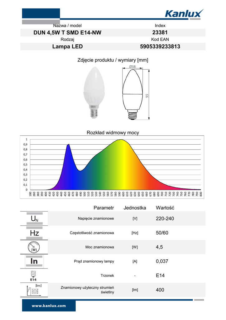 Nazwa / model Index DUN 4,5W T SMD E14-NW 23381 Rodzaj Kod EAN Lampa LED 5905339233813 Zdjęcie produktu / wymiary [mm] Rozkład widmowy mocy 1 0,9 0,8 0,7 0,6 0,5 0,4 0,3 0,2 0,1 180 280 380 390 400 410 420 430 440 450 460 470 480 490 500 510 520 530 540 550 560 570 580 590 600 610 620 630 640 650 660 670 680 690 700 710 720 730 740 750 760 770 780 790 800 0 Jednostka Wartość Napięcie znamionowe [V] 220-240 Częstotliwość znamionowa [Hz] 50/60 Moc znamionowa [W] 4,5 Prąd znamionowy lampy [A] 0,037 Parametr Trzonek Znamionowy użyteczny strumień świetlny - E14 [lm] 400 2000K Deklaracja równoważności dotycząca mocy [W] 4,5-35 Temperatura barwowa [K] 4000 4000K - ≤6 Liczba cykli włącz / wyłącz - ≥15000 Nominalny kąt promieniowania [°] 230 Nominalny użyteczny strumień świetlny [lm] - Znamionowa trwałość lampy [h] 20000 - ≥0,5 Współczynnik zachowania strumienia świetlnego na zakończenie nominalnego okresu trwałości [%] ≥65 Czas zapłonu [s] <0,5 - ≥80 Oddawanie barw Znamionowa światłość szczytowa [cd] Znamionowy kąt promieniowania [°] 230 [mg] brak Zawartość rtęci w lampie 6000h LSF 6000h 8000K Jednolitość barw Współczynnik mocy lampy LLMF 5500K - Czas nagrzewania się lampy do 60% pełnego strumienia świetlnego [s] Współczynnik zachowania strumienia świetlnego po okresie 6000h - ≥80% Czas nagrzewania się lampy do 95% - <2 s Współczynnik trwałości lampy po okresie 6000h - ≥90% Wskaźnik przedwczesnego końca eksploatacji lampy - <5% po 1000h Lampa jest przeznaczona do ściemniania - NIE Lampa jest przeznaczona do oświetlenia akcentowego - - pomijalny Etykieta efektywności energetycznej Zabronione jest używanie dokumentu niezgodnie z jego przeznaczeniem. Kanlux SA zastrzega sobie możliwość dokonywana zmian bez podania przyczyny. * wyniki uzyskane podczas badania konkretnego egzemplarza